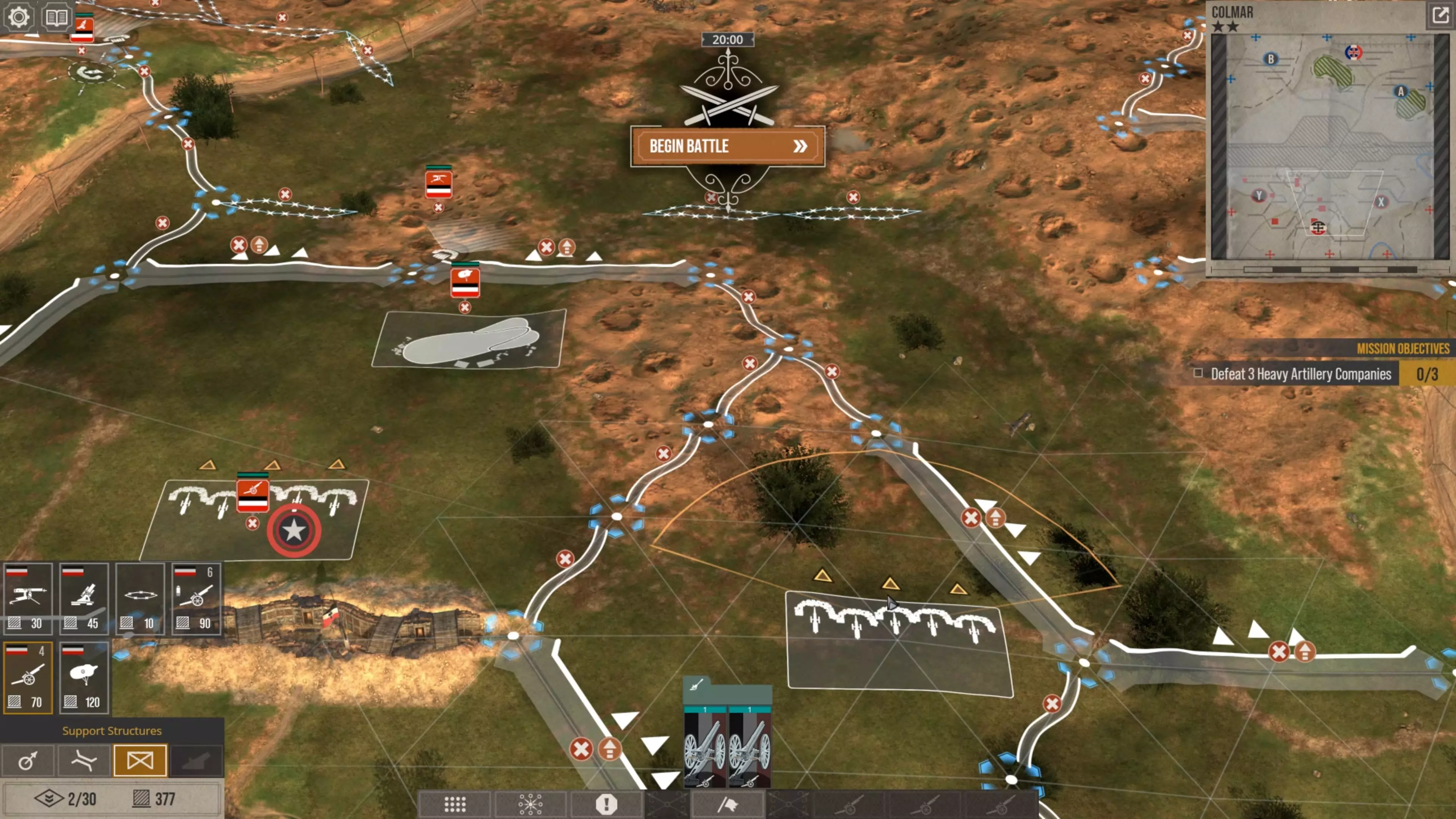 精锐部队将安全地留在后方或隐蔽的指挥战壕中,不会被发现或轰炸。他们将作为生力军执行反击任务。现在来看看在这场战斗的首个防御场景中,这些炮位如何抵御敌人的进攻。