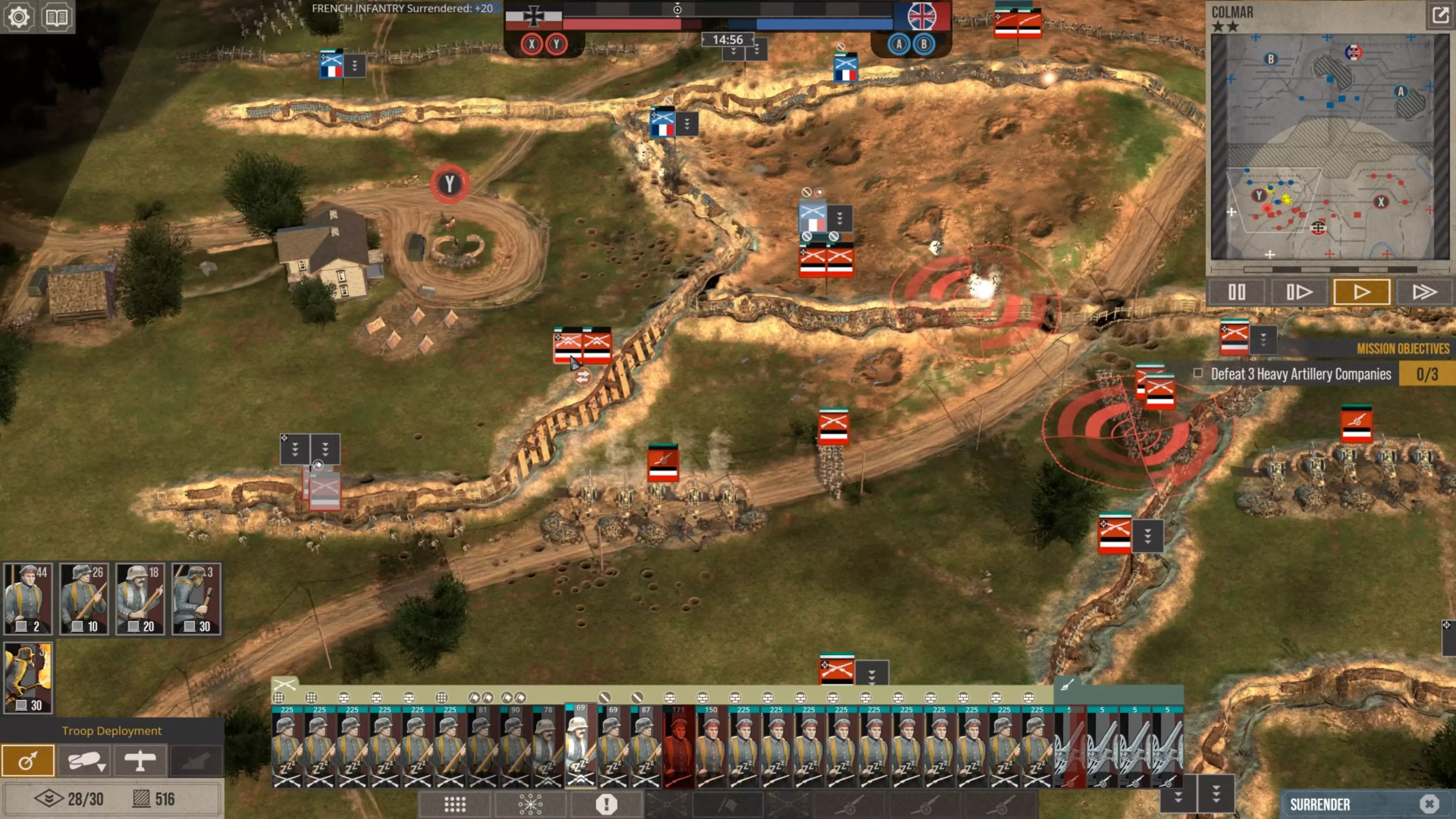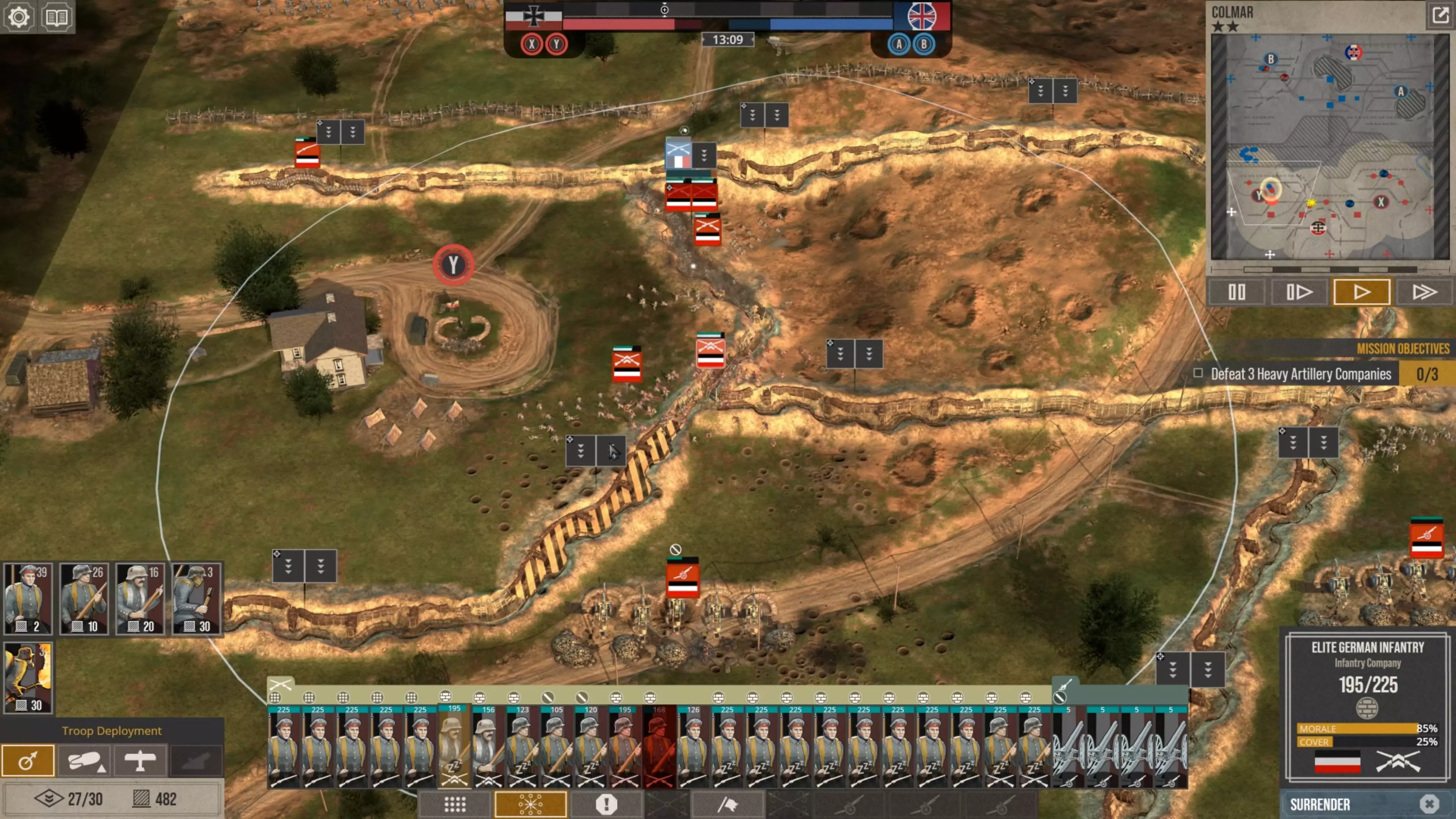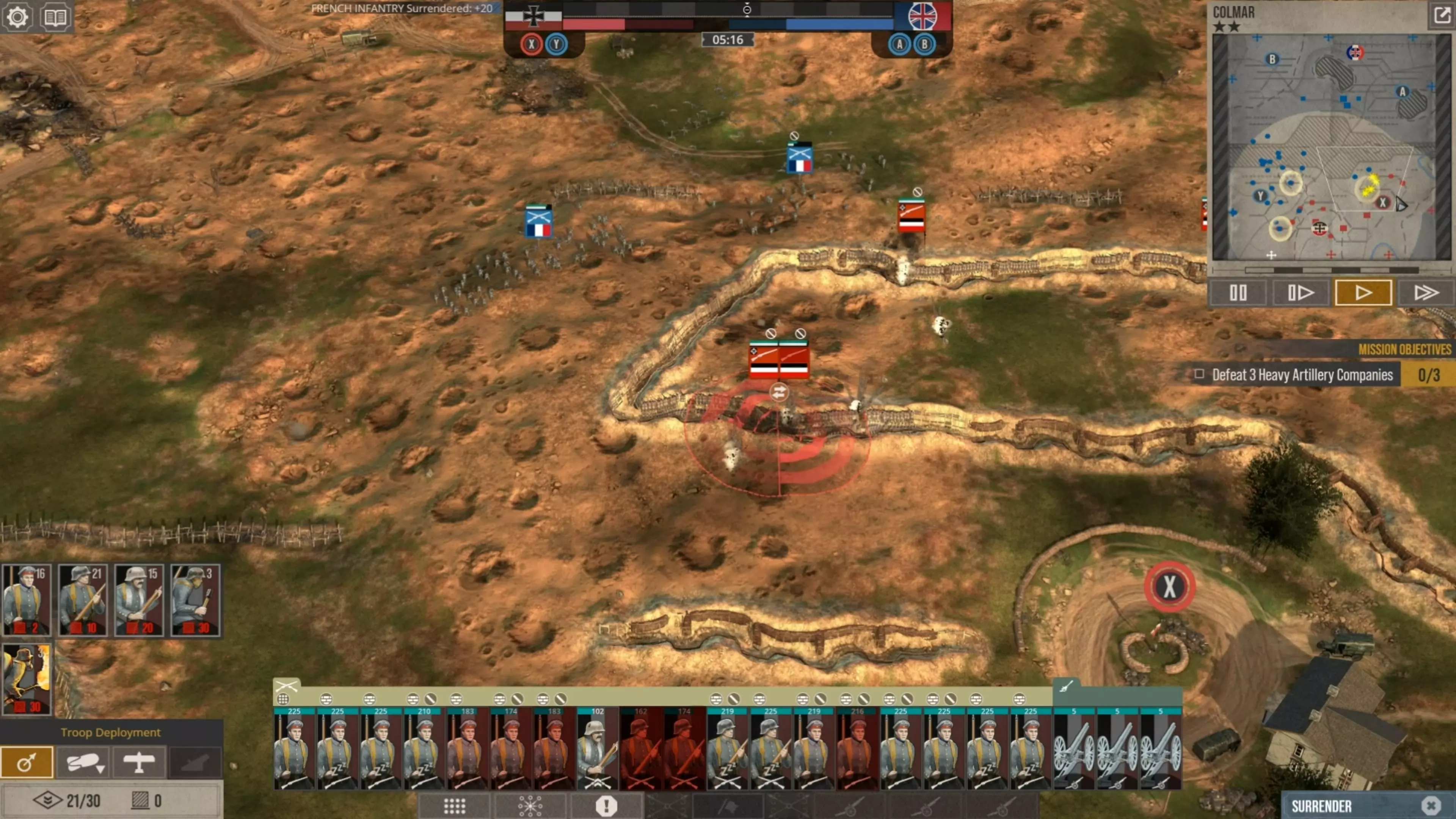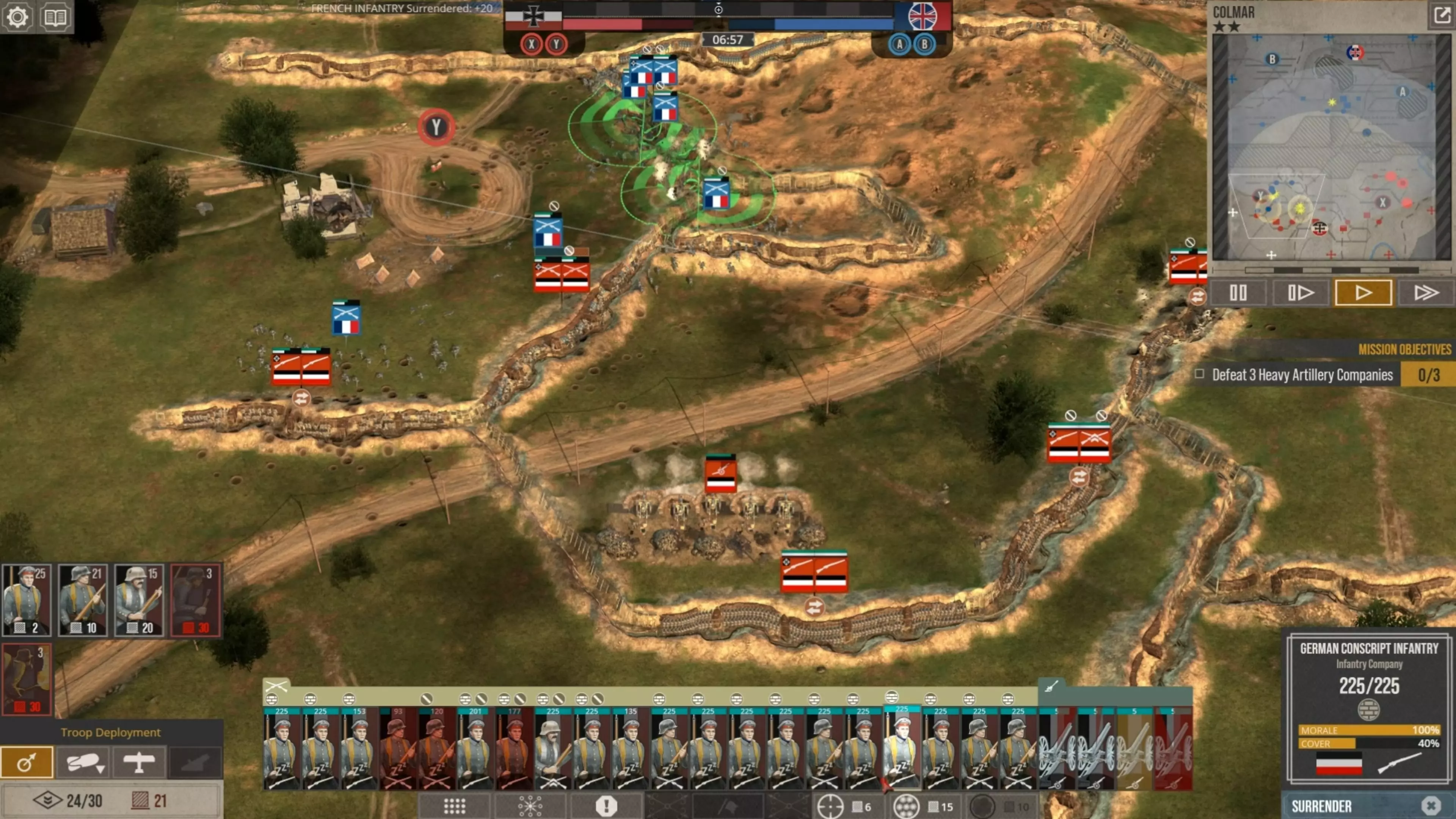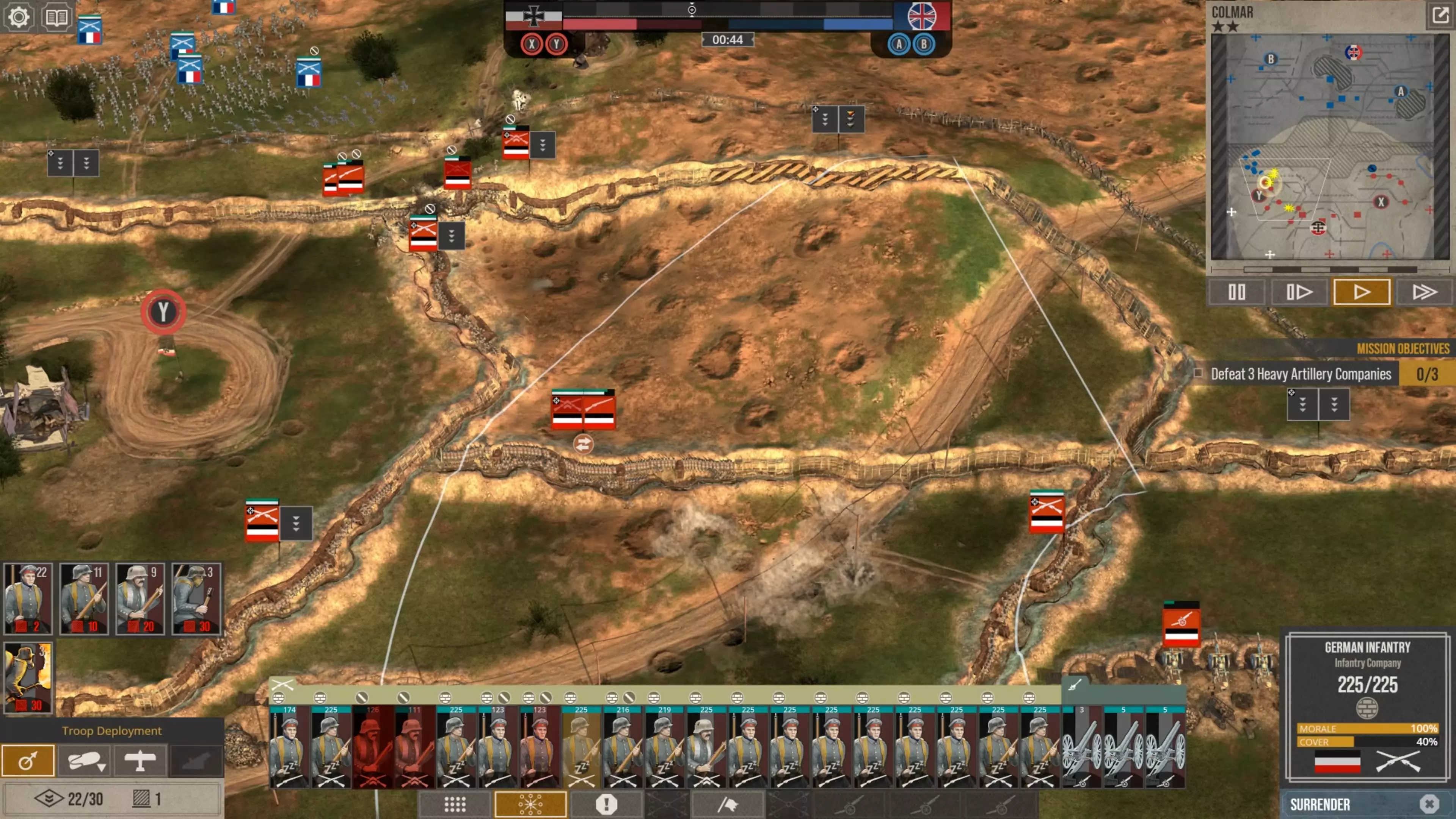 在这场战斗中,我没怎么使用时间控制功能,因为我喜欢快节奏的战斗。但我强烈建议所有新玩家在移动单位、观察战场、下令新的炮火攻击,或是在部队投降或被歼灭前将其撤回时,一定要频繁暂停游戏。这不是一款简单的游戏,要熟练掌握所有动态要素需要花些时间。 现在你可以看到,当敌人的进攻在我的第二道防线停滞时,我的援军能够发起反击,将剩余的敌军单位从Y目标的战壕中清除,而这一切都发生在敌方援军抵达之前。