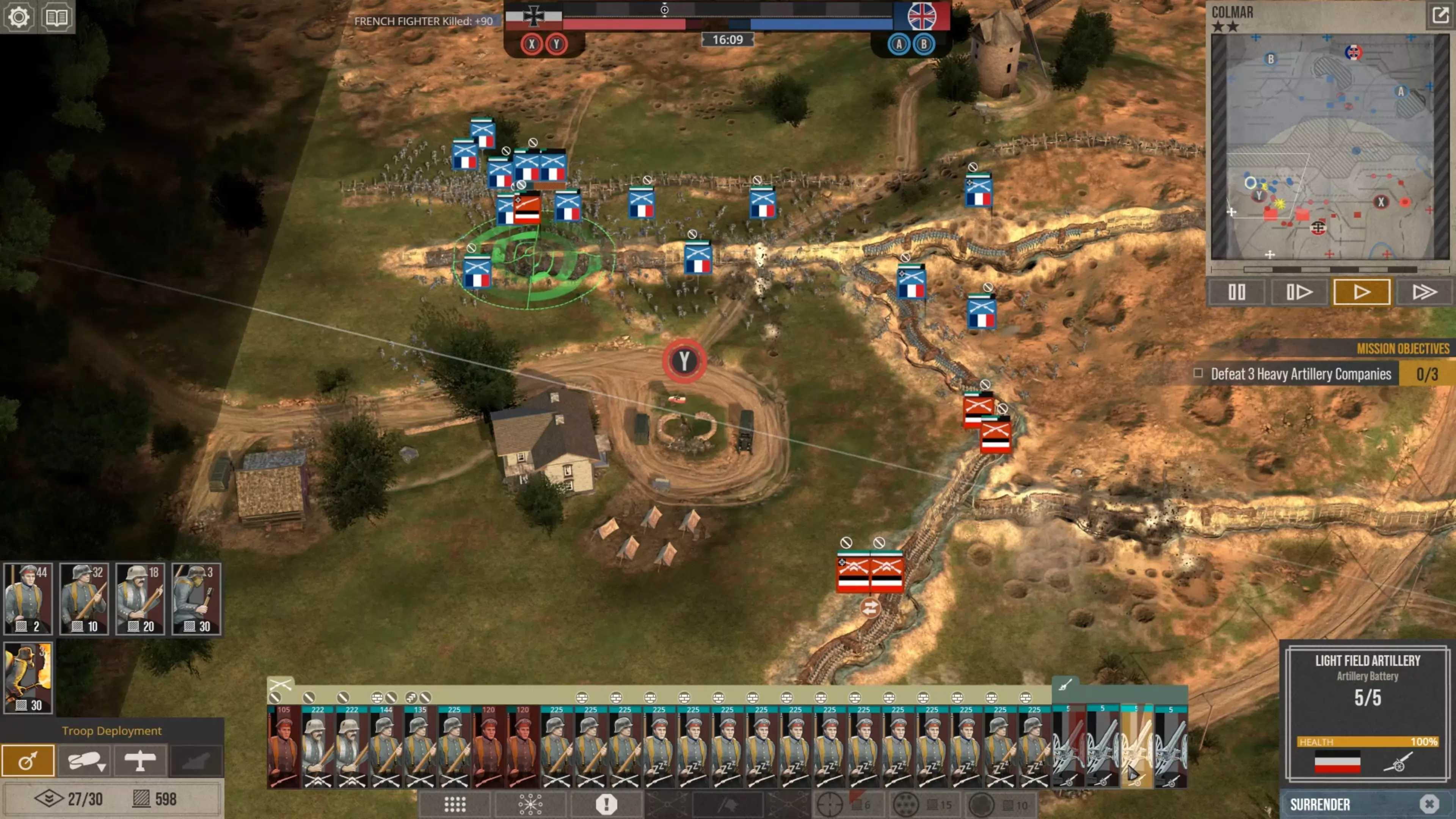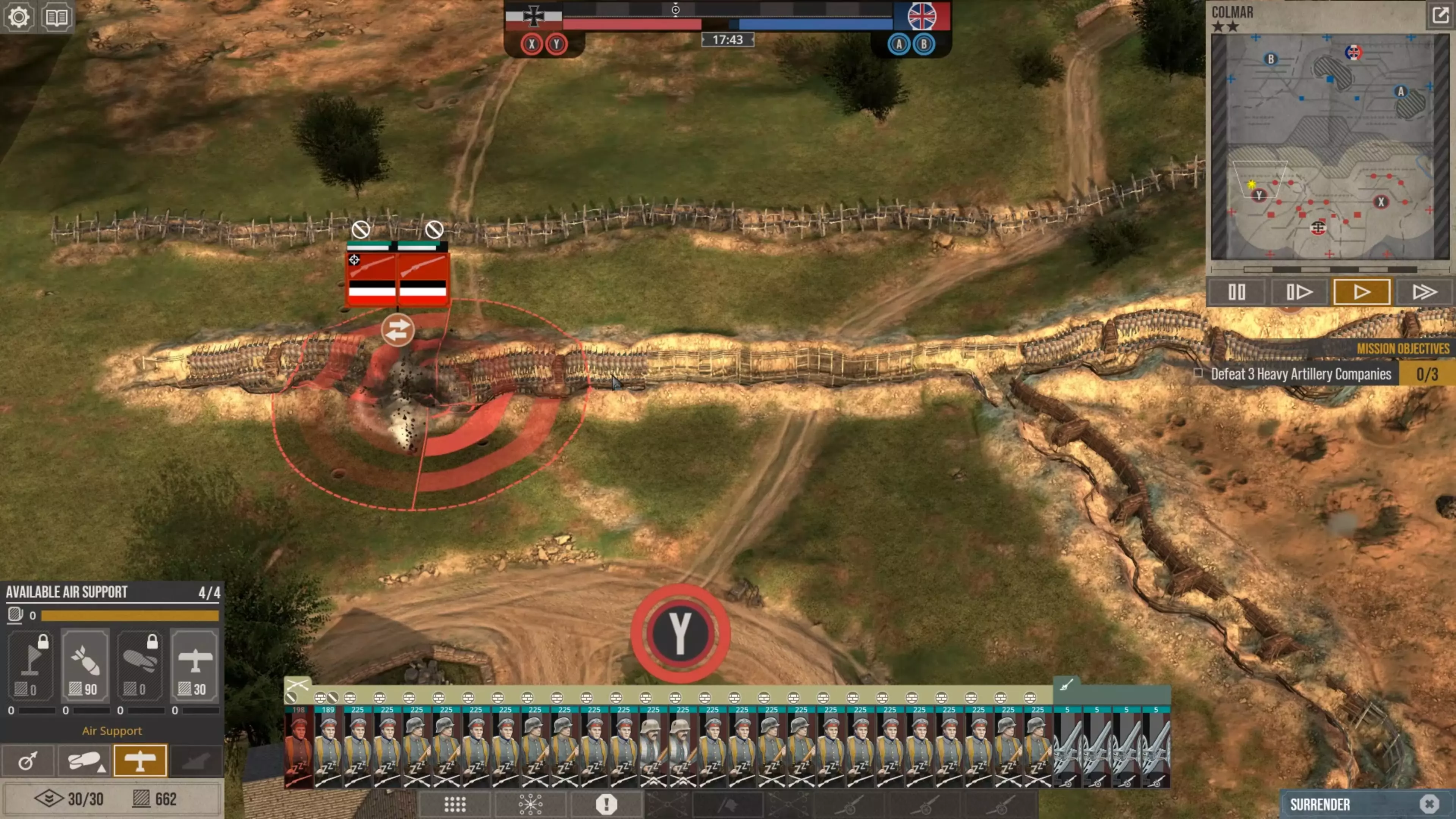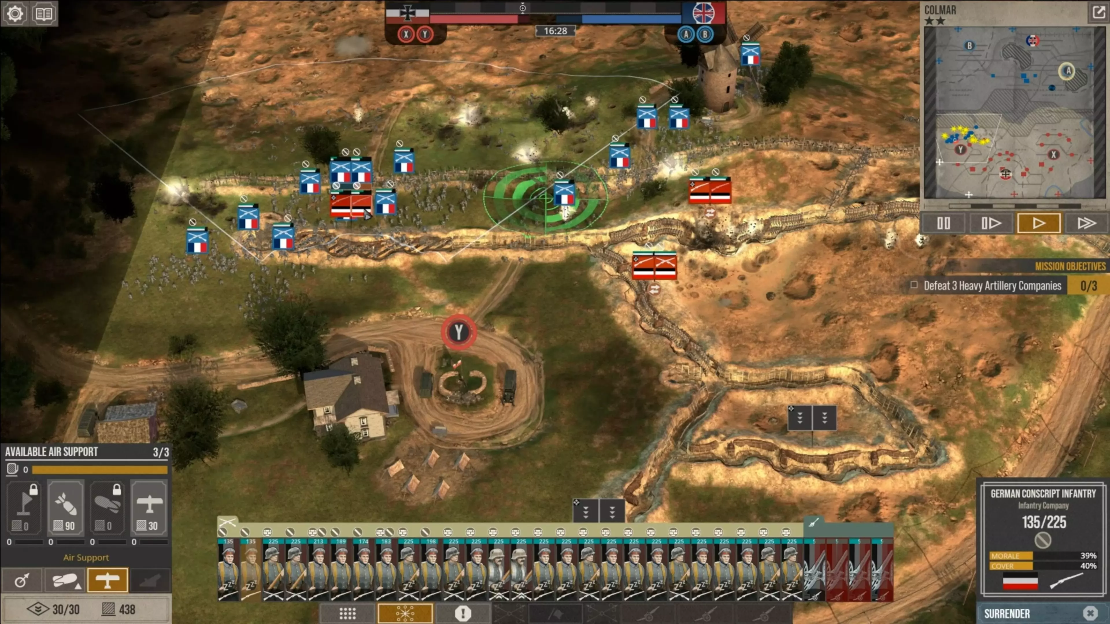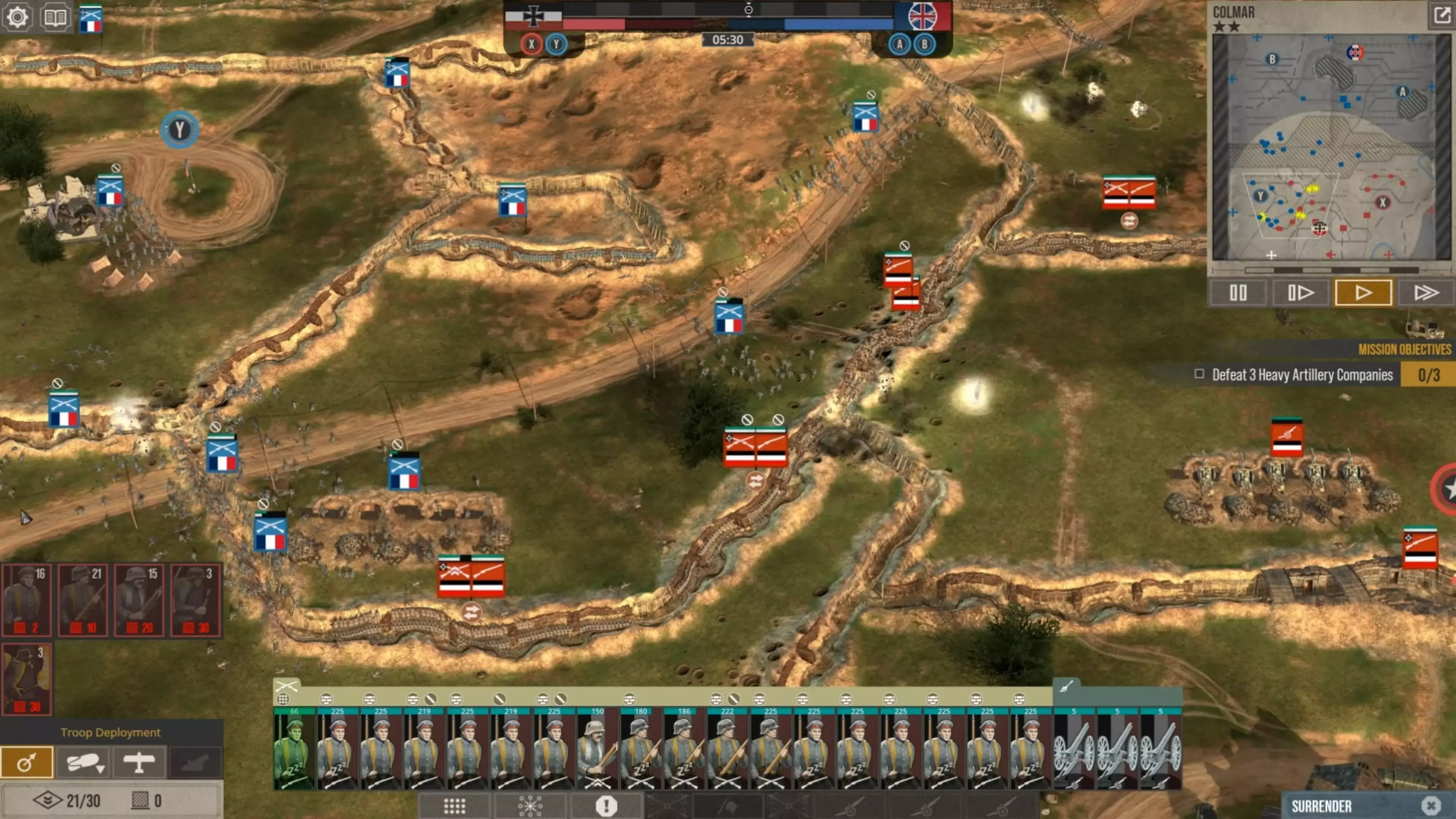 在这场战斗中,我没怎么使用时间控制功能,因为我喜欢快节奏的战斗。但我强烈建议所有新玩家在移动单位、观察战场、下令新的炮火攻击,或是在部队投降或被歼灭前将其撤回时,一定要频繁暂停游戏。这不是一款简单的游戏,要熟练掌握所有动态要素需要花些时间。 现在你可以看到,当敌人的进攻在我的第二道防线停滞时,我的援军能够发起反击,将剩余的敌军单位从Y目标的战壕中清除,而这一切都发生在敌方援军抵达之前。