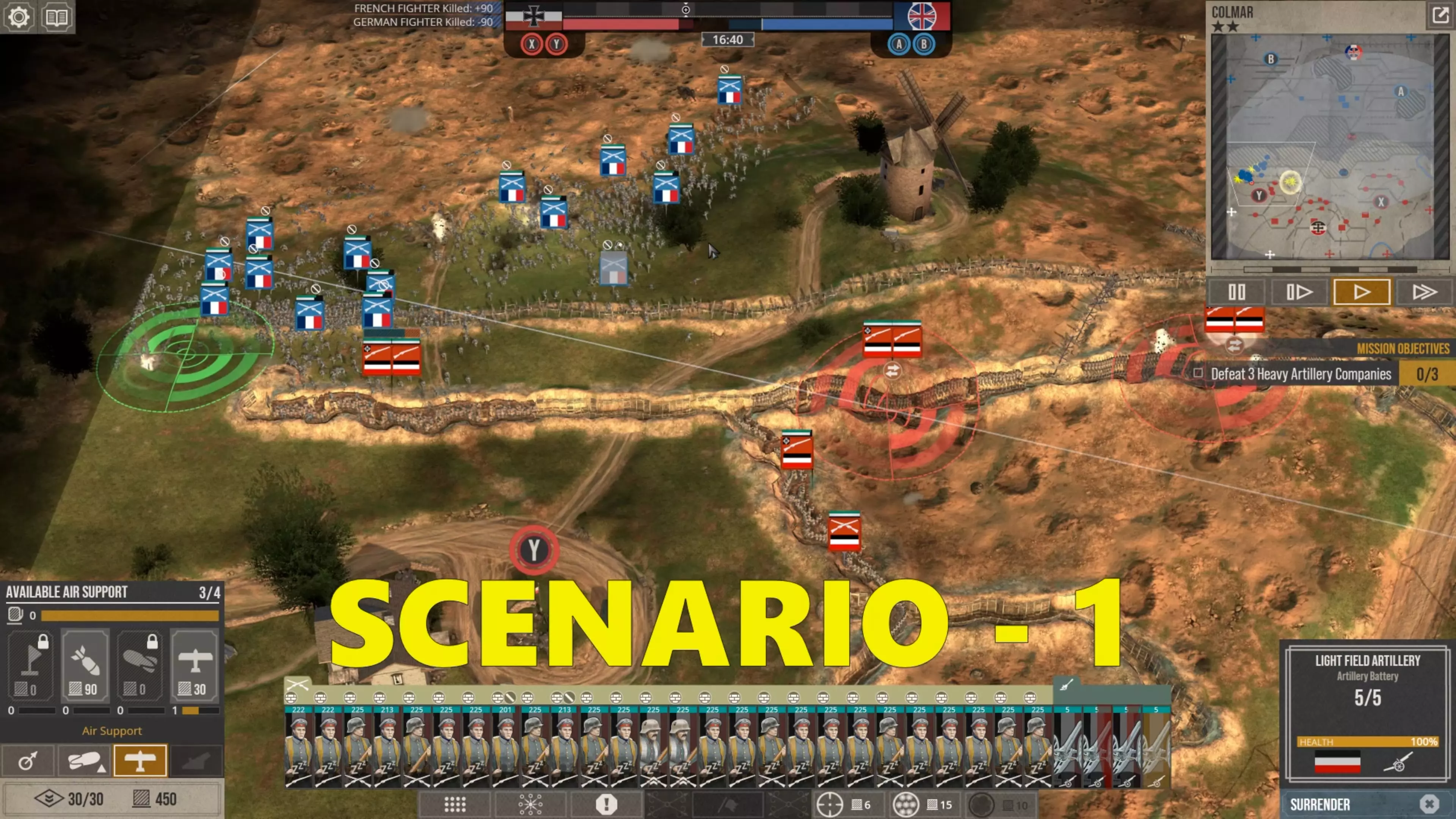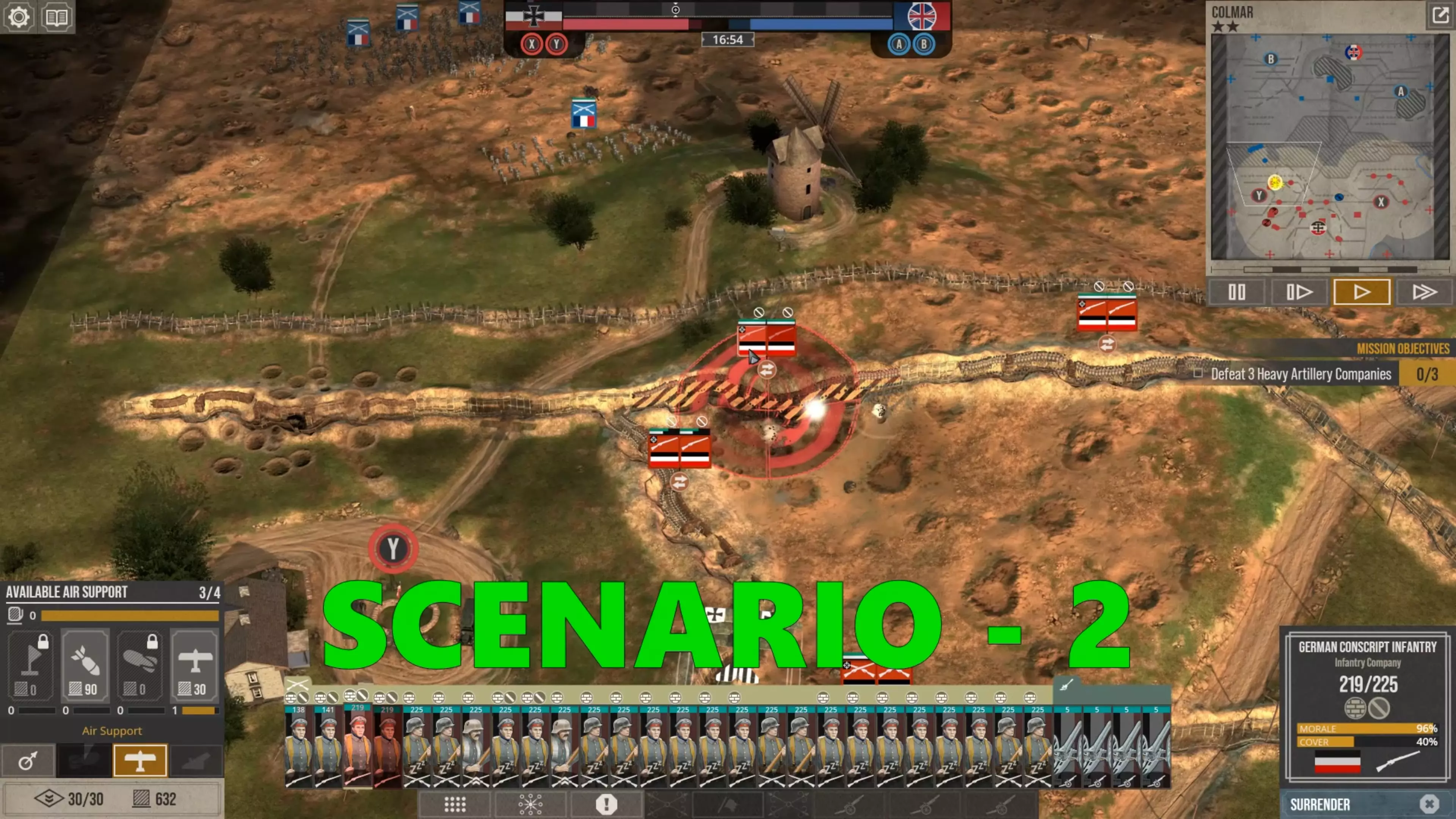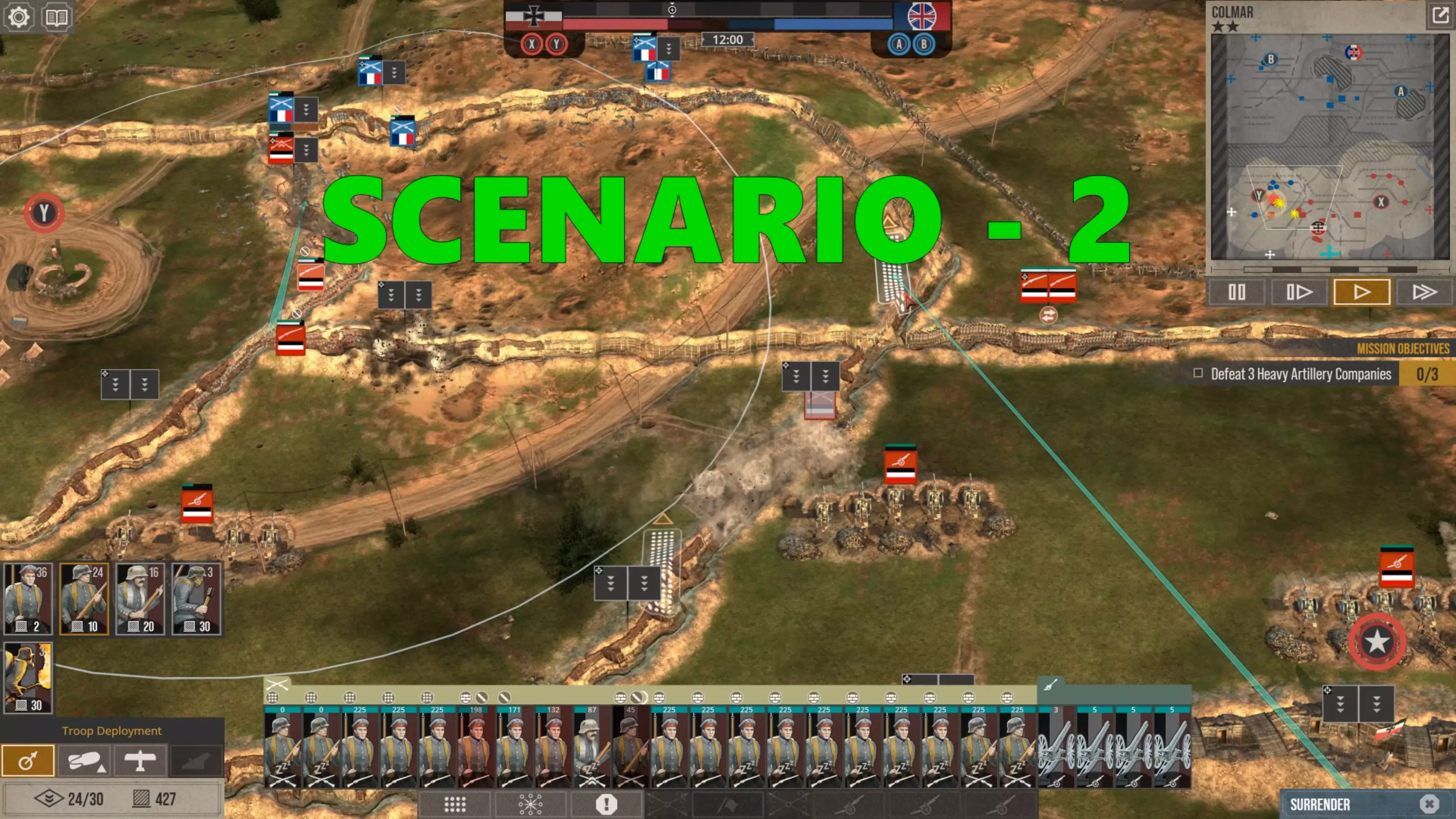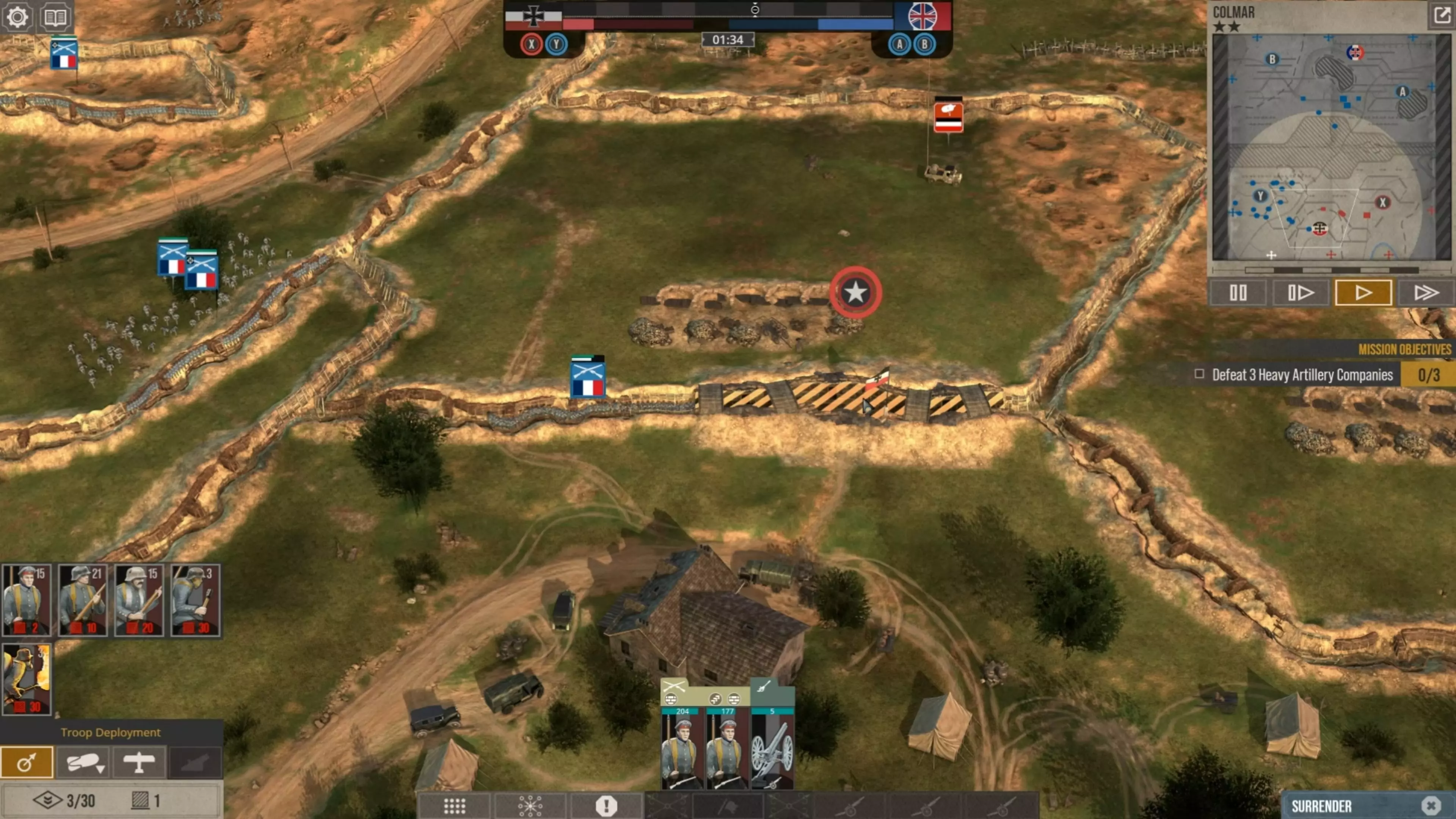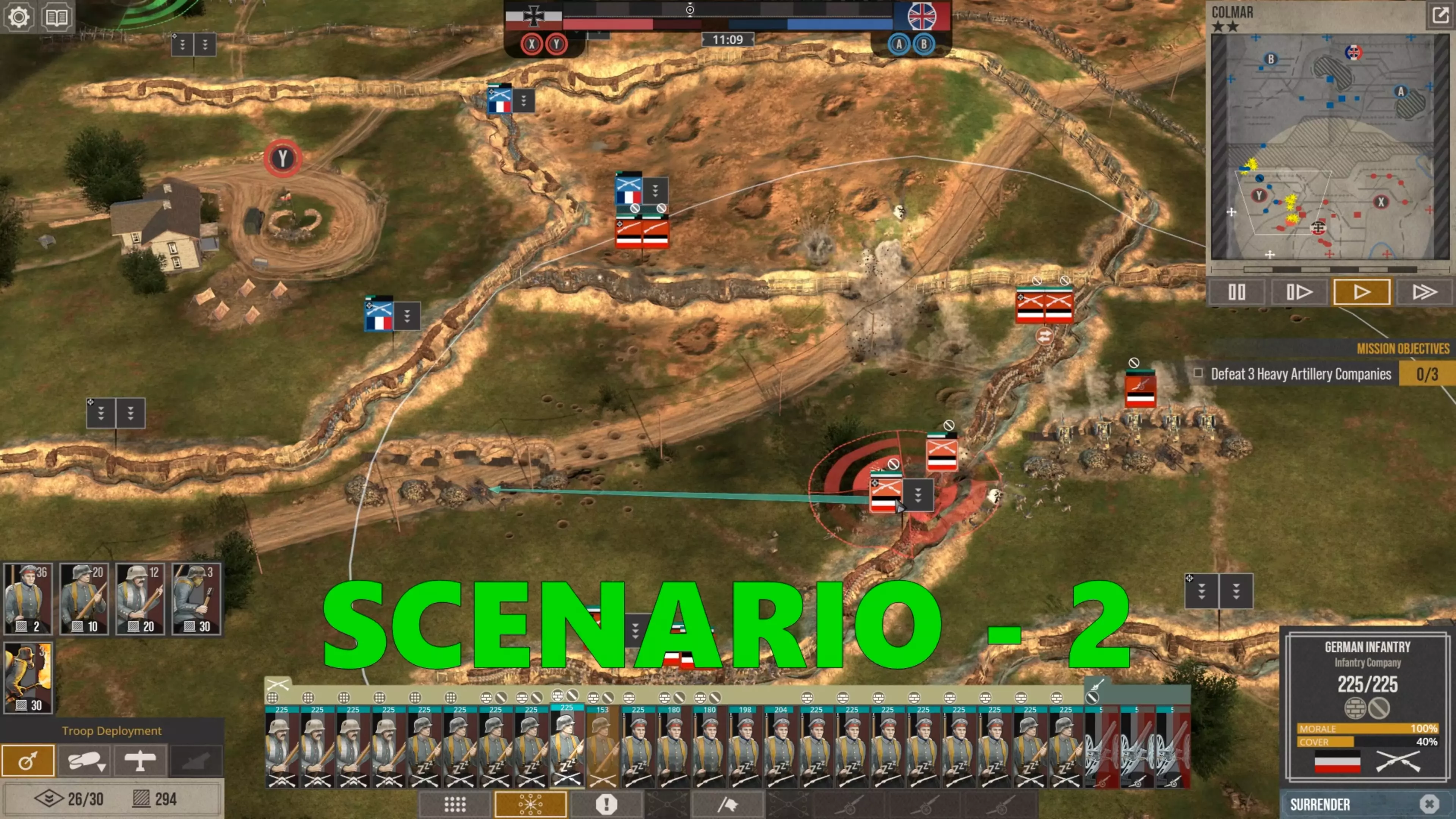 在这场战斗中,我没怎么使用时间控制功能,因为我喜欢快节奏的战斗。但我强烈建议所有新玩家在移动单位、观察战场、下令新的炮火攻击,或是在部队投降或被歼灭前将其撤回时,一定要频繁暂停游戏。这不是一款简单的游戏,要熟练掌握所有动态要素需要花些时间。 现在你可以看到,当敌人的进攻在我的第二道防线停滞时,我的援军能够发起反击,将剩余的敌军单位从Y目标的战壕中清除,而这一切都发生在敌方援军抵达之前。