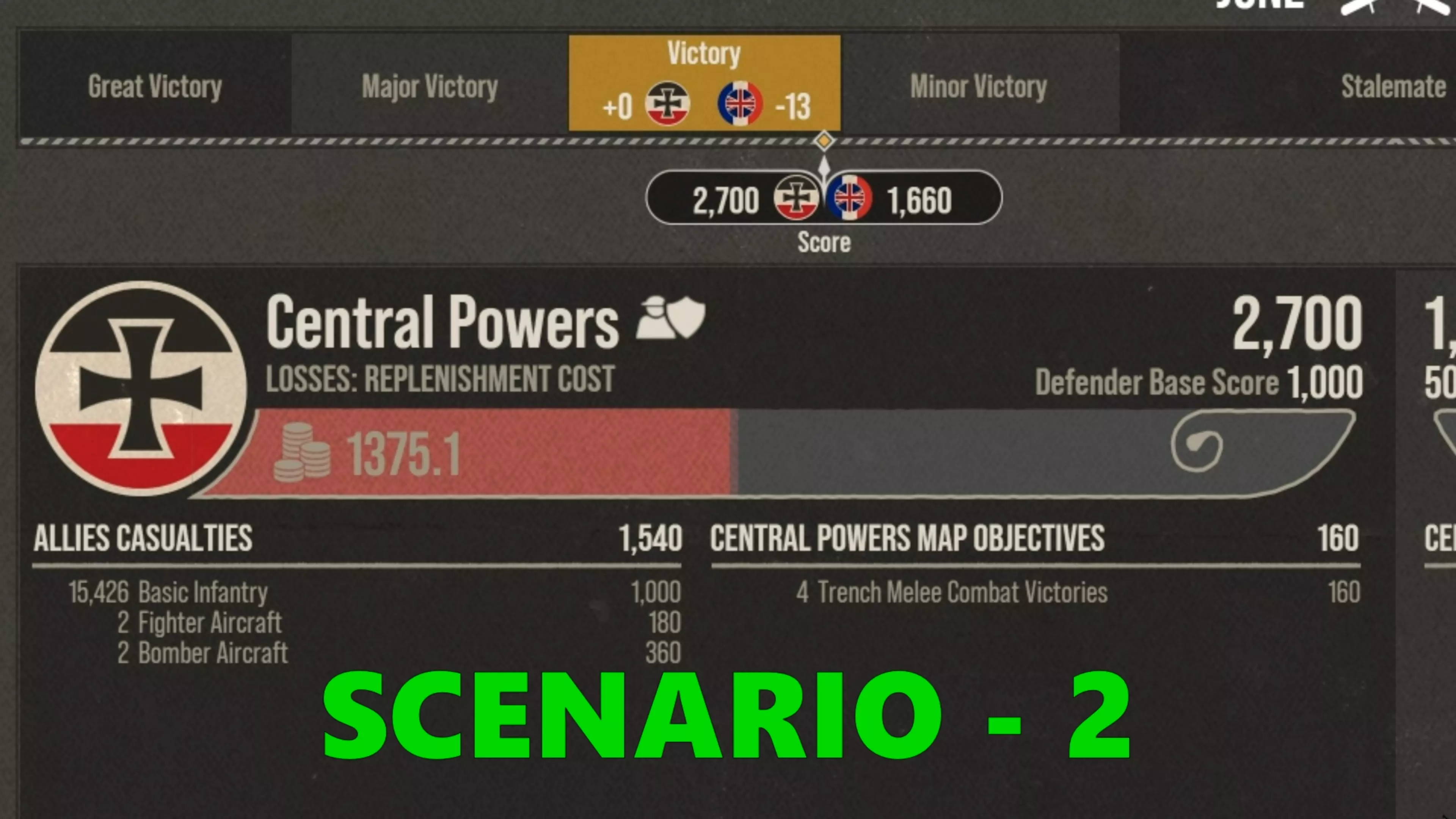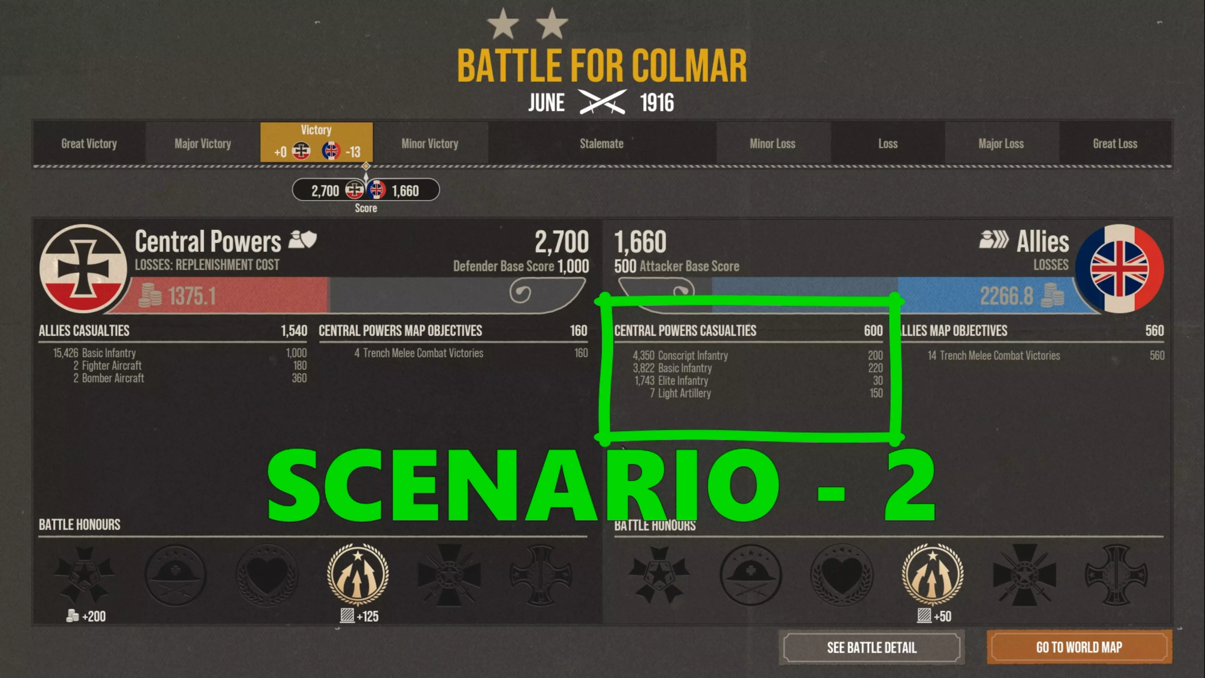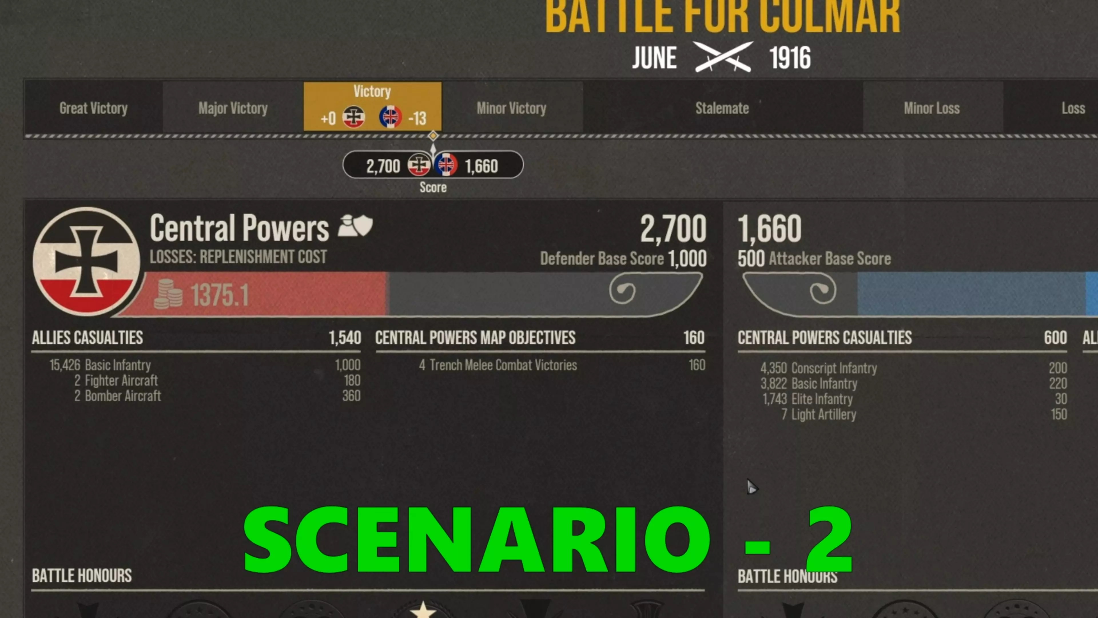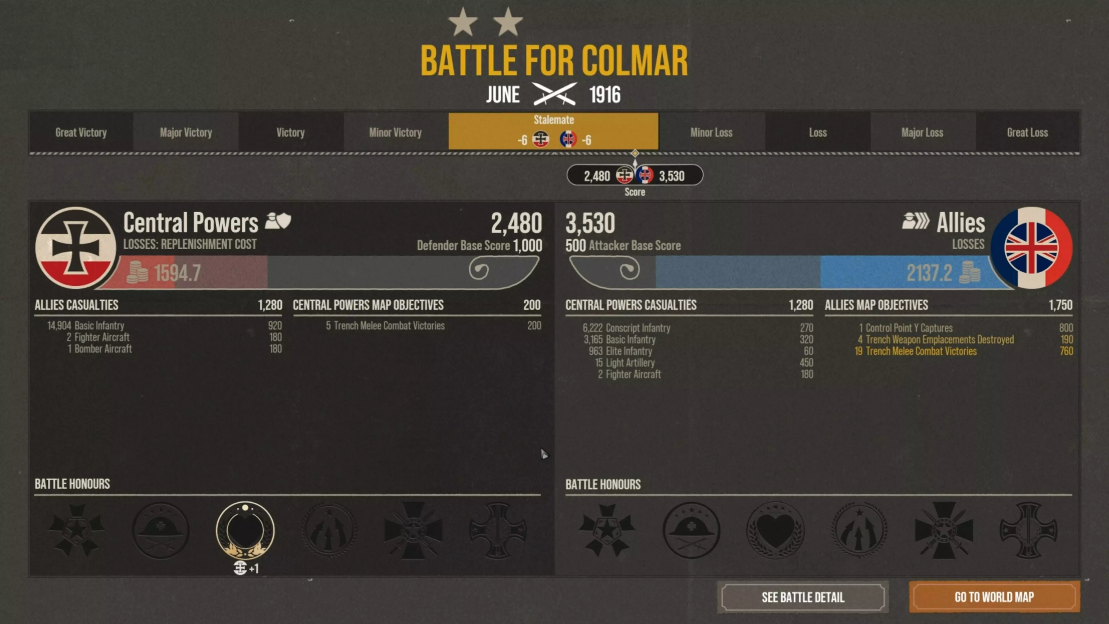 这就是我在这里化险为夷的原因。你可以看到最终数据,我歼灭了大约15000名敌军士兵。但敌人凭借所有的战壕近战胜利、摧毁我的炮兵以及夺取那个Y目标获得了大量分数。因此结果是僵局。