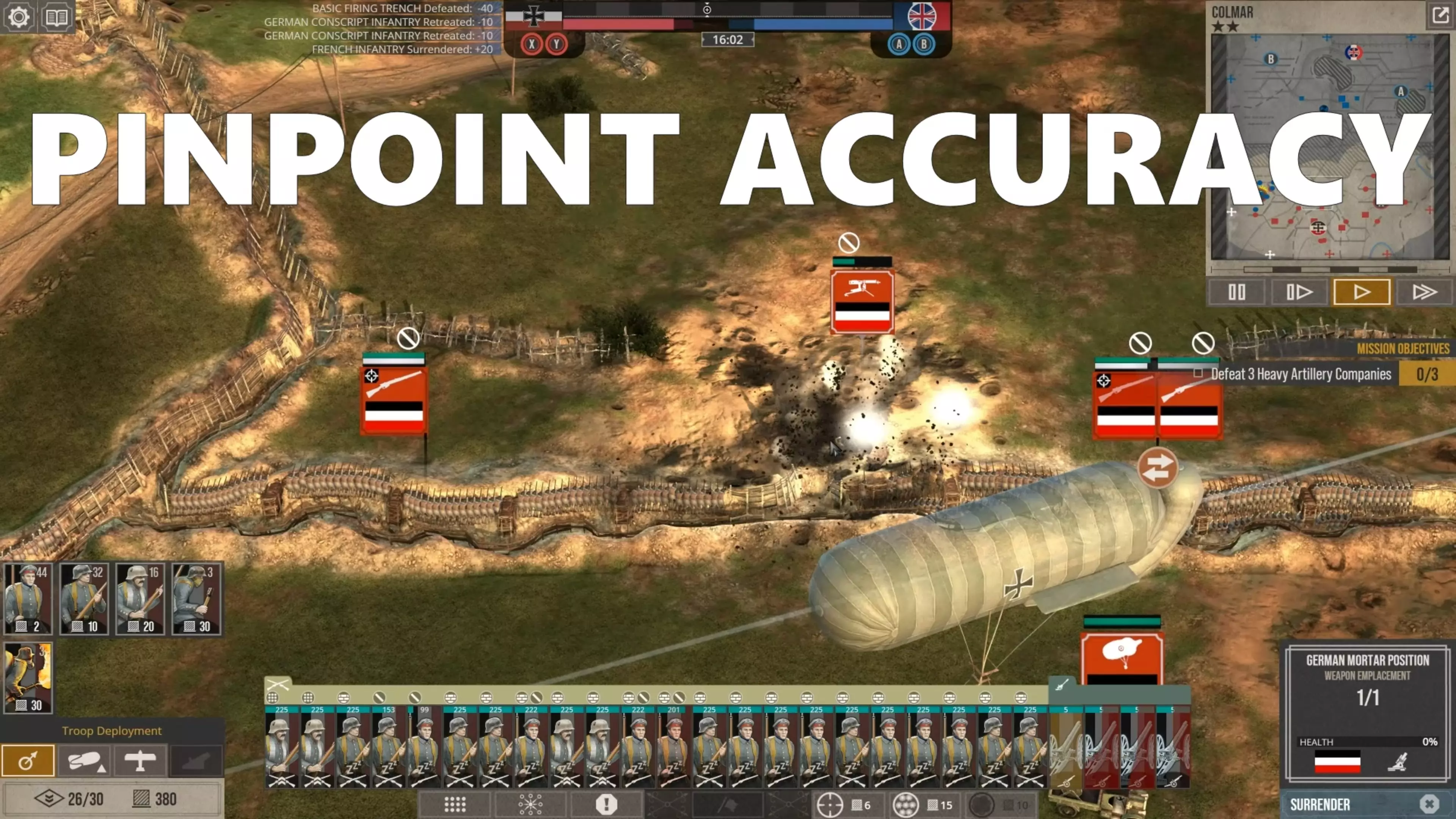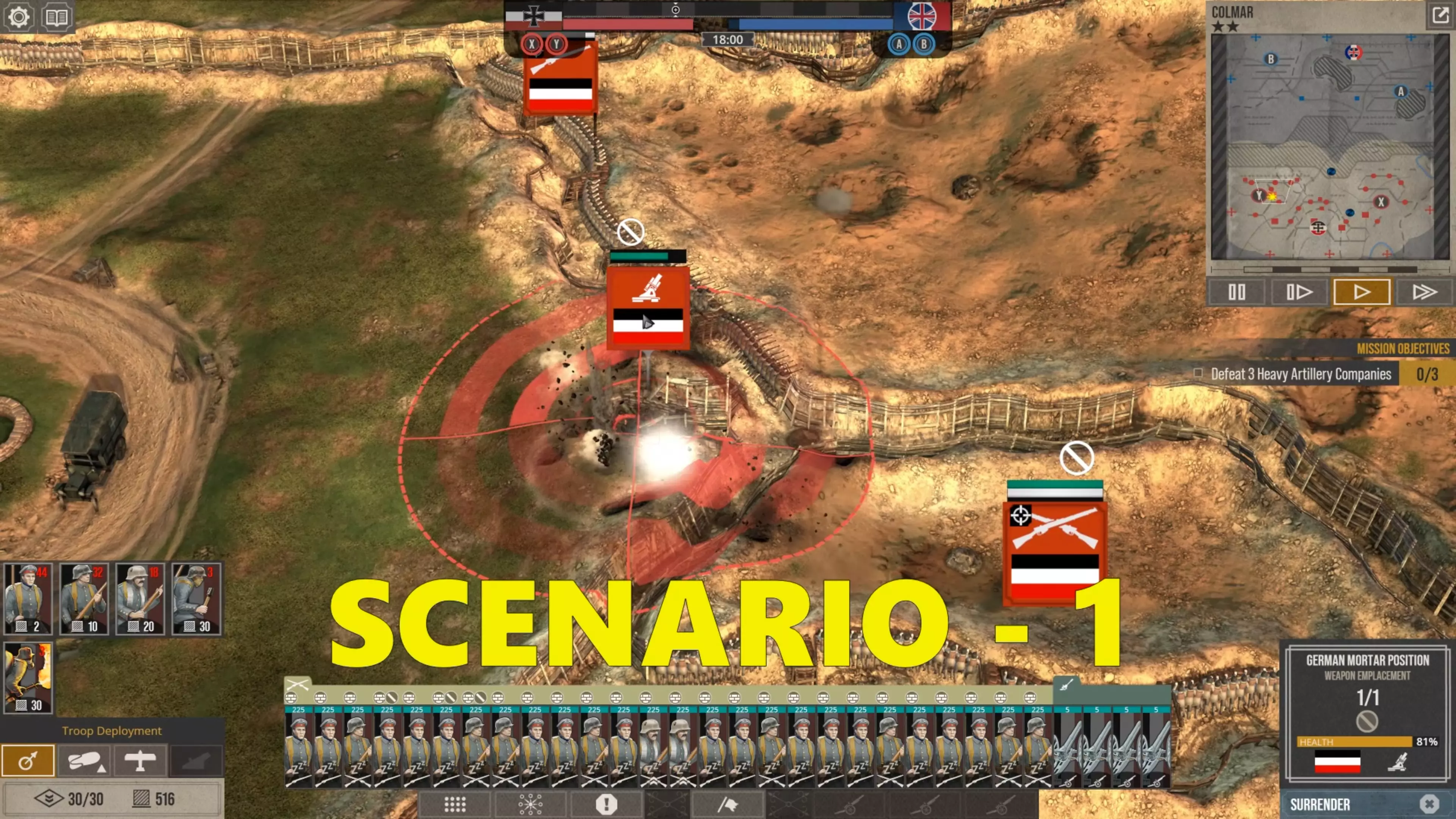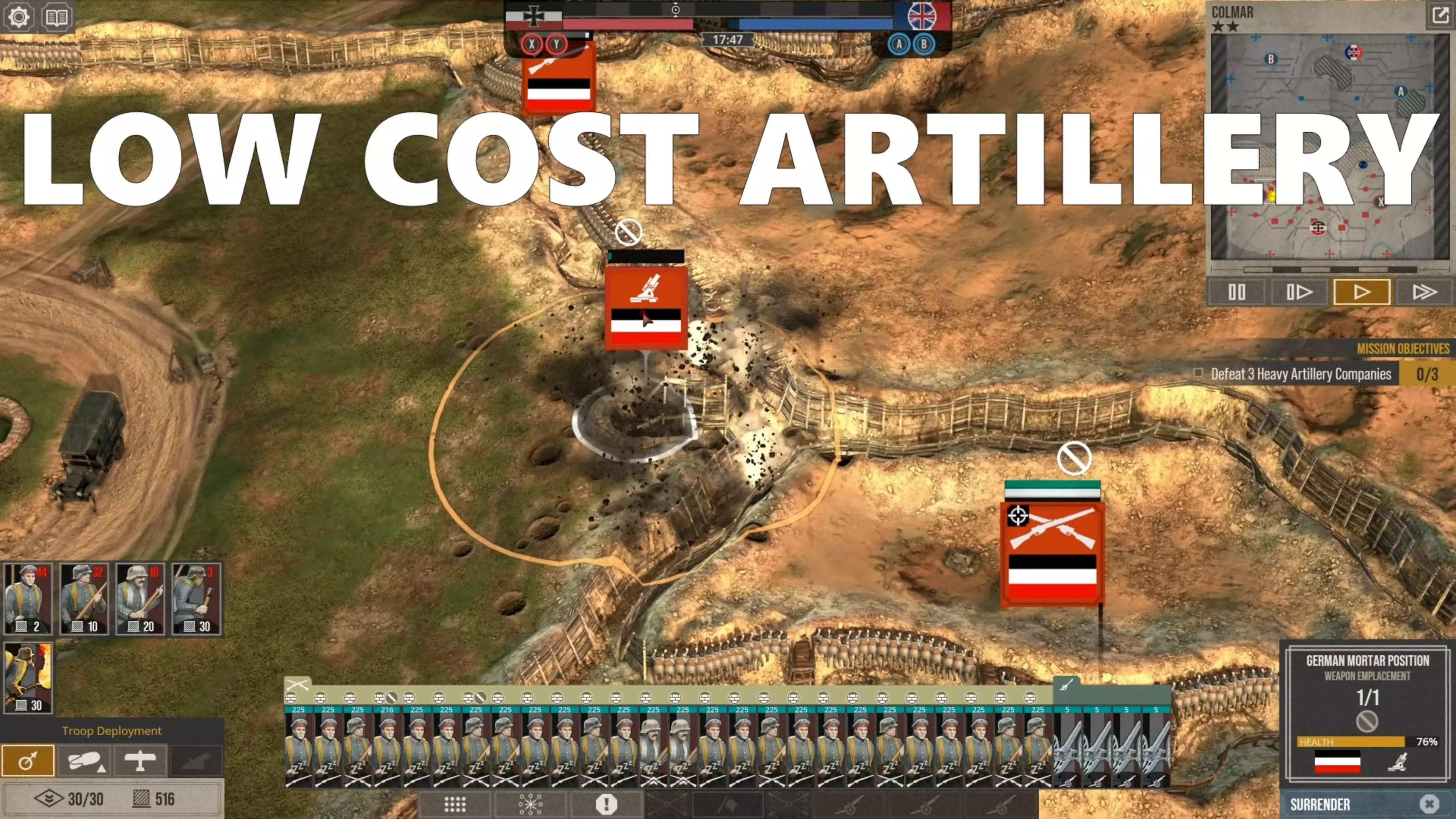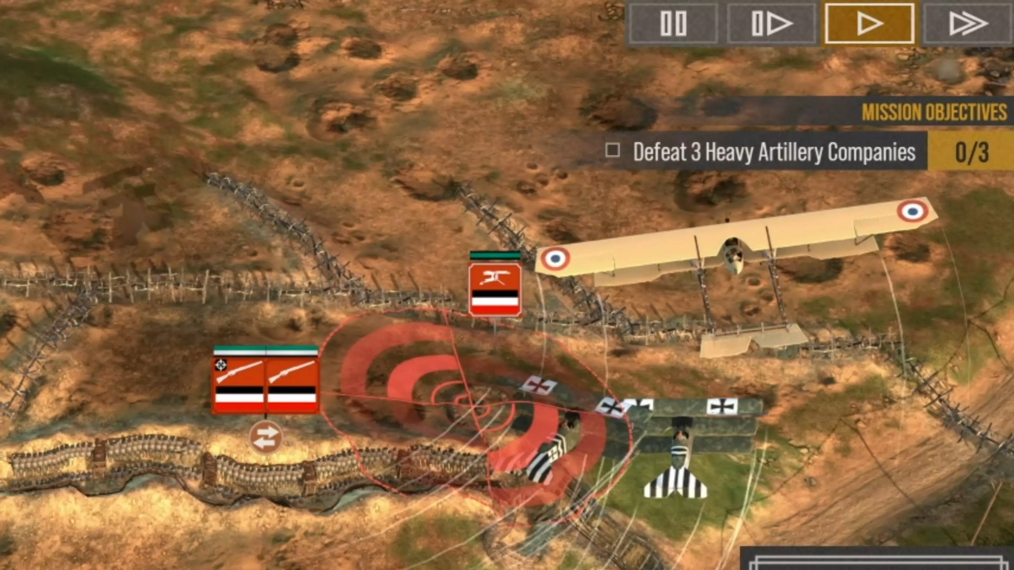 部队撤退后,你可以用援军替换他们。由于你的目标正遭受攻击,这些援军的抵达速度会比敌方援军快得多,因为敌方援军必须从地图另一侧的目标出生点长途跋涉。这就是敌方攻击会一波波袭来的原因。 再次强调,正如我之前所解释的,调动部队时要留意援军以及战壕后排,防范敌方炮火,因为这些位置肯定会遭到炮击。