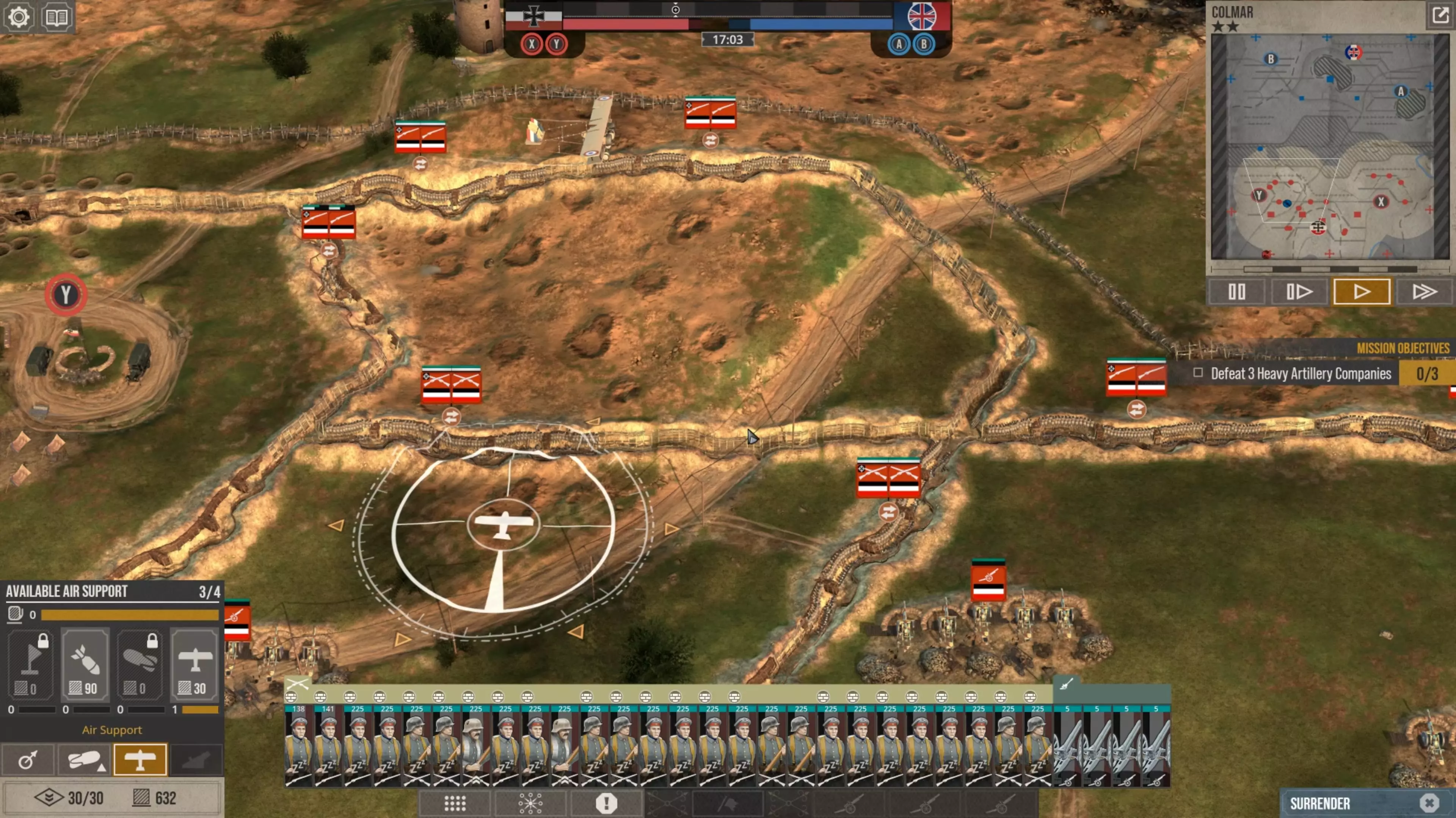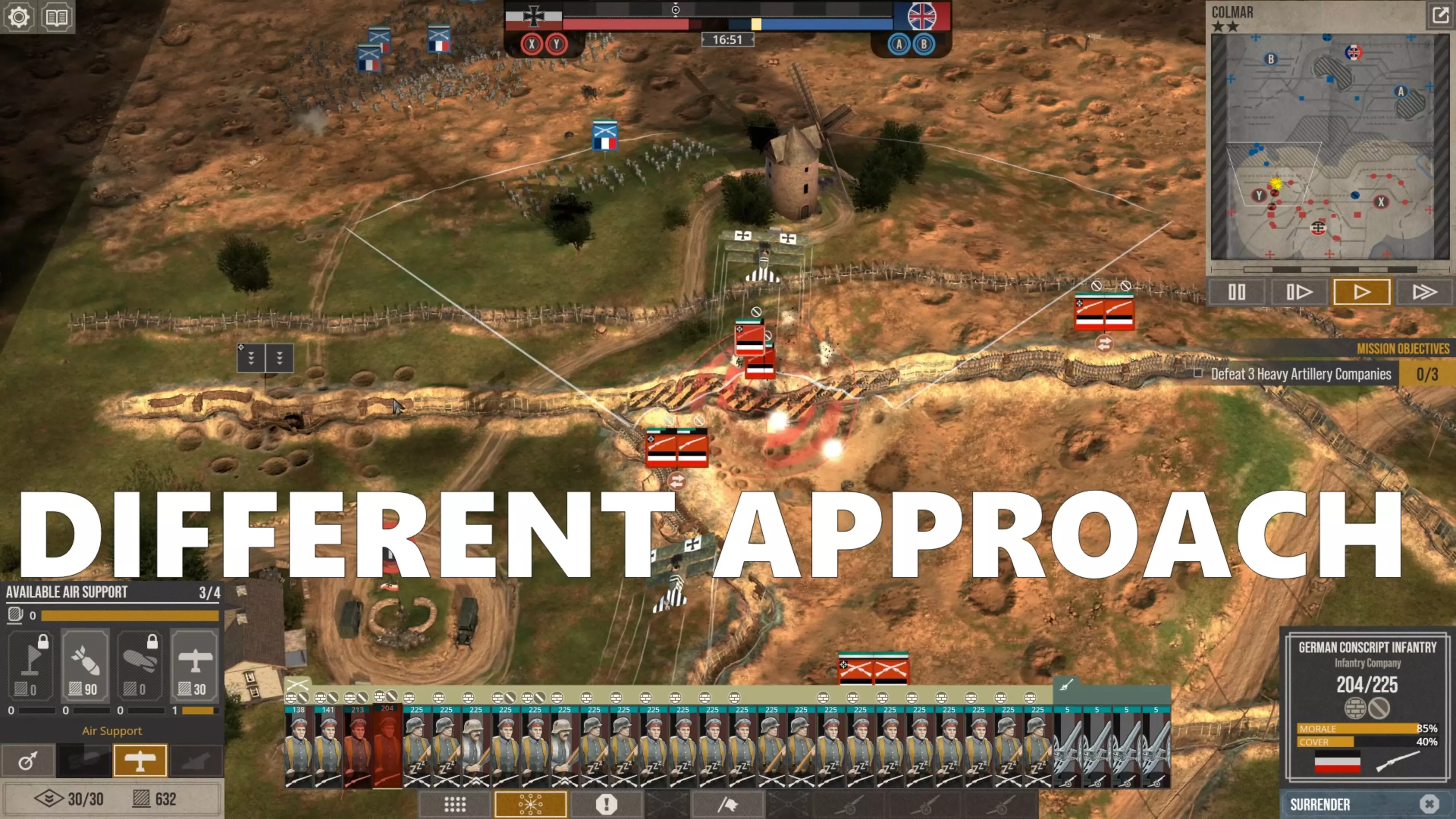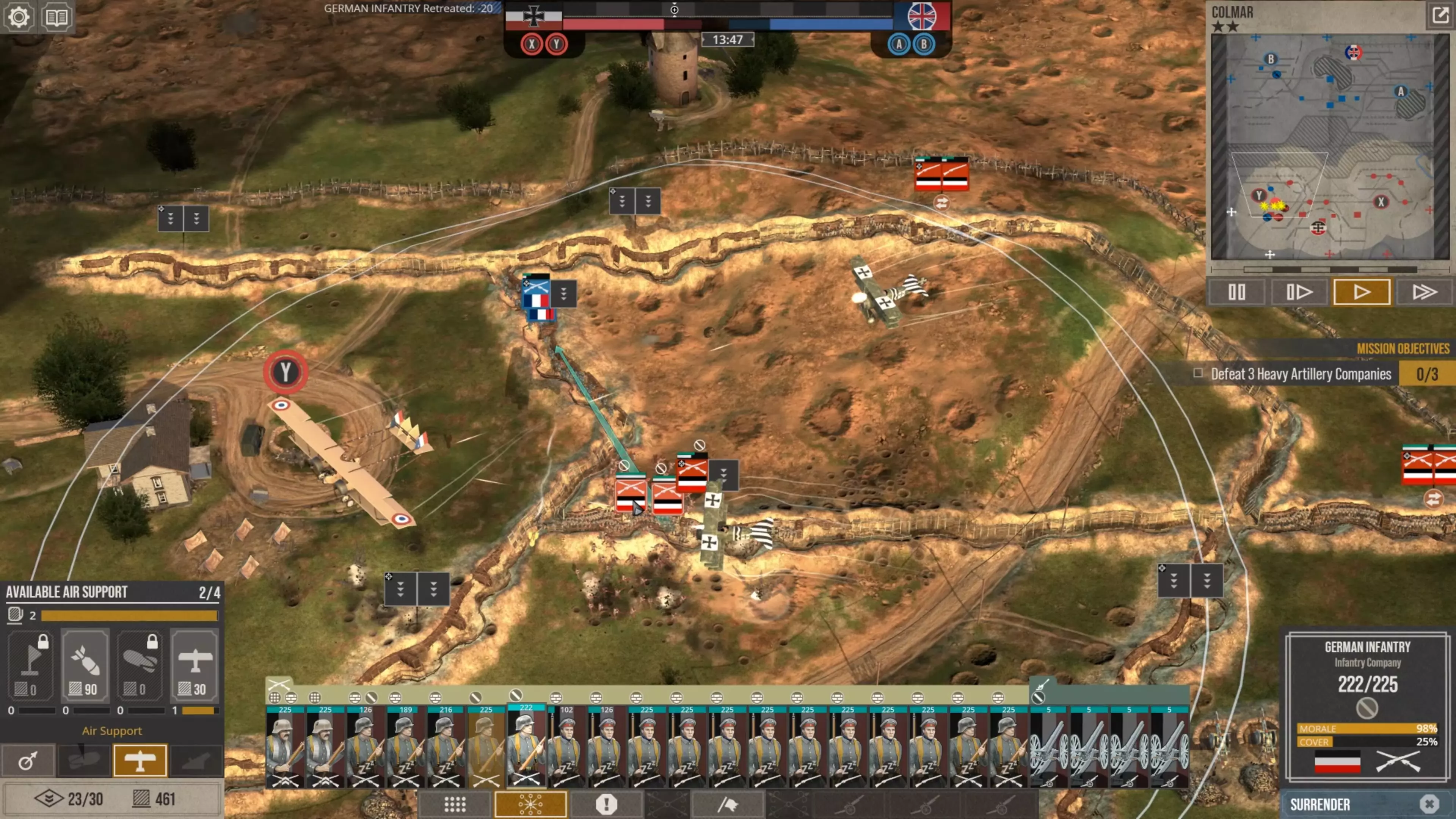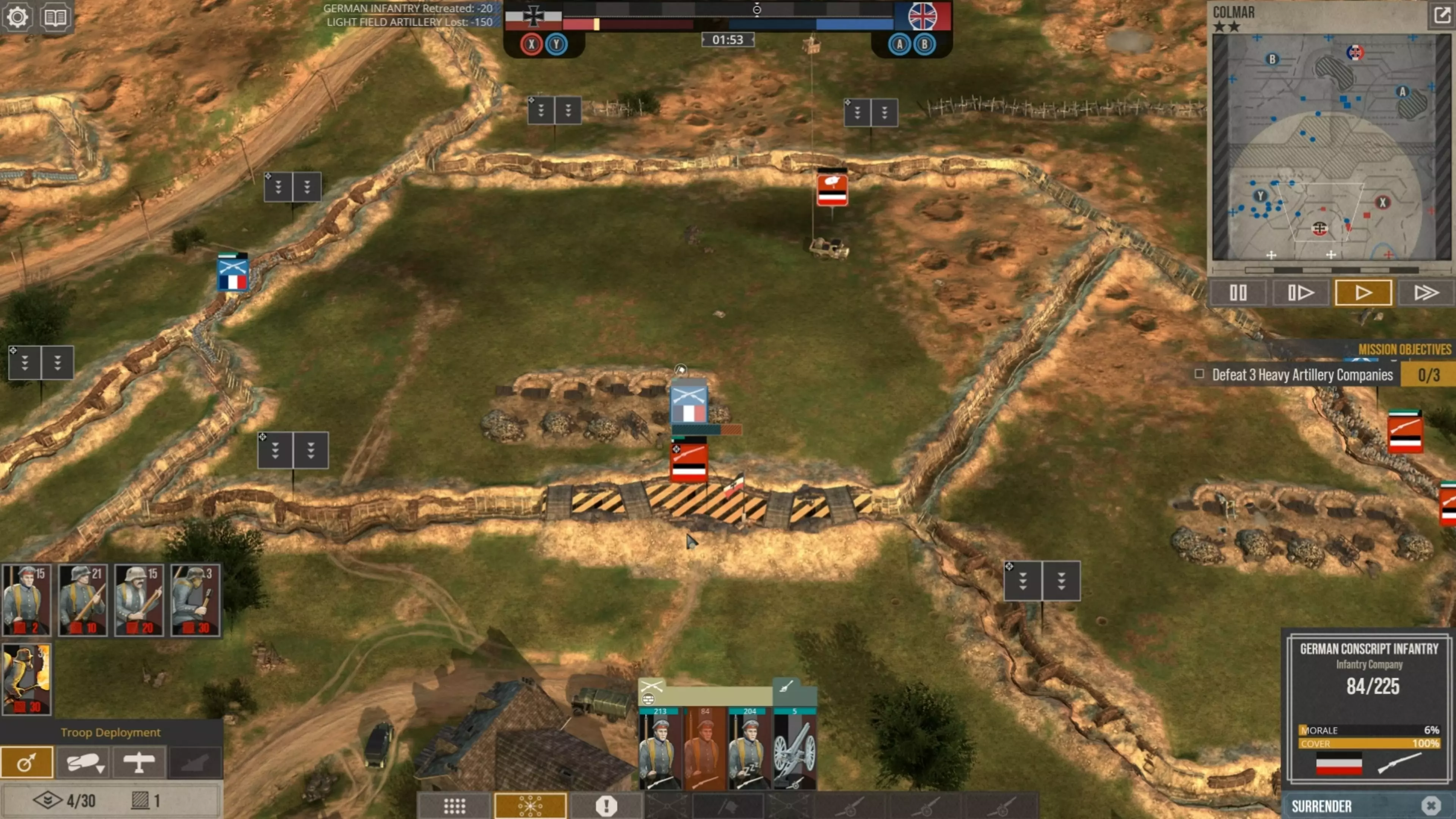 这会让他们消耗的补给点比你部署它们时还要少,而且当它们被半个地图外的炮火轰击时,你根本无法让它们开火。所以在这款游戏中防守时,你实际上必须采取一种与你对这种一战风格策略游戏可能设想的截然不同的防御方式。