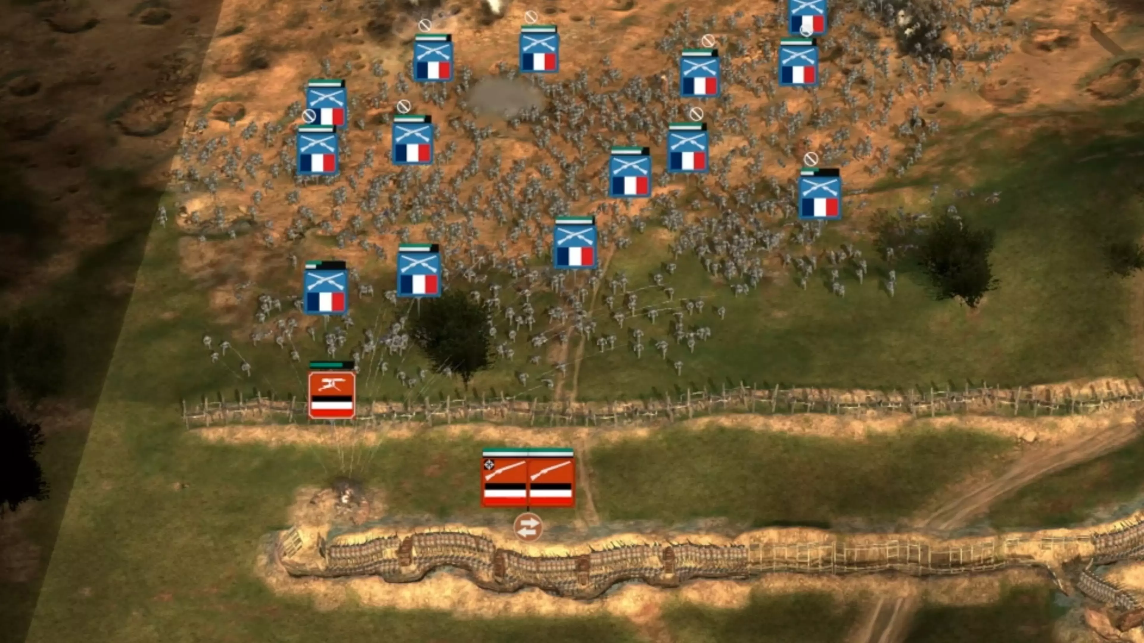 在这种情况下,成功进行战术应对的关键在于通过用新的、状态良好的增援部队轮换那些已下令撤退的受损部队,使前线部队保持最大的进攻能力。 此外,你必须通过反攻来清除战壕中的敌方单位,并且确保始终派遣两个单位,因为这是战壕的容量限制,同时要在附近战壕的掩护下行动。避免让它们穿过战壕上方的开阔地带,否则会被打得粉碎。 这就是为什么你需要将精英和老兵单位作为第二道防线,因为一旦征召兵和 artillery barrages(炮火弹幕)对敌方单位造成伤害,你十有八九能赢得战壕近战。肃清战壕内的敌方单位,为己方单位腾出空间,以便迎接下一波敌人时重新进入战壕。