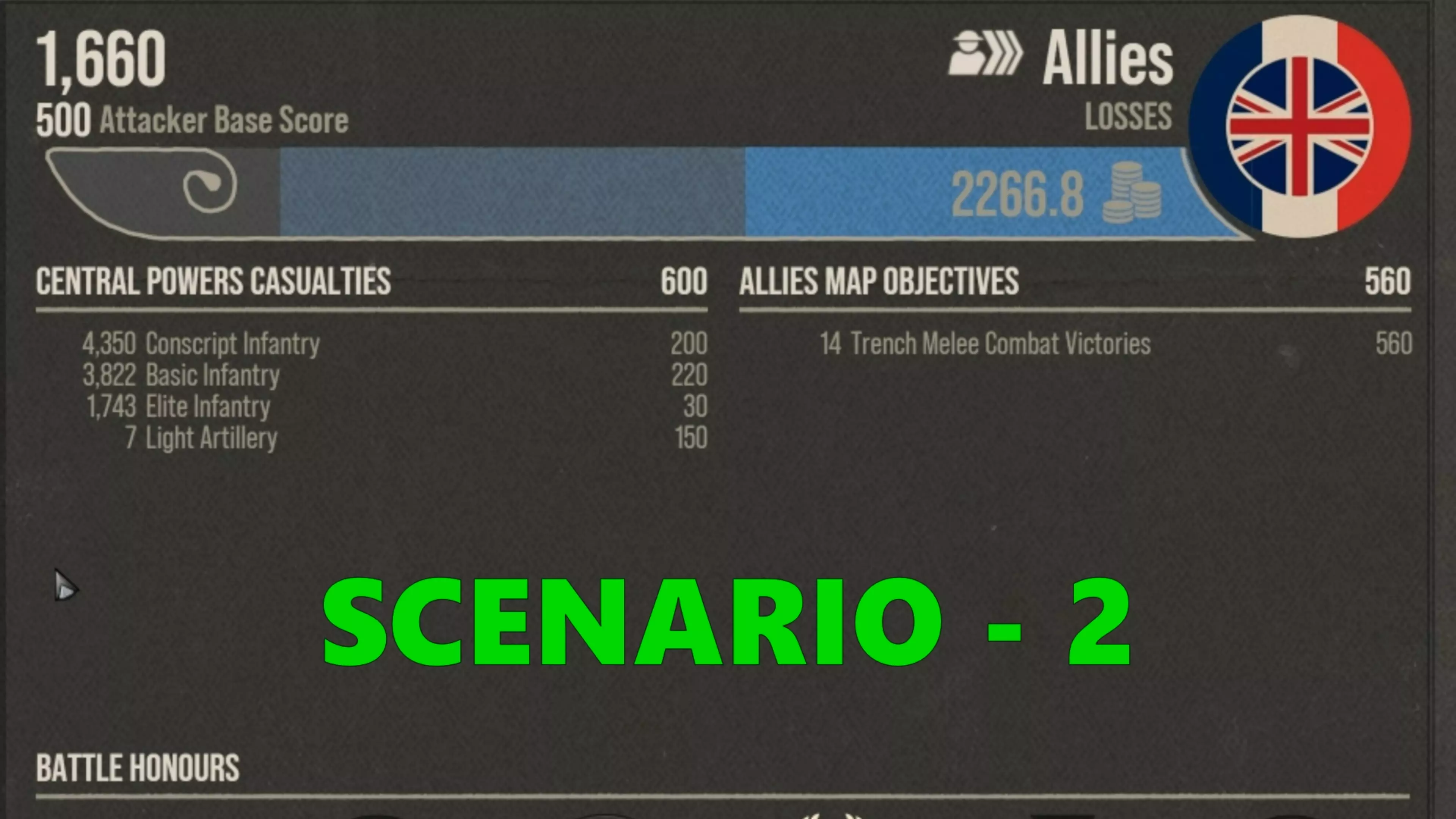 数据大致相同,但在协约国阵营,击杀我方士兵的得分相近,除了14次堑壕近战胜利外没有其他得分。