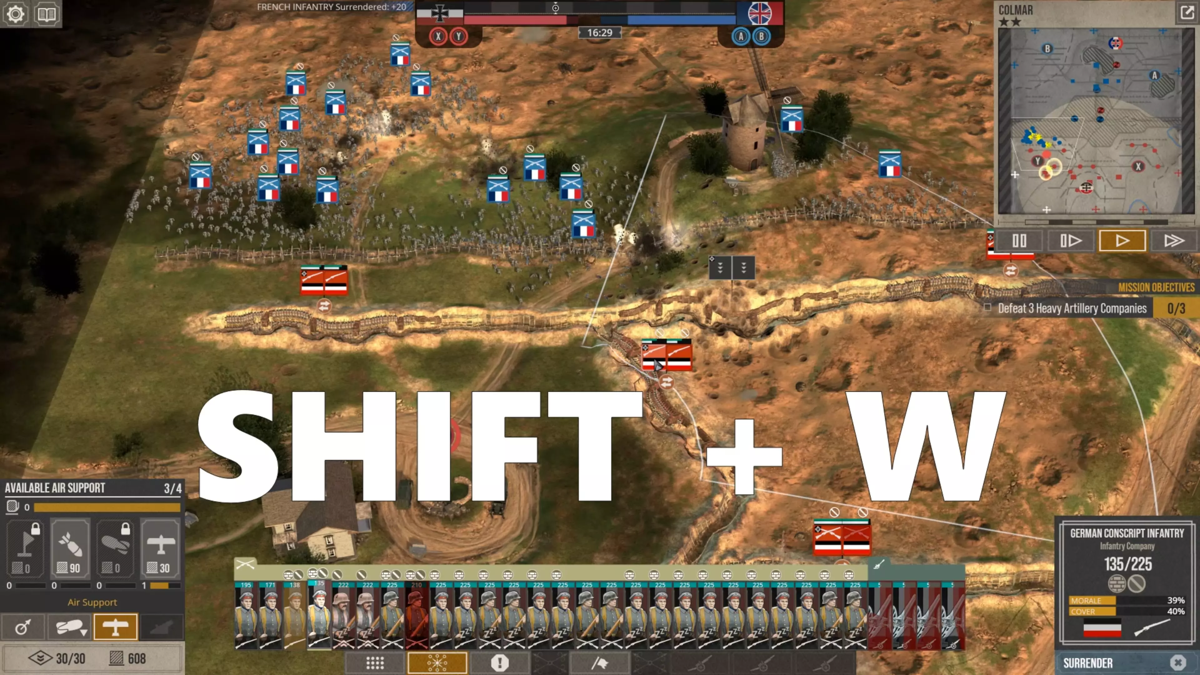 和其他场景一样,使用炮火支援同样是必要的手段,以此来迟滞、瓦解敌军进攻部队的士气并对其进行压制。如果你像我一样在第二或第三道战壕调动部队,要密切关注这些移动中的单位,因为如你所见,敌方AI会避开其部队正蜂拥而过的前线战壕,转而用炮火攻击这些移动单位。 由于已受损的单位,尤其是征召兵,在战壕近战中无法抵挡敌军突击部队,我会使用SHIFT+W键来撤回这些单位,这一点我在之前关于进攻的指南中已经告诉过大家。