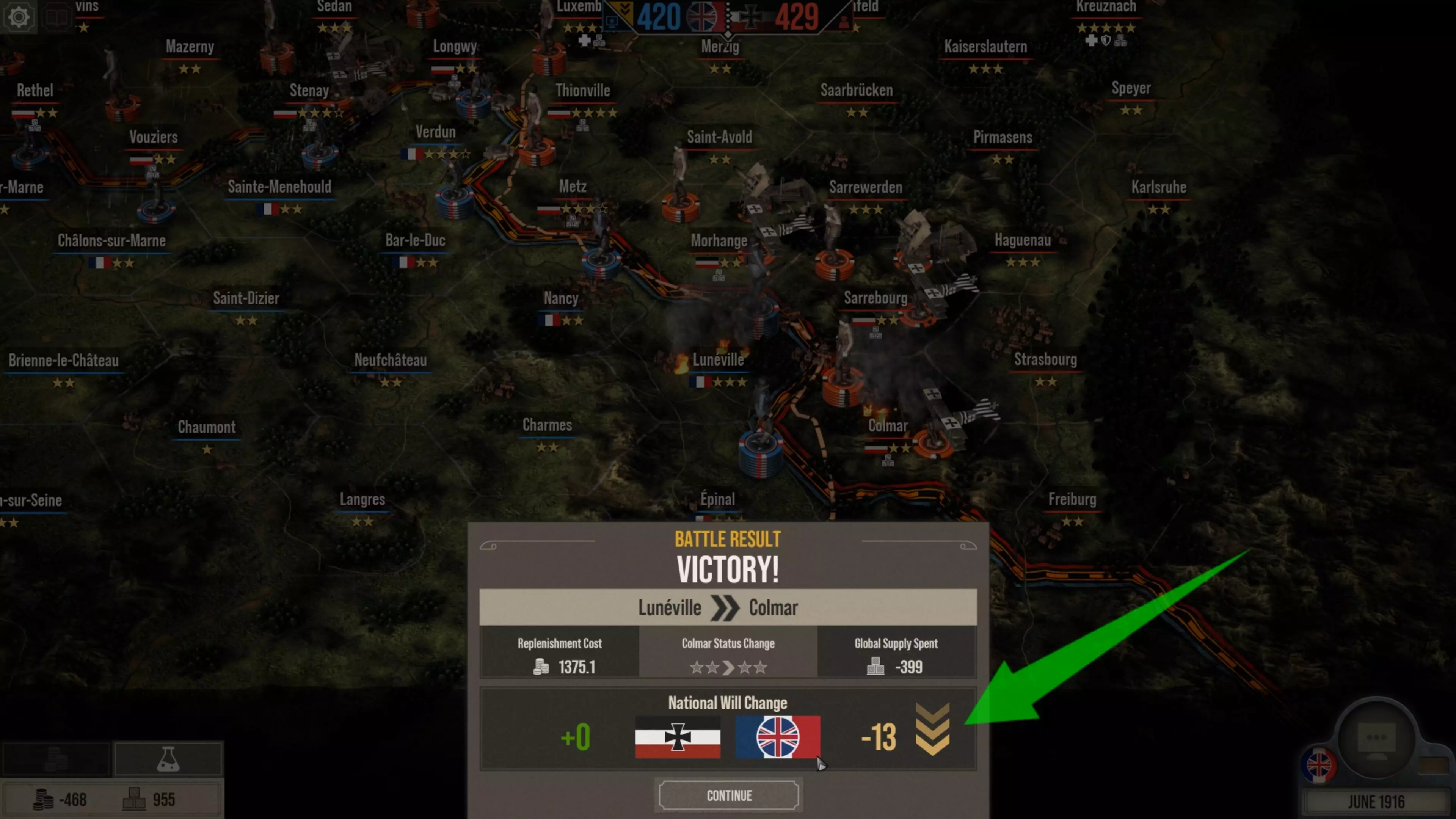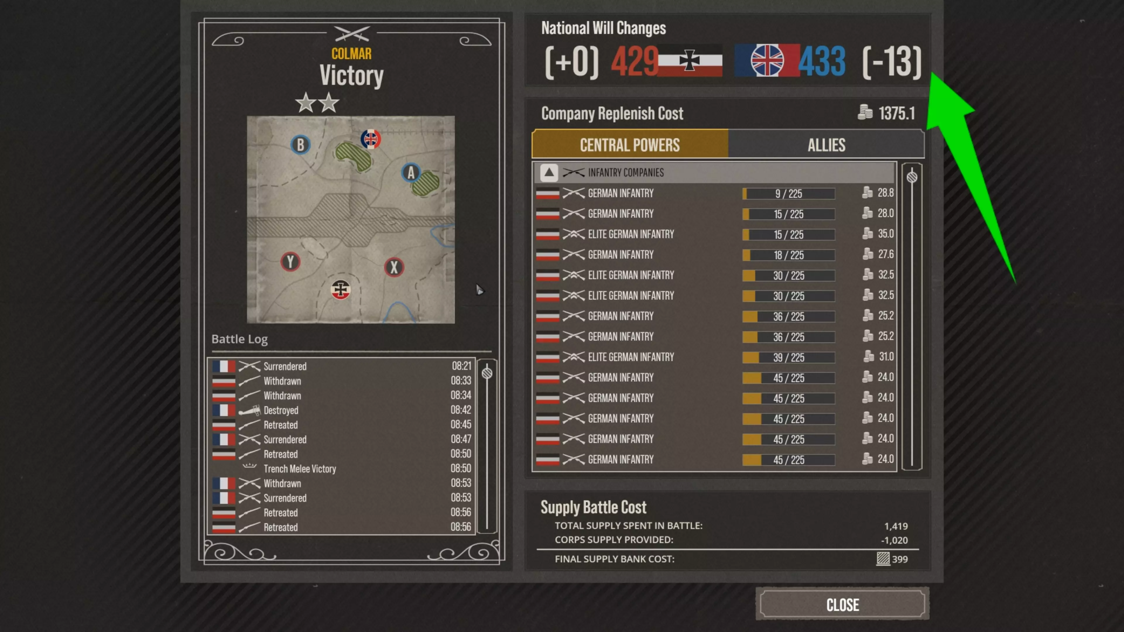 这就是为什么这场战役以我方胜利告终,而协约国的国家意志值则大幅下降。