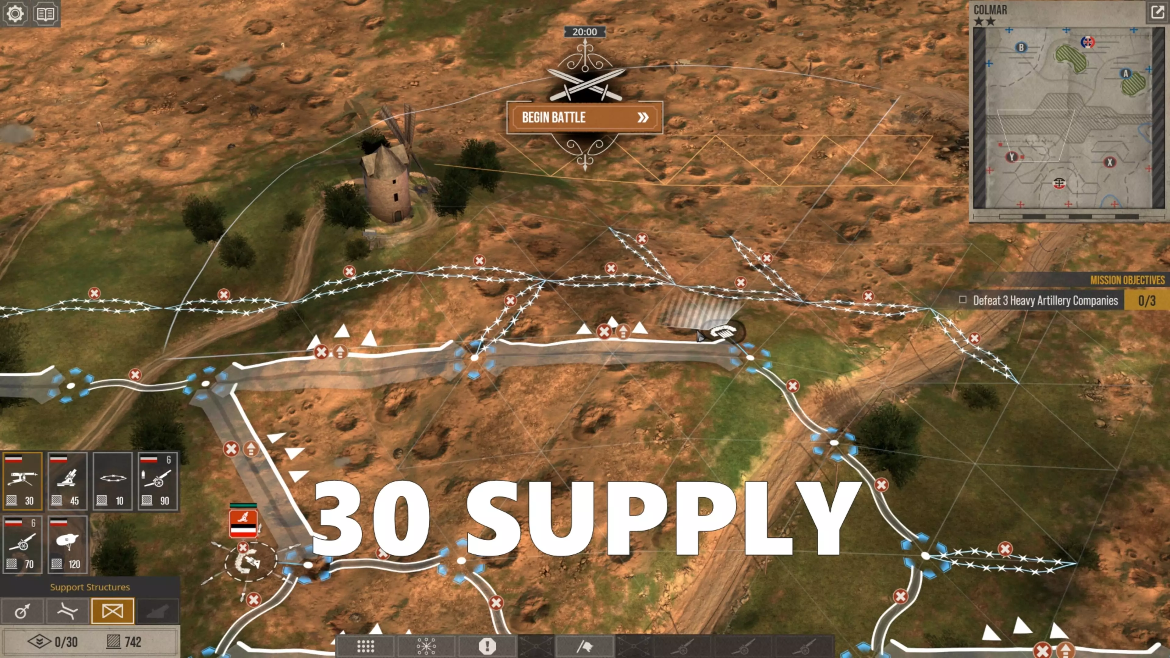 补给点数的重要性 从现在开始,在这两场战斗中,我将采用之前已解释过的相同战术:对来袭的步兵波次进行炮火覆盖,在前线牺牲征召兵,用老兵和精英部队发动反击以清理战壕,并持续将敌军单位赶出我的目标区域,防止他们占领该区域并从中调遣增援部队。 但关键区别在于,使用与不使用固定炮位时补给点数的差异。