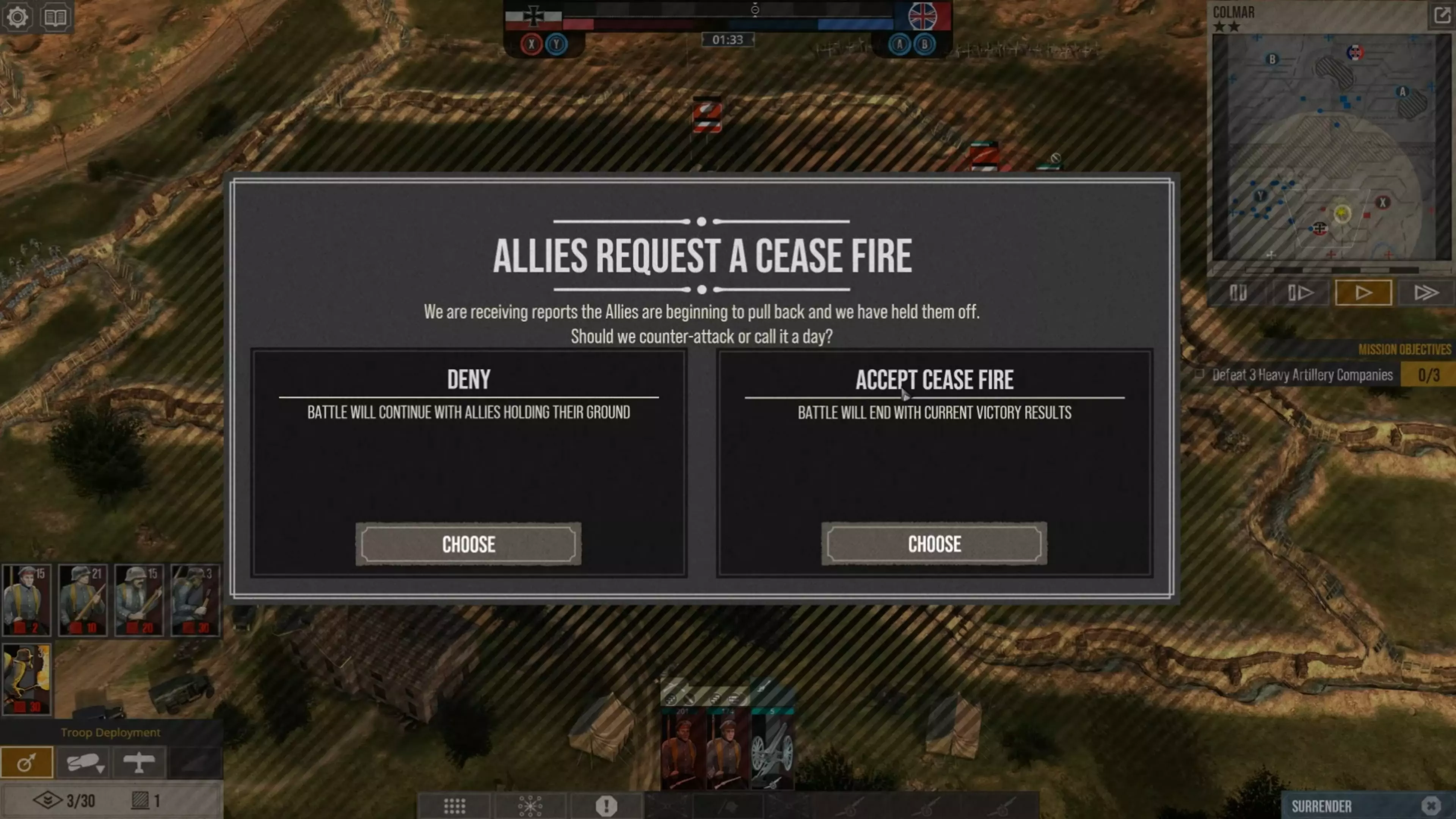 当敌人试图发起最后一次进攻时,他们耗尽了补给点,却未能占领一寸土地。这迫使AI通过宣布停火来结束战斗。