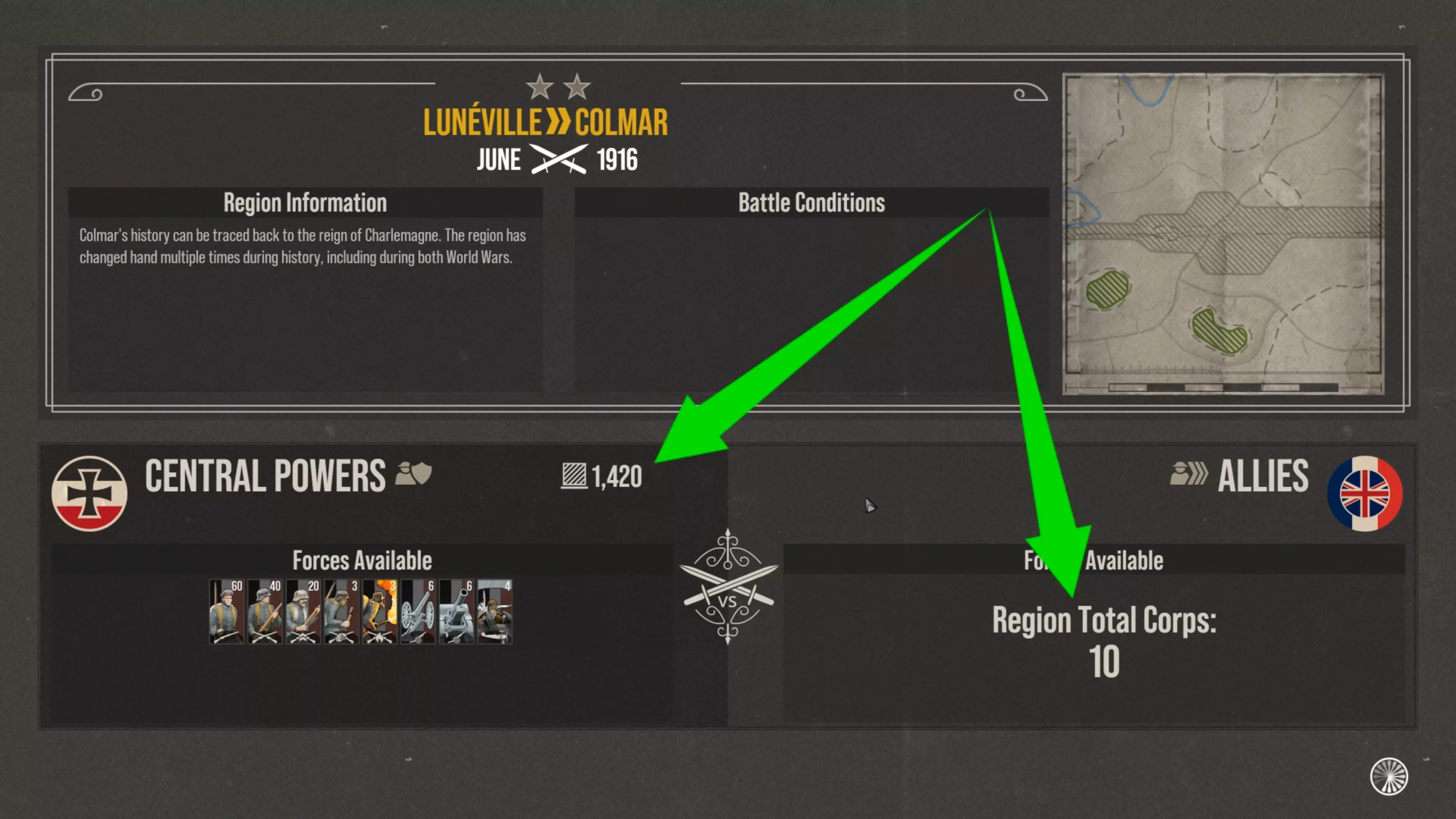 接下来我将只使用步兵、火炮和铁丝网,你会看到这会带来怎样的不同,而这一切都归结于在这些实时 trench warfare( trench warfare 可理解为堑壕战)战斗中,充分利用有限的补给点。 现在,如果你想了解如何选择攻击地点并成功发起进攻,我已经制作了另一篇指南。 在我的单人战役中,我正受到协约国军队在一个防御较弱地区的攻击,我总共有略多于1400的补给点,要对抗10个敌方战斗编队,这是相当多的兵力。