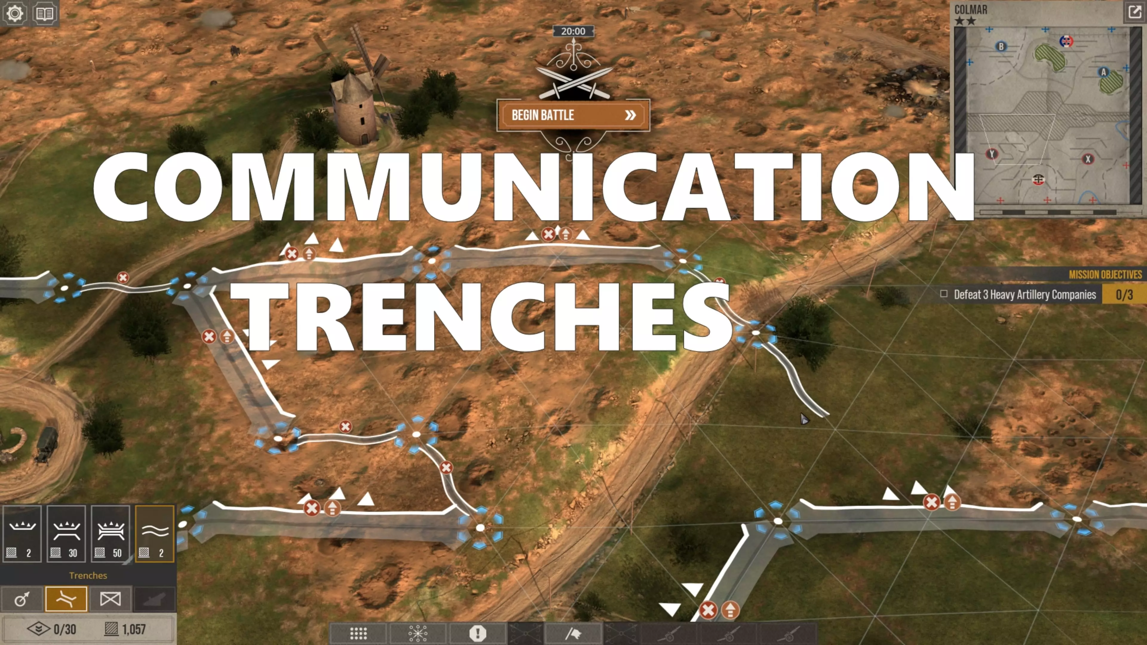 战场部署 我将在本视频中展示的两个防御场景,开局方式相同:我会通过交通壕在各战壕之间建立连接,这样我的部队就能在不受敌方火力攻击的情况下在战壕间移动,但他们无法从这类战壕中进行射击。