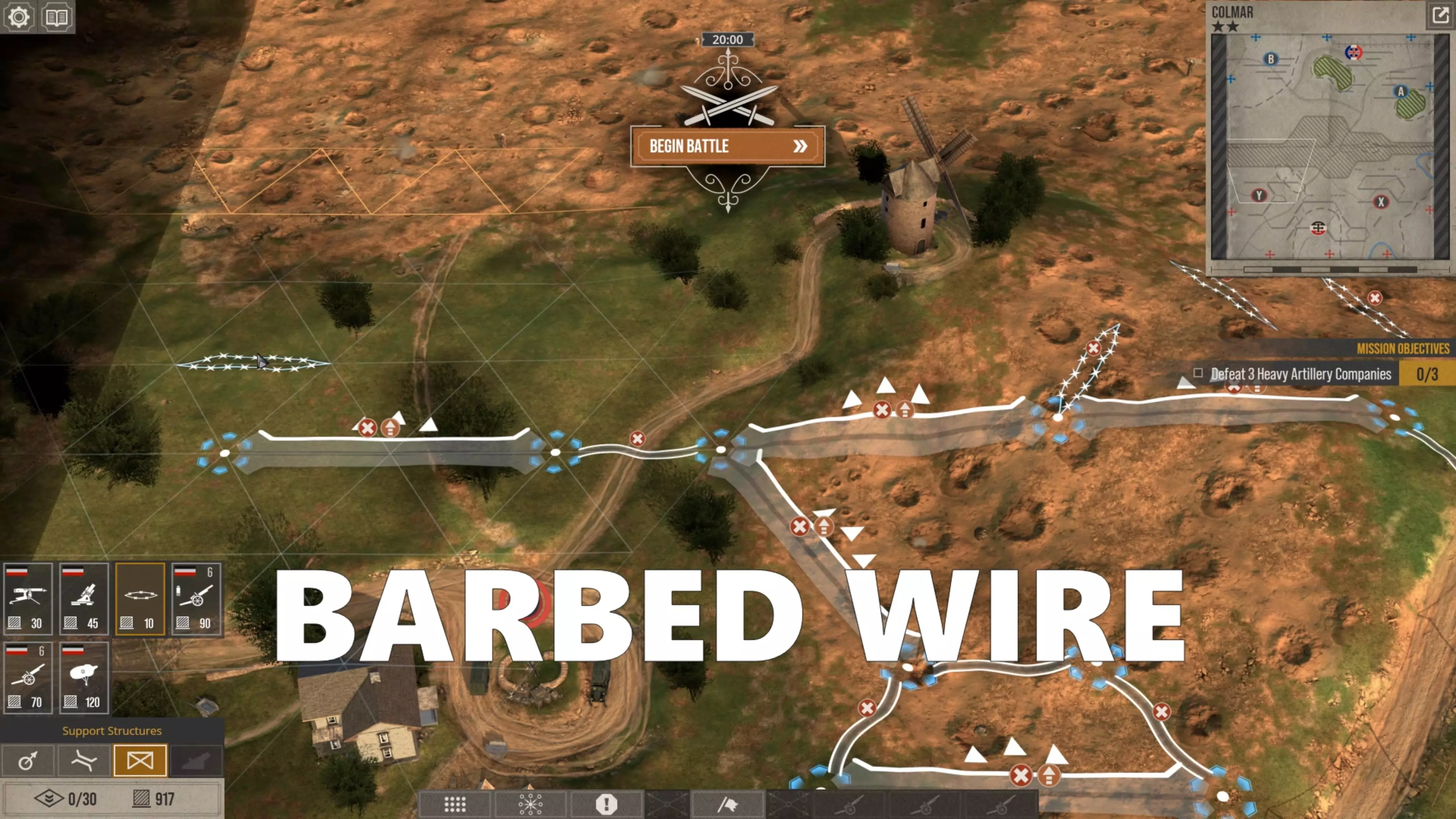 这些东西成本很低但非常有用,尤其是当你想把部队从遭受炮火攻击且被压制的战壕转移到安全的战壕时。而且,他们在战壕内移动时不会被附近的敌方步兵射击。 在防御场景中,我做的第二件事是在第一道战壕前放置铁丝网,因为这有助于减缓试图蜂拥攻击我方前线战壕的敌方部队,当他们艰难通过铁丝网时,会更容易受到我方步兵和炮火的打击。