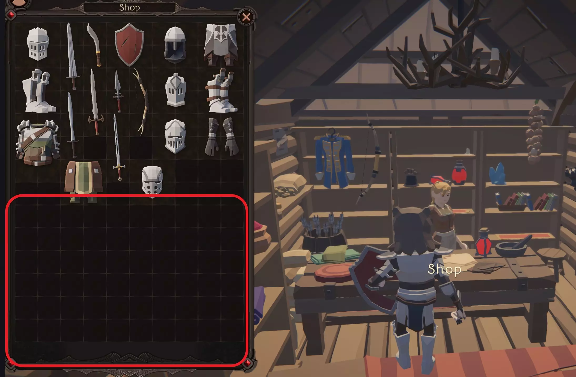 商店——就是那个门前看起来像任务板的建筑——是你出售不需要的战利品的地方。注意,店主没有“金币上限”,但有空间限制。如果你无法出售物品,请查看店主的库存,你可以移动物品来腾出空间,让她能购买更多战利品。随着你的进度推进,商店的库存会发生变化,装备也会变得更好,但回购价格会低于你购买时的价格,所以我建议不要为了 armor 或 stats 的微小提升而购买新装备。早期的几个任务会给你升级后的装备,所以过早购买似乎很浪费。