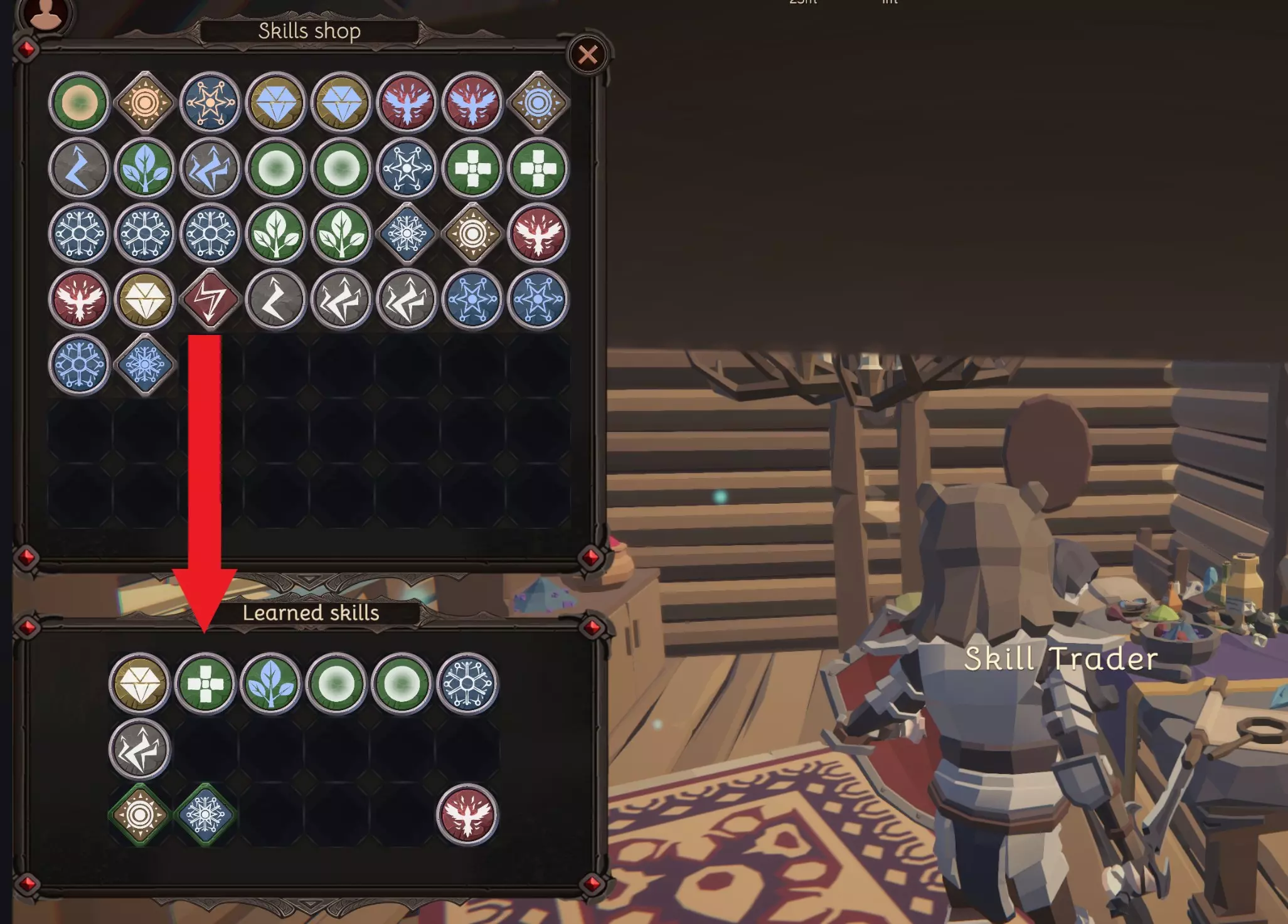 商人技能外悬浮着一个紫色发光球体,拥有可刷新的被动和主动技能库存供购买。将这些技能拖到已学习技能窗口即可完成购买。