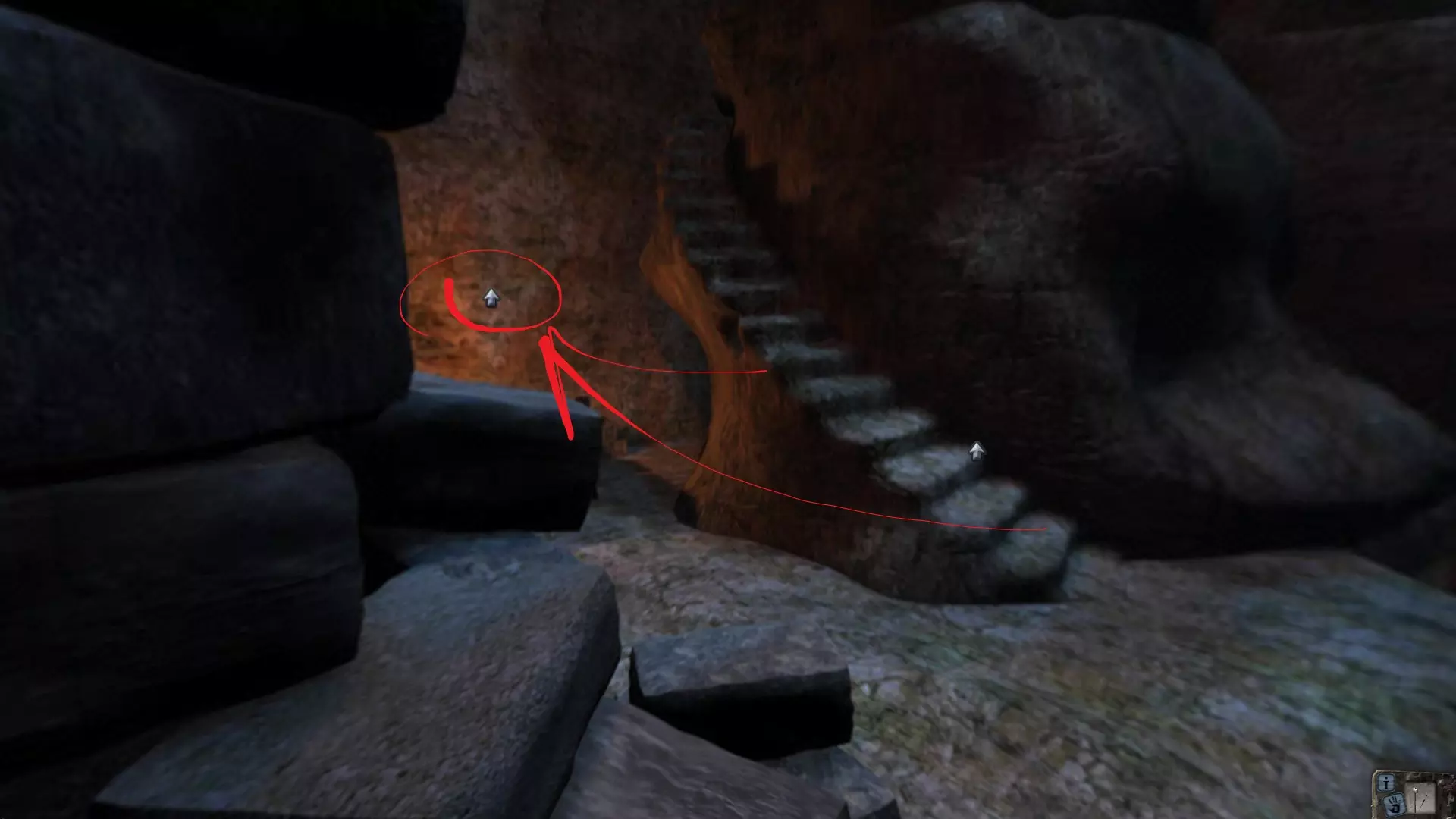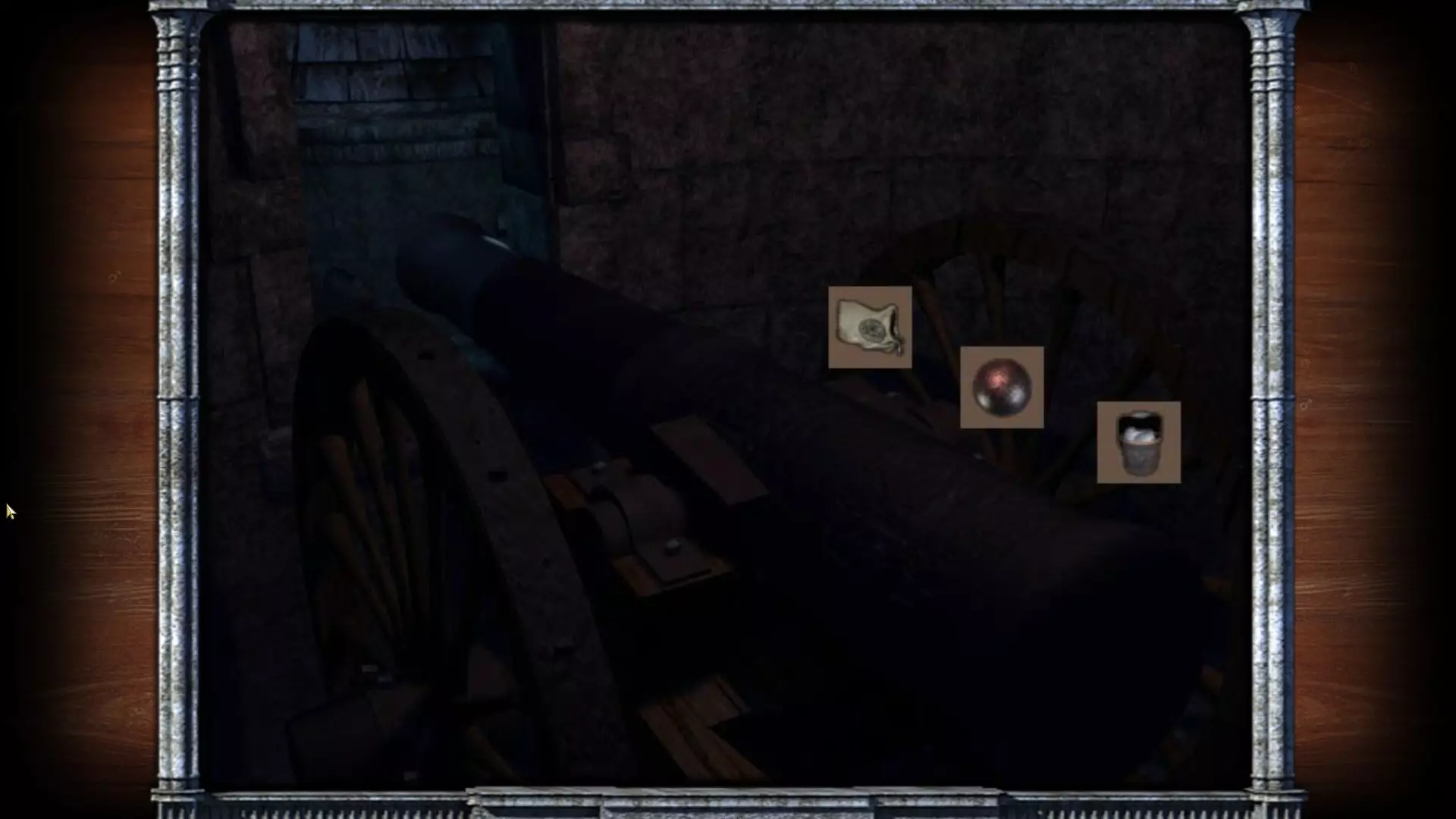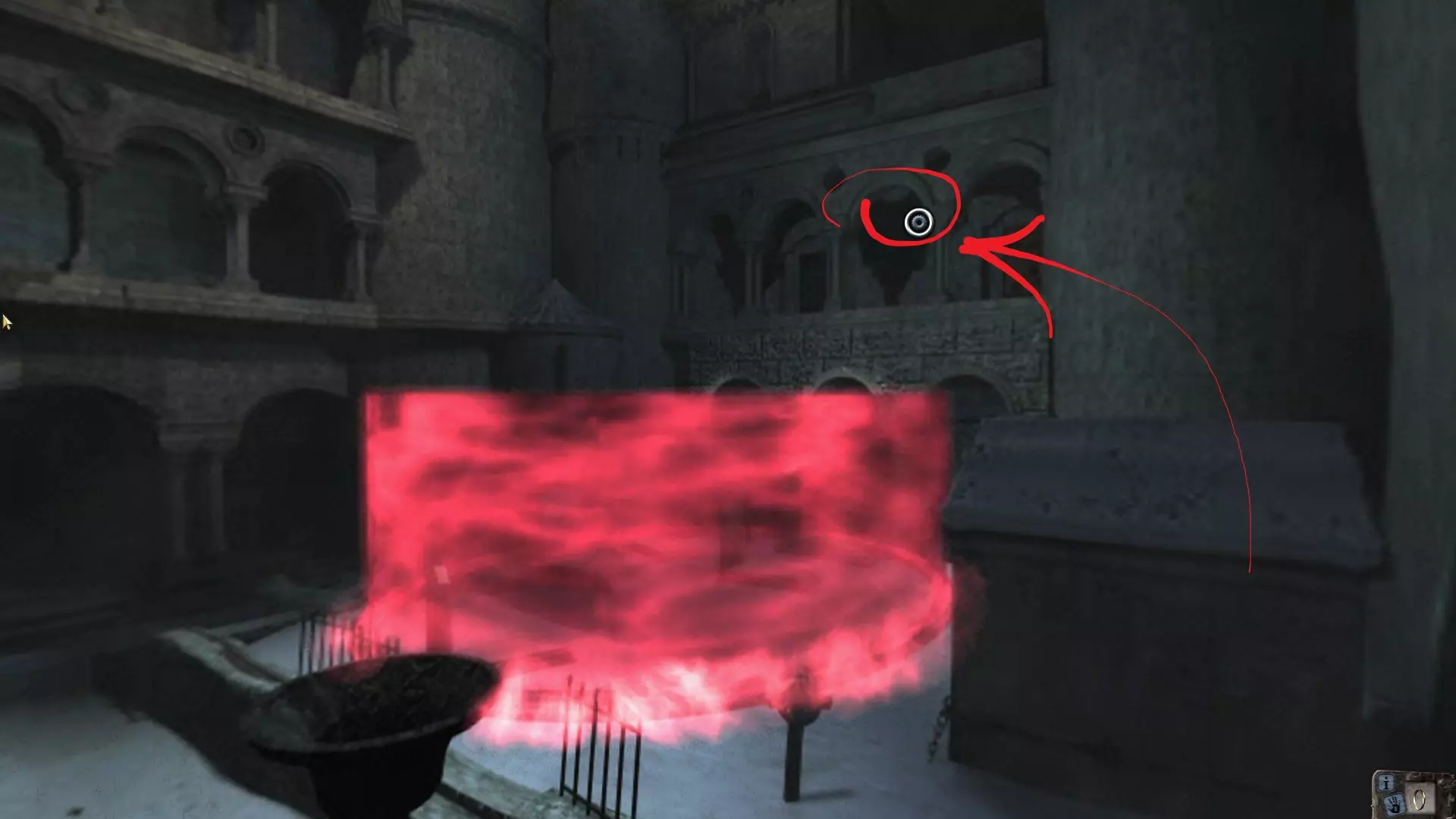 回到桌子旁,用锤子砸开抽屉里的一面墙。从那里拿到小钥匙。从桌子向右走,用这把钥匙打开抽屉。从抽屉里取出炸药。走上台阶,进入有头颅的隧道。把炸药放进头颅的嘴里,并在上面连接线圈。稍微退后,将雷管连接到导线上。引爆头颅,向前走一步。在地上找到宝石。继续沿着隧道前进,进入一个奇怪的房间。走向墙上的国际象棋棋盘,然后在其右侧与面具互动。需要将宝石放入右眼。 通过国际象棋棋盘后,直走,左转,直走,直走,左转,直走,直走。进入裂开的小房间。向左移动,查看脚下,移开骷髅,用铲子挖掘,获取骨头。接着走到尽头。这里重复同样的操作:清理并挖掘,拿走头骨和羊皮纸。离开牢房,沿着走廊返回。左边看到关闭的大门——进入那里。走进巨大的木门。从桌子的抽屉里拿起红宝石吊坠,桌子上有十字弓和灯。爬上桌子,需要从架子上取下箭筒。 回到大门处。将头骨放在脚下,然后把吊坠和骨头组合起来,安放在头骨上。接下来将灯和火柴组合。把灯放在装置旁边。大门会打开。一直往前走,直到找到戴着头盔的被砌在墙里的骷髅。靠近它,点击头部并从颌骨中取出拉杜之石。离开洞穴。 墓地:直走,向右拐,再向右拐。在棚屋后面拿起壁画碎片。退后一步,在裂开的坟墓后面拿起带剑的手。走向有壁画的坟墓并修复它。我们来到之前出来的地方,大门上出现了互动点。戴上眼镜,用持剑的手与之互动。现在我们可以进入地窖了。 第三部分 德古拉城堡 向左走并进入内部。下到上一部分遇到多尔科的地方。我们的老熟人还在这里。开始和她对话。讨论完所有问题后,打开物品栏并拿起拉杜之石。向多尔科询问关于这块石头的事。她本准备提供帮助,却被德古拉的一名侍女杀害了!临终前,她交给了我们一枚魔法戒指。 我们回到街上,沿着最近的、装饰有狼雕像的台阶向上走。来到门前,戴上眼镜后按下把手。出现了一个五芒星图案。我们用戒指触碰它。门打开了,我们走了进去,一直走到走廊尽头。拿起钩子后便返回。请注意其中一个阳台。这是截图: