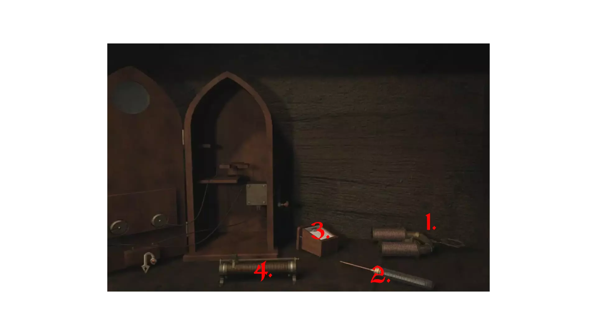 我们的任务是摧毁石像头颅。拿起反吸血鬼装置,前去摧毁它们。它们在地图上以绿色圆点标记。途中还要从宝箱里获取羊皮纸和龙形戒指。前往德古拉的墓穴。点击右侧雕像的眼睛,进入内部。按下棺材石板,向下移动。观看过场动画。 矿坑 来到熟悉的矿坑后,稍微向下走。我们身后有一间牢房——进入牢房。走到尽头,那里有一个巨大的怪物头颅在等着我们。旁边放着一个箱子,从里面拿起铲子和撬棍。返回并向下走。走向桌子,从抽屉里拿起线轴。接着前往石块堆旁的木质结构处。用撬棍移开石块,从那里拿走雷管。爬上石堆,在上面找到锤子和锯子。注意!这是地点转换的截图,需要自己爬上去。一开始没看到,所以为了以防万一,附上它!