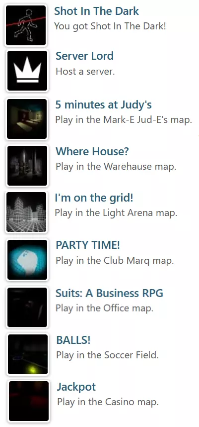 成就指南与攻略 - 关于无法正常解锁的成就,可在我的指南评论区查看修复方法 步骤1 基础操作 W = 上 A = 左 S = 下 D = 右 E = 扔灯笼 F = 切换武器 鼠标左键 = 攻击/射击 完成以下步骤即可解锁后续所有成就(见下方图片3): 1) 按开始键 2) 选择创建服务器(见下方图片1) 3) 逐个选择地图(见下方图片2)