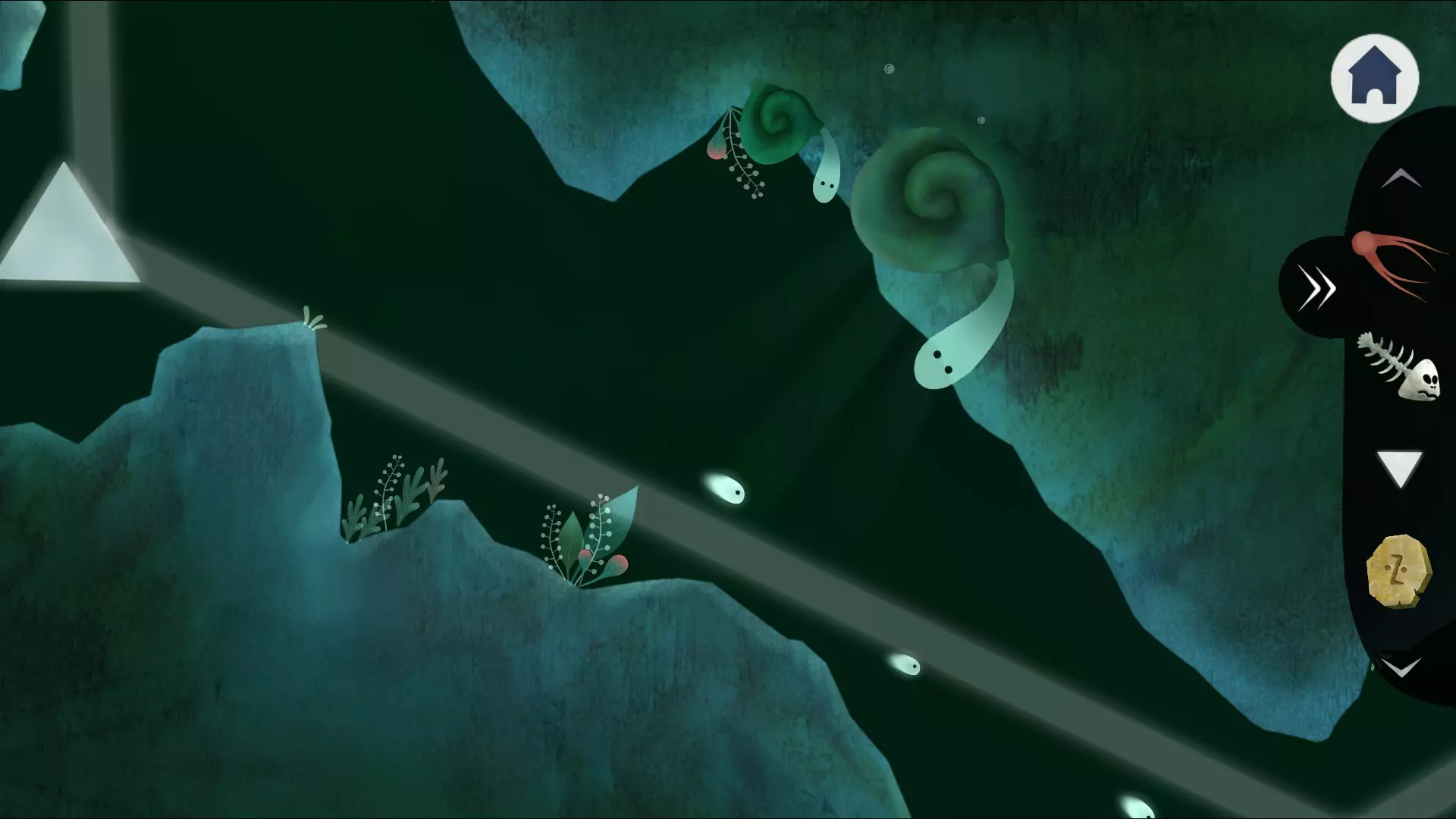 向右走,会看到一个绿色的圆顶,点击水面,需要放置叶片,让所有生物都能同时到达目标。截图没加载出来。第一片叶子放在顶部中间,第二片放在第二个生物左上方,第三片放在顶部中央的入口处。大概就是这样。 获得另一个棱镜【3】。出去后继续向右走。 看到一个洞穴,走进去,在右下角需要抓住红色的虫子。点击有孔洞的石头,玩类似“打地鼠”的游戏。获得另一块棱镜(4)。但现在还不能离开,再次点击有孔洞的石头,在其左侧部分拾取植物。现在确实收集齐了。不过对于特别懒的人,可以前往屏幕最左侧,将半个符号扔进大瓶子/花朵中,以获得完整的符号。后续会有相关提示。 现在可以前往湖泊了。我们看到一个头骨里露出了一个小一点的颅骨,点击它可以获得鱼骨。也可以点击贝壳,但只有在稍远一点的大贝壳里才有东西。在拿取下一个棱镜(5)之前,要把断裂的树枝插进贝壳里,否则贝壳会合上,让你一无所获。 继续向右移动,在右上角可以看到一个图案,把它记下来,之后会用到。沿着光束前进,但光束被岩石挡住无法继续延伸,我们在这里放置棱镜。在某个时刻,会出现一只拖着贝壳的小章鱼。点击它就能拾取。在一个地方的墙壁上有两只蜗牛,其中一只是巨大的。