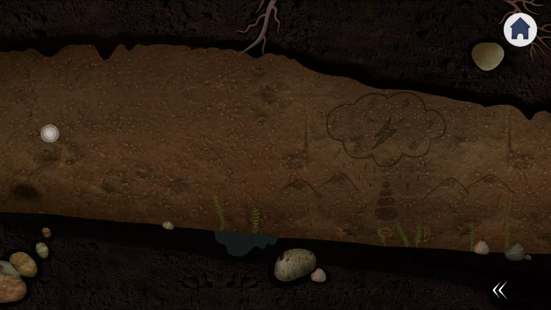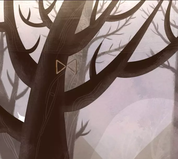 现在我们的任务是射中鹿,如果你射中了,就会出现白色鹿的标志,如果没射中则是黑色的。白色标志越多,雾气就越浓,需要在鹿跳到最高点时点击,树木在这里不会造成阻碍。需要“捕捉”它四到五次,我不太确定具体次数。但一旦你完成这个操作,就会出现一个长着白色鹿角的黑色幽灵。点击它,就会出现我们之前找到的那些符号。点击它们,中间和左下角以及右下角的。幽灵会警告你有危险,并告诉你水下怪物害怕火。 出现一条小路,小路左边的洞穴里有人。向前走。 要继续前进,屏幕最左侧有一条小路,但这里还有事情要做。记住石头上树木图像的“球”的数量——3、4、1、2。同时可以看到一块有放置骨头和角位置的大石头。向右移动,我们会看到一块带有多足生物图案的石头。这个图案并非完全是分步式的,但我想大家都能理解。