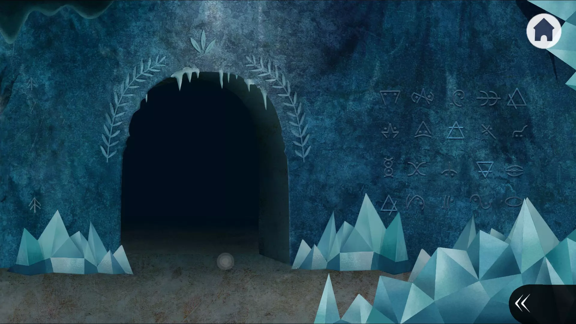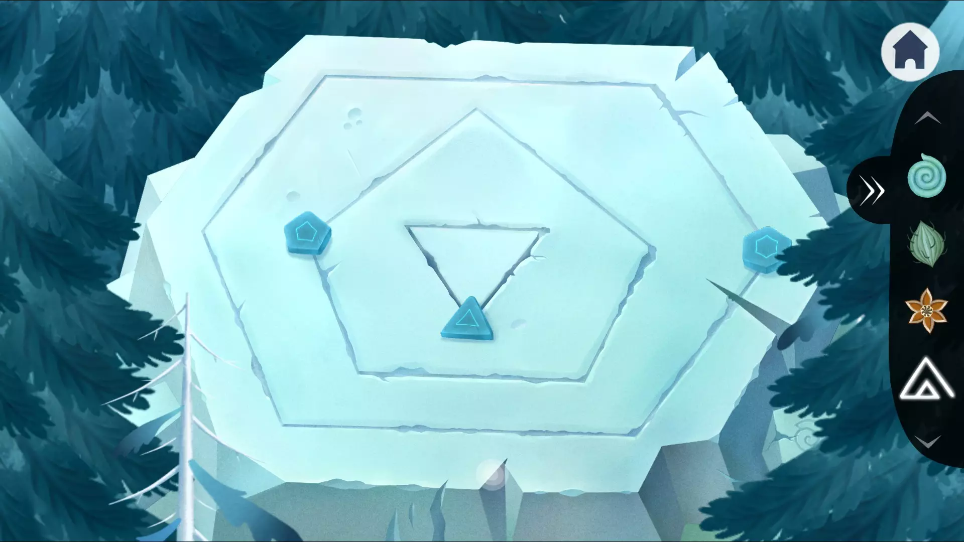 接下来需要处理这扇门,这里需要照亮所有面。建议从任意面的中间开始,先照亮三角形,然后移动到中心方块,留下它的一个面不亮,再移动到中心菱形,照亮菱形后,照亮中心线条,之后的步骤就很明显了。希望没让你 confusion。进入内部并与“雪人”对话,他会要求你带来永不凋谢的花朵,并给你一个蓝色水果。这是我们需要的第三个水果。现在可以将冰棱镜放在带有龙的水晶下方,也可以稍后再做,结果是石笋会开始融化,你将获得花朵。 离开这里向左走。在冰柱环绕的地方有一个人,点击他会出现另一个奇怪的生物。点击靠近松鼠的墙壁,这个生物会撞到墙上,松鼠就会逃跑,我们就能获得第三个红色果实。但这还没完,右侧墙壁上有一个六边形,要拿到它,需要让这个生物多次撞击墙壁。来回驱赶它,我们就能得到想要的物品。这里没什么别的事可做了。 向左移动,会看到一个月牙形的岩石。走到那里并驱赶松鼠,直到掉落的石笋给我们五角星。前往最左侧区域,这里有一个类似井字棋的谜题,不过需要将所有棋子沿其中一条对角线排列。上方放置蓝色水果代表对手,下方放置红色水果代表你。接下来开始解谜。 解谜步骤:左上、右上、中左、右下、左上向上、左下向上、左上向右、左中向右、上左。谜题解开,门打开了。看到一条蛇在花旁边睡觉,点击它上方天花板上的冰块,蛇会逃跑,这样就能拿到花了。同时,一块之前挡住墙上某个洞口的冰块也掉了下来。点击那些发光的小物件,等它们归位后,按照之前看到的墙上提示,把它们的颜色依次调成黄色、绿色、蓝色、红色。接着会看到花朵绽放,点击花朵就能获得带刺的果实。现在所有人都带着雪人进入洞穴,并把花交给他。一阵神秘仪式后,龙复活了,它提到了冻在冰里的种子,这就是我们用冰棱镜融化的那个“小花”,甚至都没等提示就完成了))) 走出洞穴和龙对话。它会感谢你并给你一个三角形石头。现在是时候去之前错过的平台了。把现有的石头放在那里,不过这里我不太确定,似乎没有提示。纯粹是猜测。下方的三角形,是因为石板下方有三角形的破洞;六边形在右侧,靠近最长的破洞;而五边形则是通过科学尝试放在了左侧。不过这样成功了。