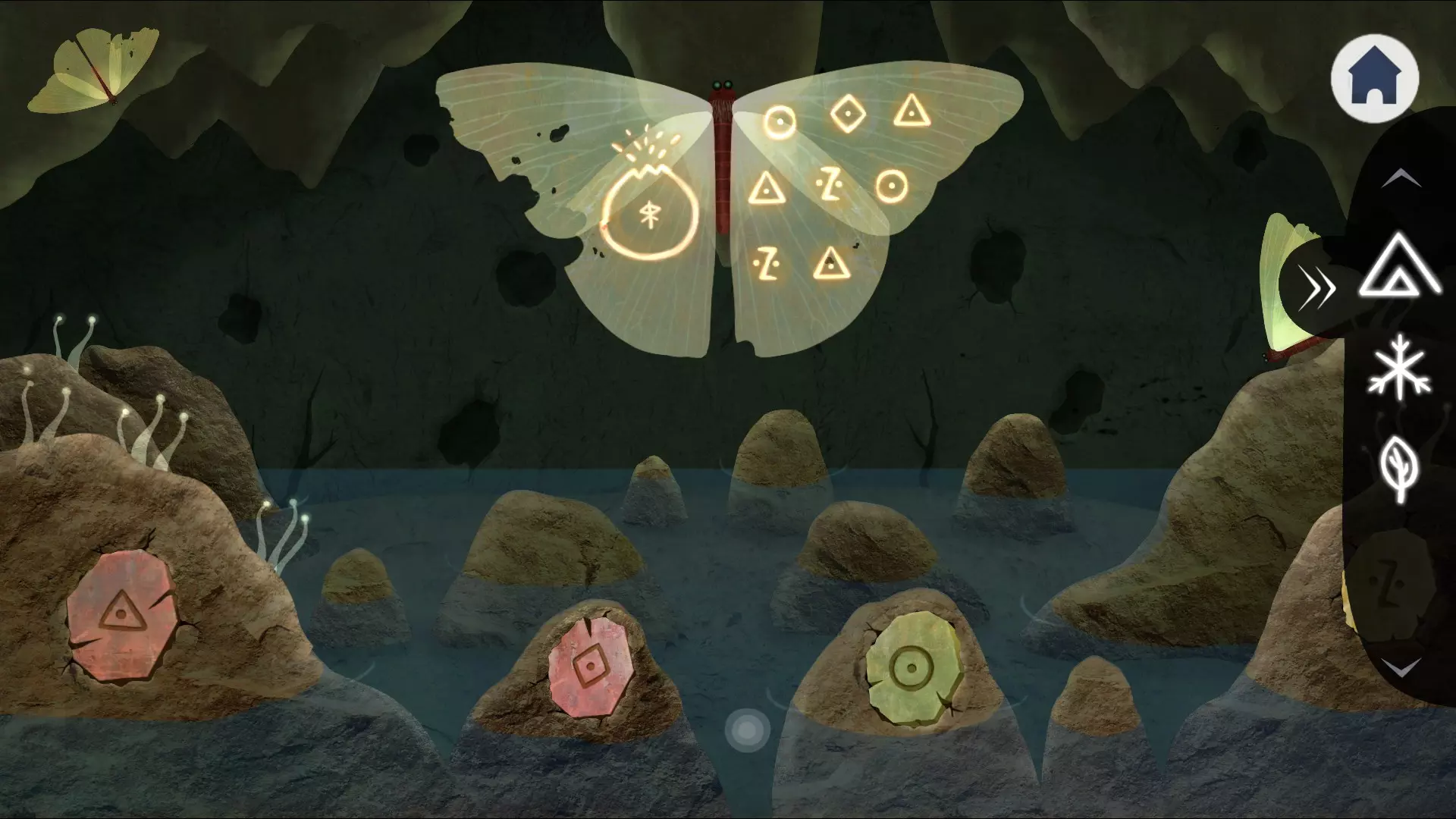 拿起多足虫,回到上一个场景(左边的小路),把它交给洞穴里的生物,作为回报,它会给我们两根骨头。 回到有石头的场景,移动到屏幕最左侧,那里有一条带有醒目标志性花朵的小路,前往那里。 移动到屏幕最左侧,从熄灭的篝火中拿起一根骨头,点击树后的生物,它也会扔给我们一根骨头,我们捡起来。现在从左到右“点燃”树木,顺序为3、4、1、2,这些树木上应该亮起相应数量的“光球”。不用费脑筋,只需点击任意光球就能获得所需数量的发光光球。当左侧有生物跑出来时,跟随它并点击它,它会变成火焰,我们拾取火焰。 现在是时候唤醒湖里的怪物了。移动到它那里,听它一大堆威胁的话,对它使用火焰,就能获得角。现在我们集齐了全部物品,前往带有凹槽的石头处,将所有物品一一放入。长着鹿角的幽灵苏醒过来,变成白色并给予你一个符号。拿起符号,秋季区域——完成。 冬季 观看剧情,了解这里发生了什么变故,现在我们的任务是修复一切。 从最左侧区域离开,开始按顺序收集那里的所有物品。在巢穴中拿取蓝色果实,在被雪覆盖的石头旁、非常显眼的小山丘处拿取红色果实,途中看到石头上的图案,它显示了我们需要收集的东西。在最右侧角落的树枝上再拿取一个红色果实。目前就这些。在物品栏中可以看到,每种果实需要收集三个。 沿着小路走向有红色梯子的山。我们要前往这座山,向左移动。这里的任务是将头骨放在所有下落的水滴下方,以此来吓走蝙蝠,完成后你将获得冰棱镜。再向左移动一点,点击石头,就能得到另一个蓝色果实。 现在向右移动。墙上可以看到发生过的故事,但这不是重点,要记住萤火虫的排列顺序——黄色、绿色、蓝色、红色、红色,之后会用到这个顺序。我们看到一扇锁着的门和墙上的图案,这图案之后也会派上用场。