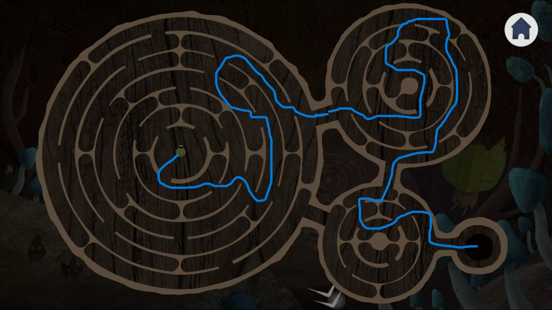 使用章鱼雕像。会出现一个秘密通道,进入通道。点击黑色物体,之后会遇到三个谜题。 第一个是树叶谜题。这里很简单,将树叶的叶柄垂直向下放置。 第二个是旋转圆盘谜题。这个稍微复杂一点。那个反向旋转的圆盘不用管,它是个干扰项。对比蓝色部分,那些完全相同的不符合要求,而那个不同的才是我们需要的。希望我解释清楚了。第三处彩色三叶草,在下方一排找到成对的。它们有蓝色的中央花瓣,其中一个旋转落后半圈,另一个落后四分之一圈,我们需要的就是那个落后四分之一圈的。 获得另一个石制符号。现在继续前进,沿途将棱镜插入正确的位置。如果收集齐全,就用光线击退前方的黑色怪物。 点击发光点,进入新的区域。右边不远处有通往木桩的路,我们就往那里走。看到有甲虫在绕圈爬行,把之前抓到的甲虫放到那里,然后按照之前看到的图案交换它们的位置。如果操作正确,木桩中心会下沉,升起后会给你一个类似哨子的东西,拿起它就离开。 再往右有一个洞穴,仔细看的话,入口上方有一只会变色的蜥蜴。点击它直到它掉进水里。可以进入洞穴并设置我们现有的符号。 出去后向左走,会看到一个巨大的东西,它有四个孔洞,中间还有一个符号。右边的石头上,一片叶子后面隐约能看到一条蜥蜴,点击它,让它在不同地方来回跑,直到它撞开堵塞物并卡在洞里,然后我们把它拿走。 再往左走,站着那个之前吹笛子的家伙,可以把蜥蜴给他,但现在对他做什么还为时过早。向左走然后向上,那里有另一个奇怪的生物想要用东西交换,我们喂给它鱼骨、蜥蜴和植物,得到了另一个符号。在它身后的墙上可以看到修复符号的图案,如果之前没做过的话就去那里修复符号。进入洞穴,按照猫头鹰的提示放置符号。蝴蝶展开翅膀,我们看到了笛子的【乐谱】。