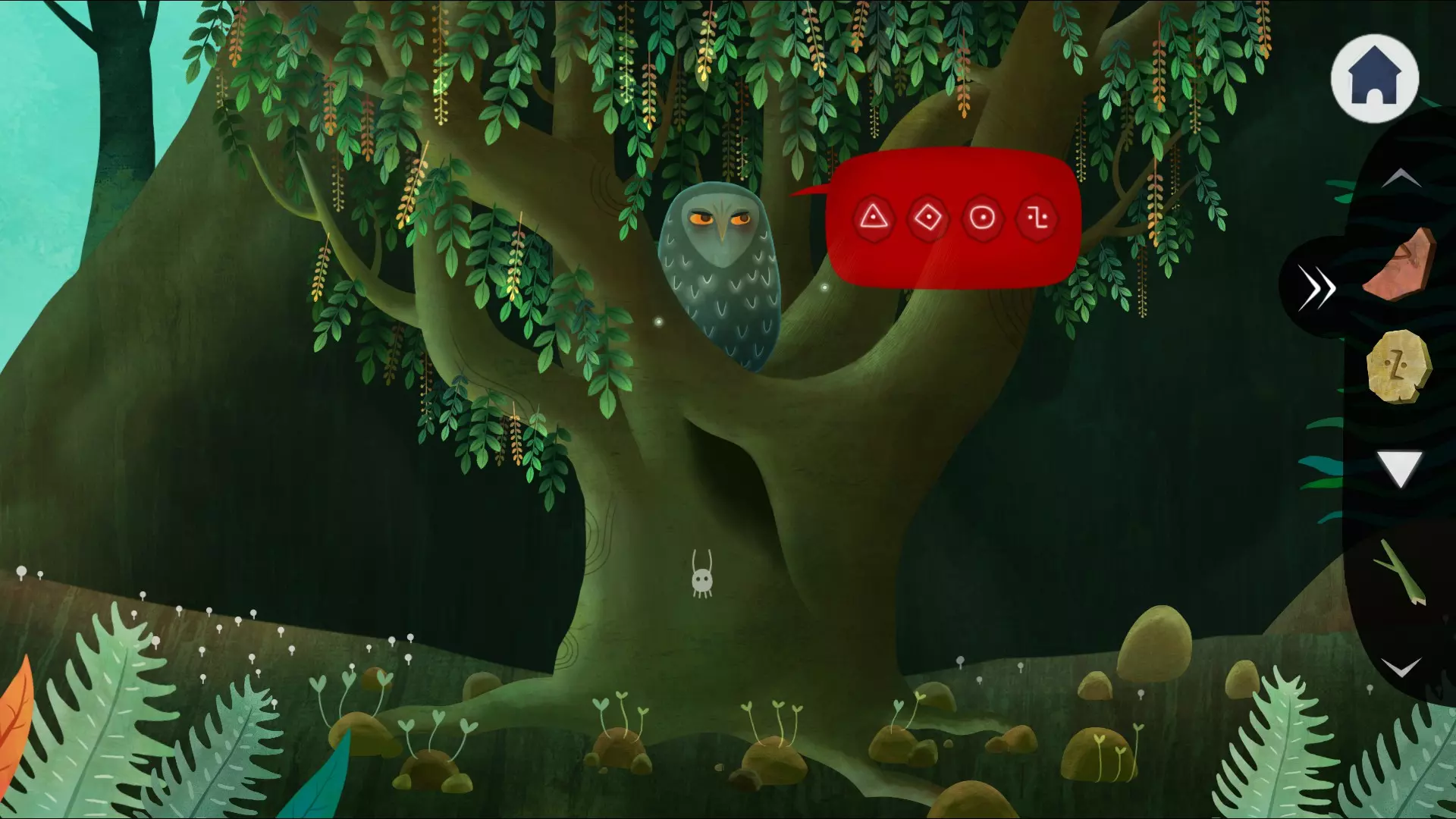接下来我们看到一个手里拿着石头的奇怪老头,向右移动并点击天花板上的贝壳。回到滴水的地方,把贝壳放在地上的水滴下方,贝壳会装满水。走向老头,将豆科种子放入他下方水壶形状的孔中,并用贝壳里的水浇灌。种子发芽后会把老头手中的石头顶掉,我们捡起石头。向右移动,最终进入花园,首先遇到一个奇怪的精灵,他说这里一只鸟都没有,猫头鹰答应给他帽子上的羽毛,却食言了。点击他旁边树桩上的植物,获得另一片金色花瓣(4)。继续前进。在蝴蝶的左边看到一张带有图案的纸条,稍后会用到,先截图保存。
