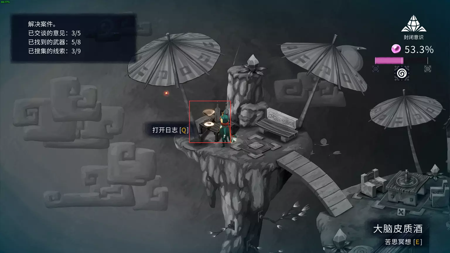 6.沉思者 在原则广场享用一点大脑皮质酒 说明:在原则广场关卡(解决案件时),调查地图上的大脑皮质酒,即可解锁成就