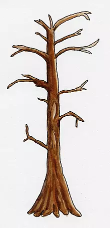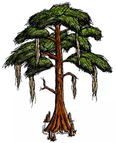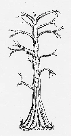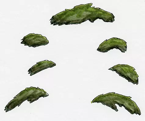 然而,即便是这种功能强大的笔,如果用彩色马克笔在笔迹上反复涂抹,也难免会出现些许晕染。因此,精灵图通常分为两层来制作,以避免此问题。 编辑器会根据精灵图的纯黑色轮廓,自动从扫描页面中裁剪精灵图。这一要求可能会严重限制艺术风格(比如无法使用潦草、模糊的边缘?),但两层制作技术同样解决了这个问题。 假设你有一些树木部分的图画,看起来是这样的: