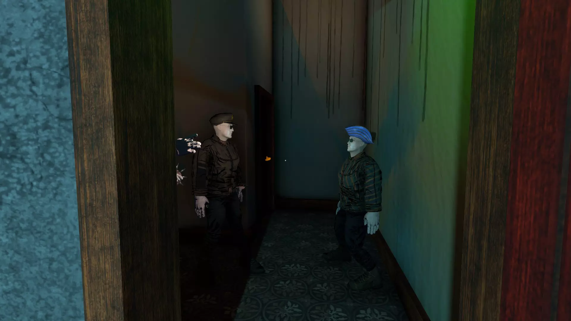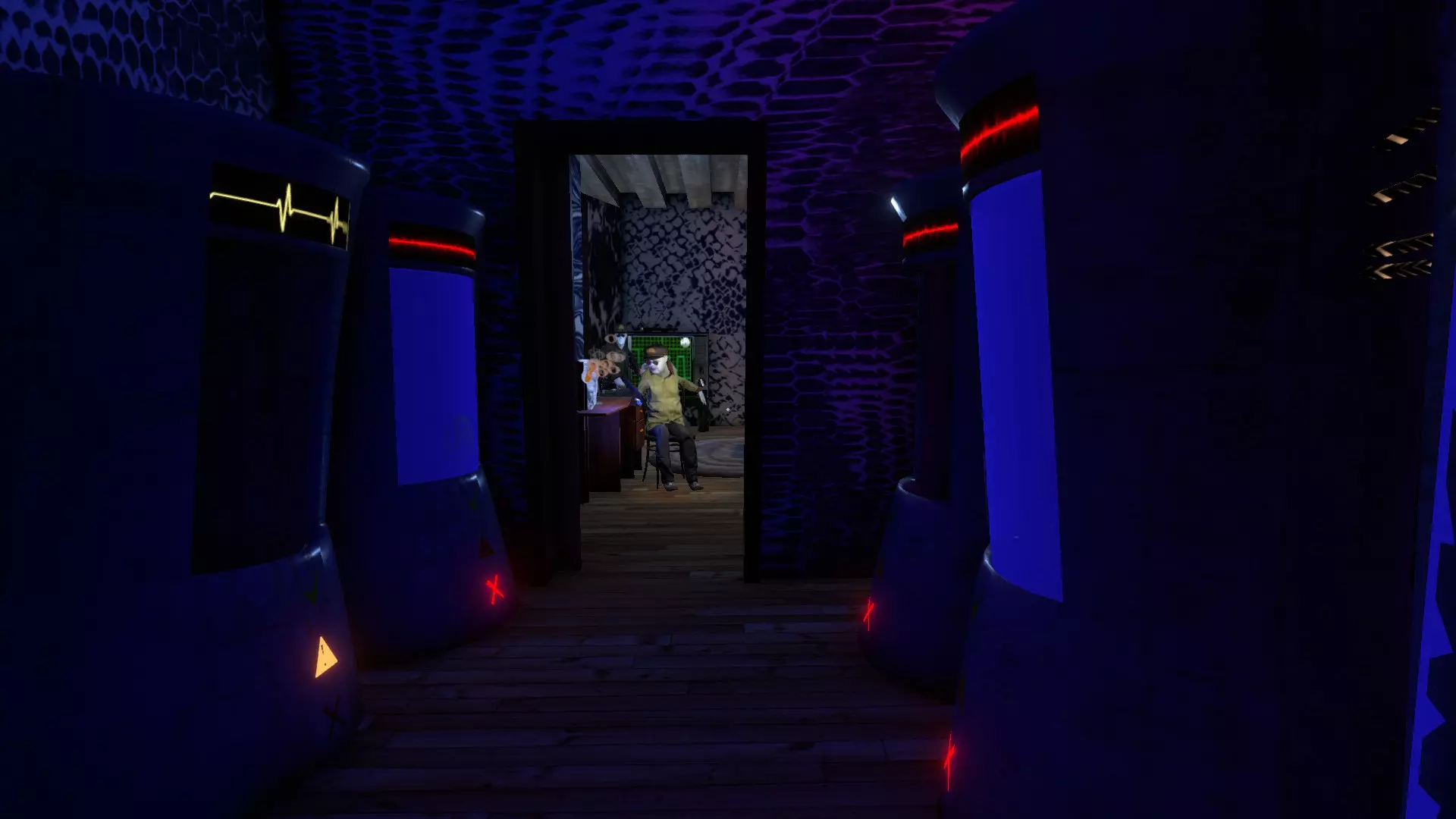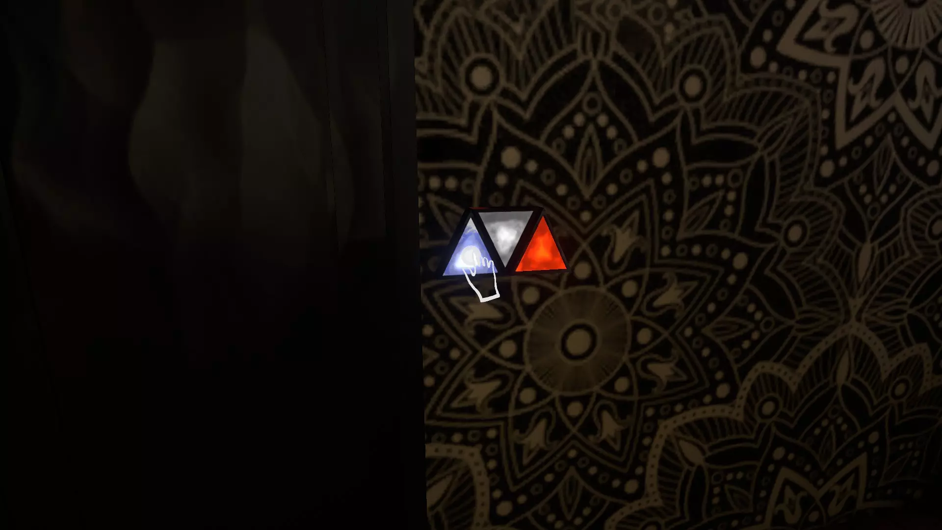 按下它,然后在走下楼梯后找到带有对应彩色三角形的门。按照指示牌上的顺序按下它们,然后通过【后门】逃离。
