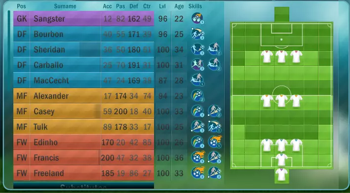 转会 你遇到的第一个诱惑可能就是进入转会市场,花费声望来提升可查看球员的年龄范围和数量。 停! 由于游戏设有青训系统,每6个月会为你提供一名青训球员,因此最好利用青训系统,并将金币用于升级 stadium(球场)和提升青训等级。我直到第四个英超赛季才开始从转会市场购买球员。那时,我只是寻找那些看起来有良好潜力的年轻球员。 组建球队 阵型