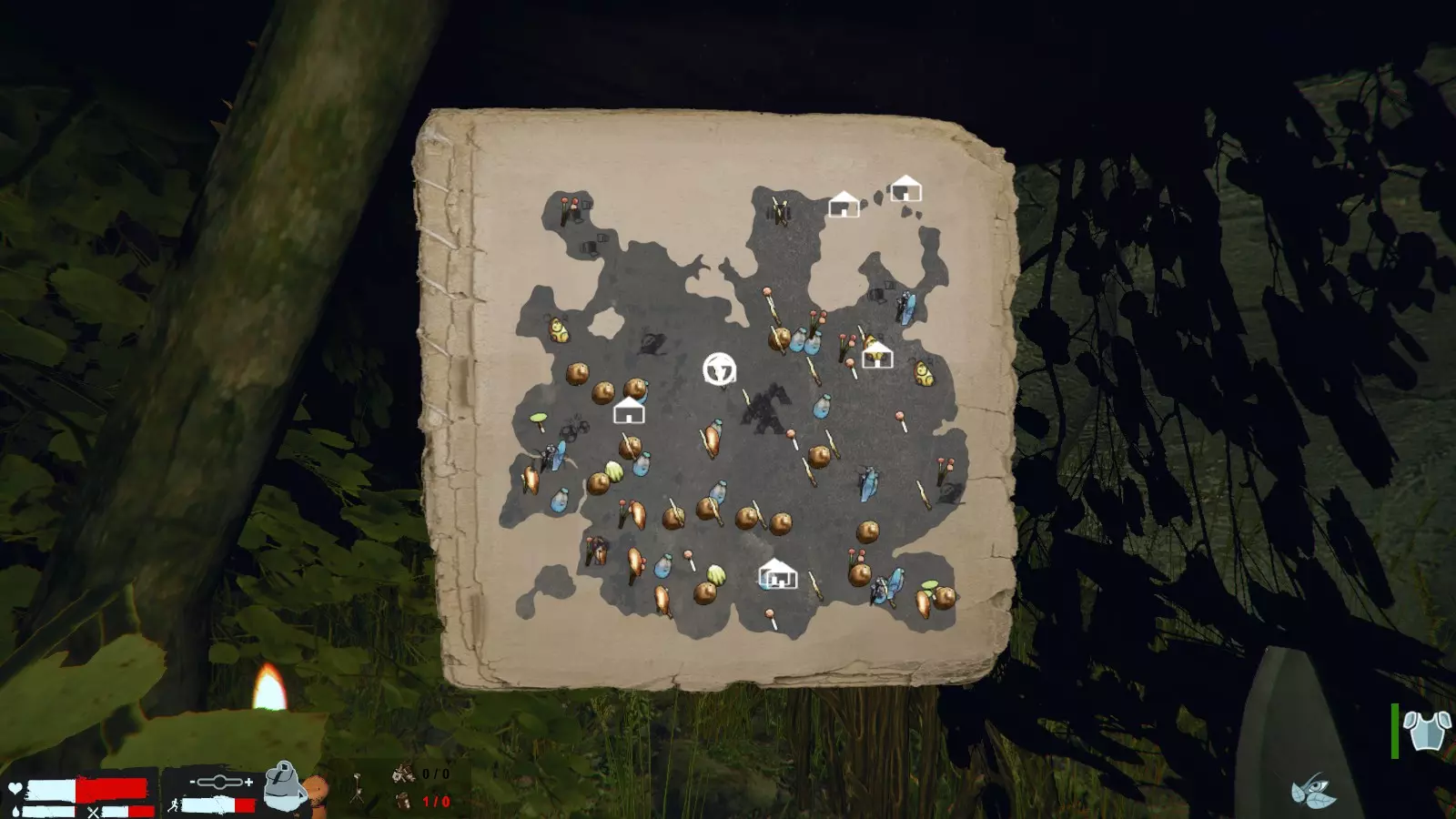 这是守护身为伤员的麦克的模式,因此除了自己的份,还需要准备麦克的食物和水等物资。夜晚会有外星人来袭,所以尽量想在白天完成各种准备工作。不过在第1到10天左右,只要准备一些投矛,就能勉强抵御夜间的袭击。基本上,敌人会优先攻击靠近的麦克,所以自己不会受到攻击。但要注意,一旦对敌人造成伤害,它们就会转向攻击你。在围墙和陷阱完成之前,让麦克适当吸引敌人注意力,自己从后方用长矛持续攻击是个不错的办法。那么接下来是标题的说明,建议将可以保存的家建在麦克风附近。熟练的玩家可以在建家前花几天时间处理其他事务,新手或者担心出意外的话,就优先处理。竹子长在麦克风正前方,建家最好带屋顶(因为龙会来到基地,方便快速躲藏)。 接下来是为美食家麦克老师和自己确保食物及水源。因为每天彼此的食量都相当大,水源方面,附近左下角有6个,右下角有3个,附近还有水蚁。建议在水源上方从左下到右下种6个,再往上,然后规划好通往家的路线。要注意附近有敌人。右边的水源附近有强敌野猪在徘徊,用长矛攻击7-8下可以打倒它。在因敌人袭击而获得大量肉之前的几天里,通过打倒野猪可以获得3块肉,所以要瞄准它。能喝的蚂蚁和能吃的毛毛虫等食物,美食家麦克先生是不会吃的,所以肉和水要优先给麦克。第一天首先要建造房屋(一天内建不完也没关系),但由于无法保存进度,为了避免死亡,建议制作可以悬挂水和肉的物品以及烤肉工具,这样会更轻松。要确保水和食物的供应,在夜晚来临前制作一定数量的投矛,有20根的话会比较稳妥。可以计划在基地周围建造围墙(慢慢建造即可),提前建好框架后,后续只需添加材料就能完成,非常方便。 水边的油果可以用来制作火把,如果有多余时间可以收集一些,这样夜晚会更容易看清周围。 之后在敌人增多之前,要建好围墙并常备投矛。 除了竹子和可以无限获取的资源外,水等资源在第二天会刷新。关于陷阱的内容将在下一章节进行说明。 这张地图是我在50天达成时的状态,只获取了基本物品。个人而言,由于觉得在剧情中使用消耗水晶的作弊道具以及探索比较麻烦,所以没有进行这些操作。 夜晚要为外星人的袭击做好准备。