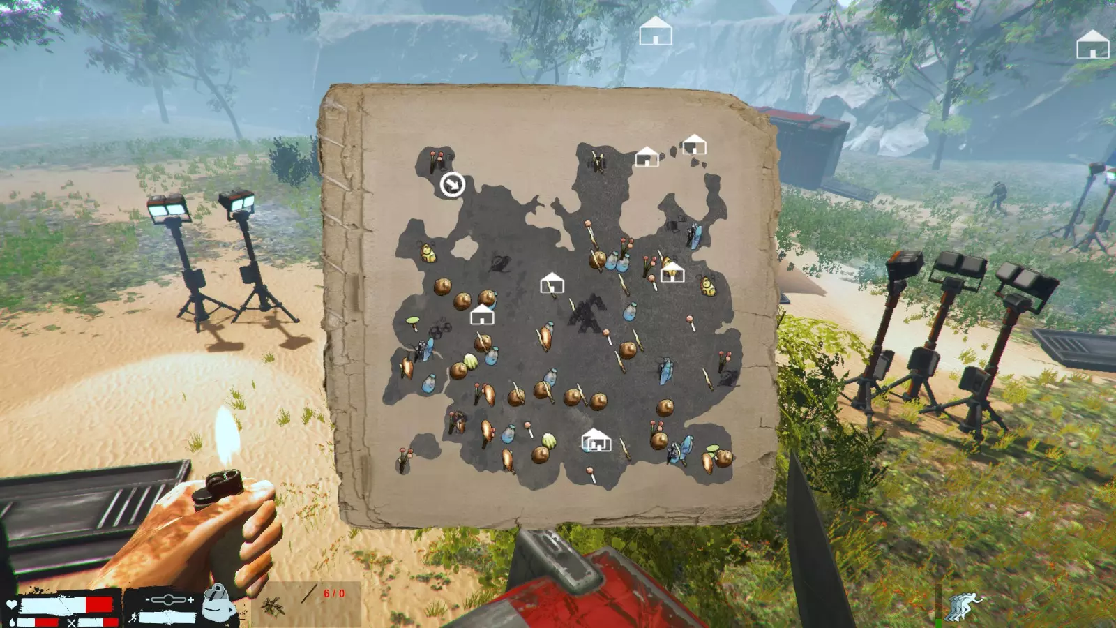 在地图左侧那个奇怪标记的位置,用那里的材料和无人机掉落的素材制作无人机滑板。说实话,这东西很难驾驶,所以制作它不是为了乘坐,而是因为制作出来后它的头灯会一直亮着。把它正对着前方放置,这样在夜间遭遇袭击时,正前方就能看得相当远。希望能让生存稍微轻松一点,或者想进行探索的玩家可以试试这个方法。