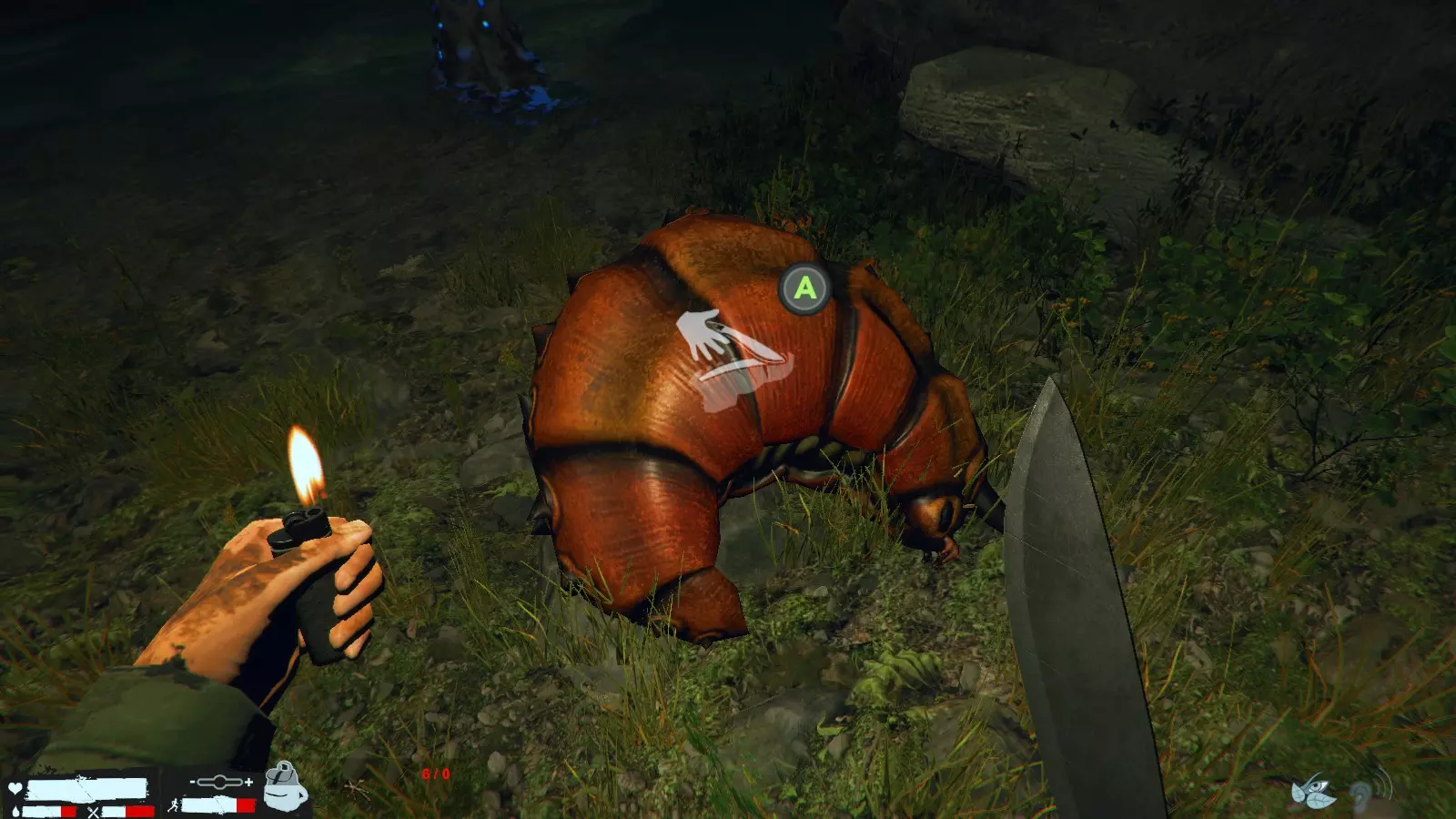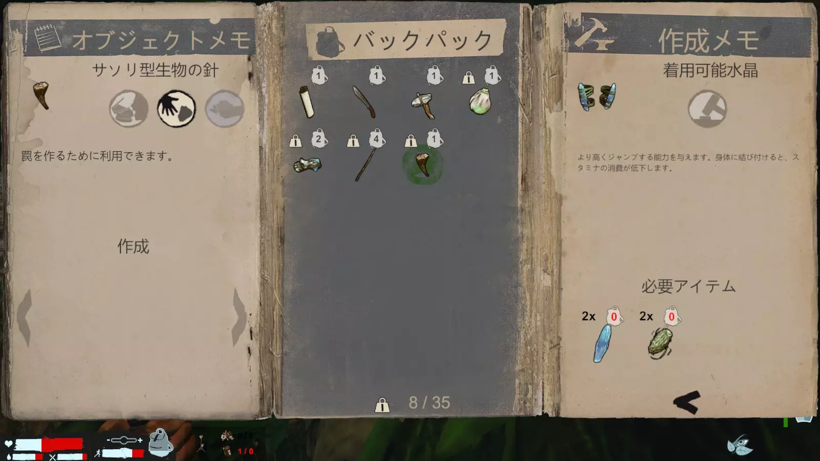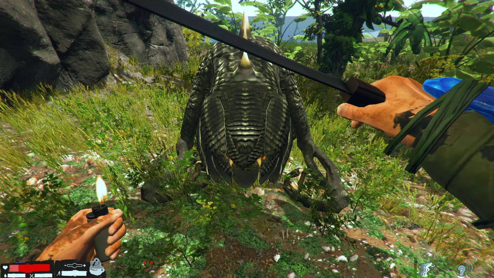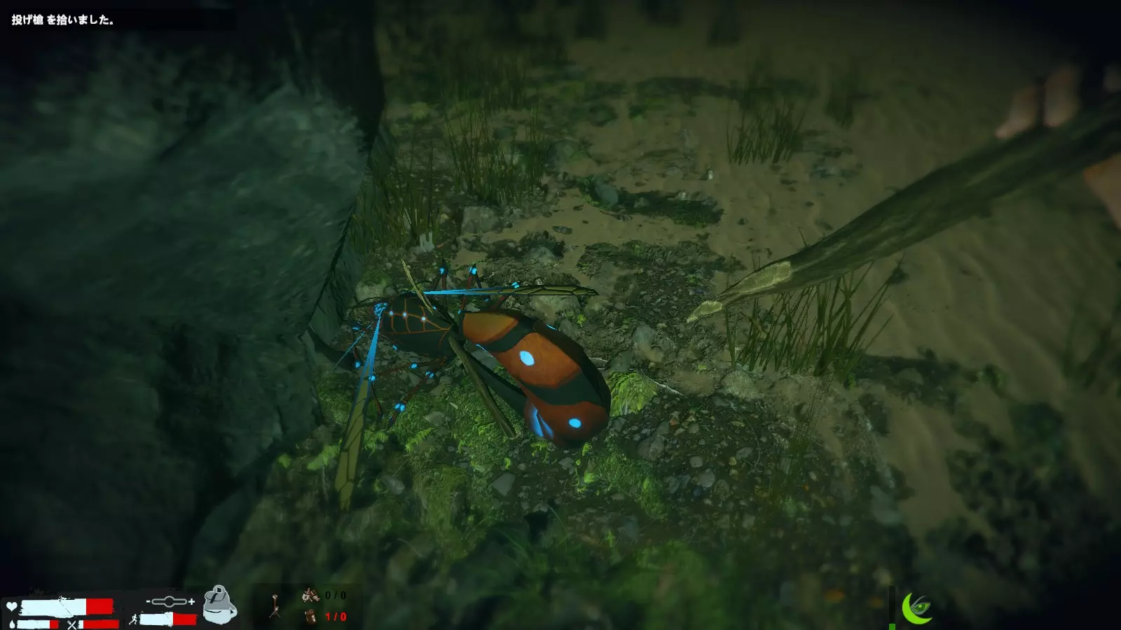 如果被龙盯上了,就躲到草丛之类的地方吧,右下角的图标是隐藏图标,但说实话,感觉除了对龙之外没什么用。 还有很多其他的,但这里就不多说了,另外,不管是剧情还是生存模式,探索的时候最好至少带上一份水和食物。 巨型虫子素材的使用方法