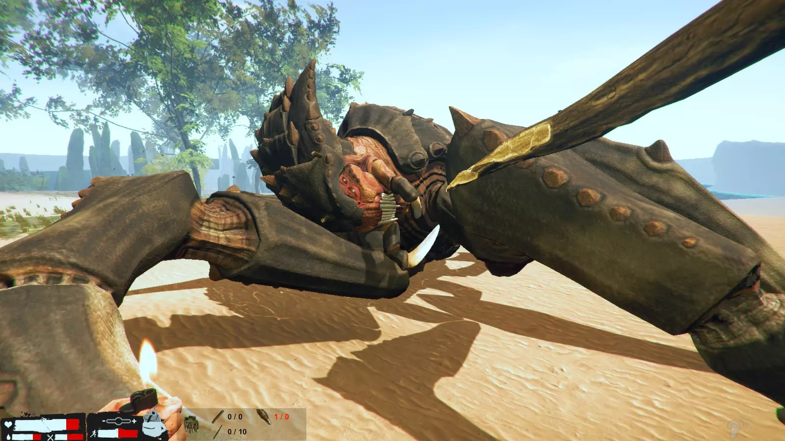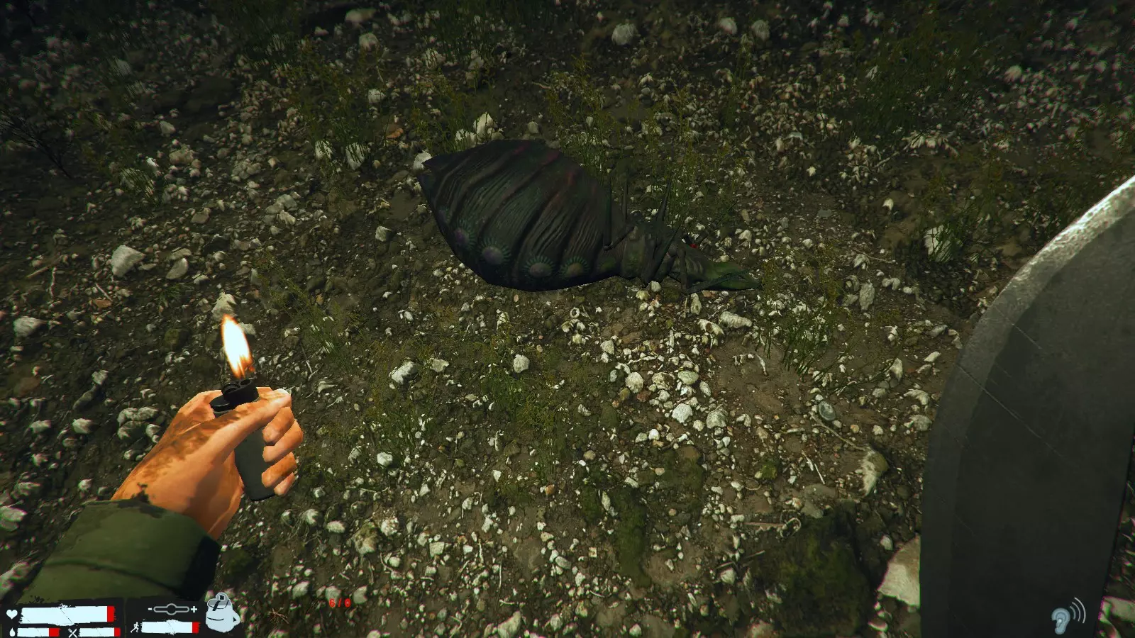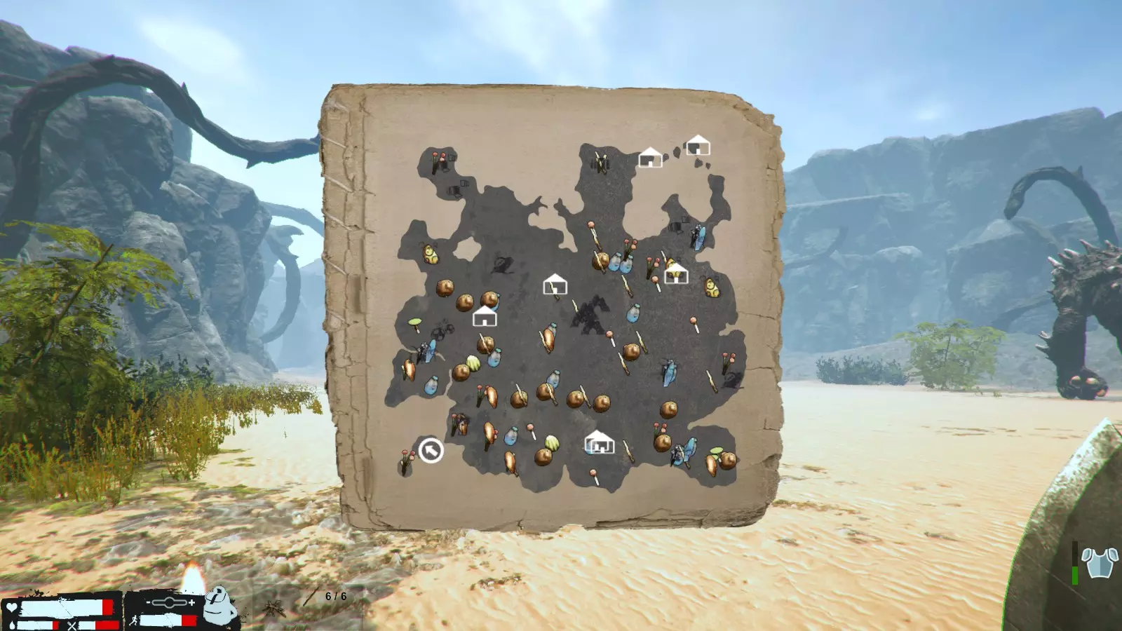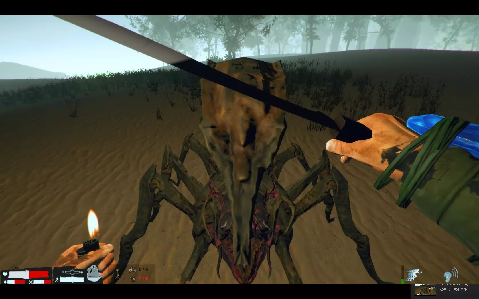 如果被龙盯上了,就躲到草丛之类的地方吧,右下角的图标是隐藏图标,但说实话,感觉除了对龙之外没什么用。 还有很多其他的,但这里就不多说了,另外,不管是剧情还是生存模式,探索的时候最好至少带上一份水和食物。 巨型虫子素材的使用方法