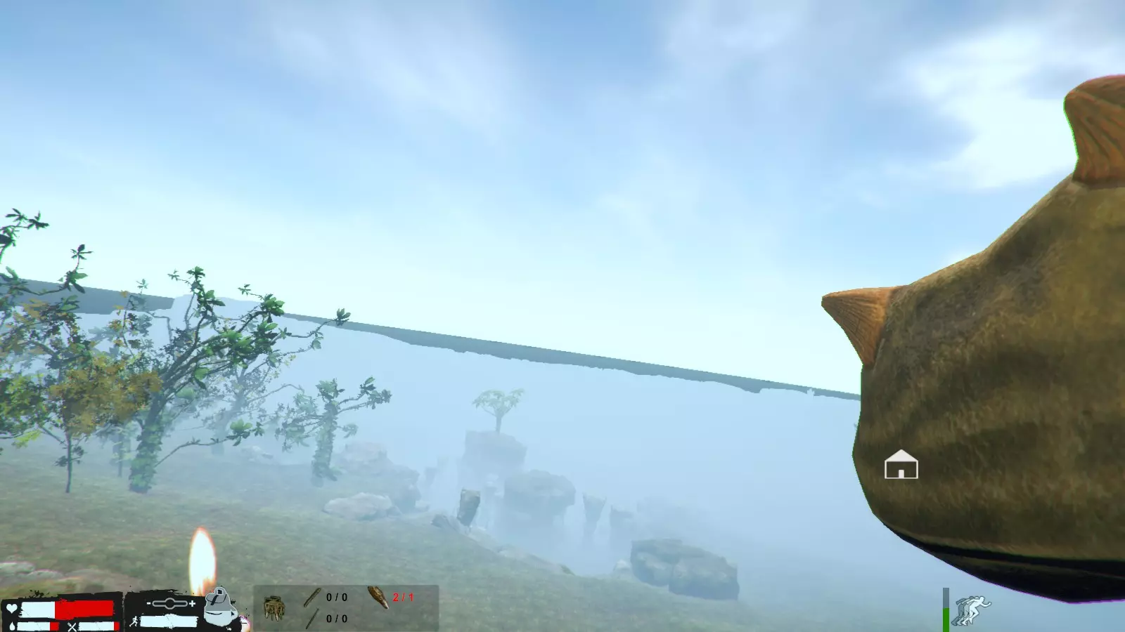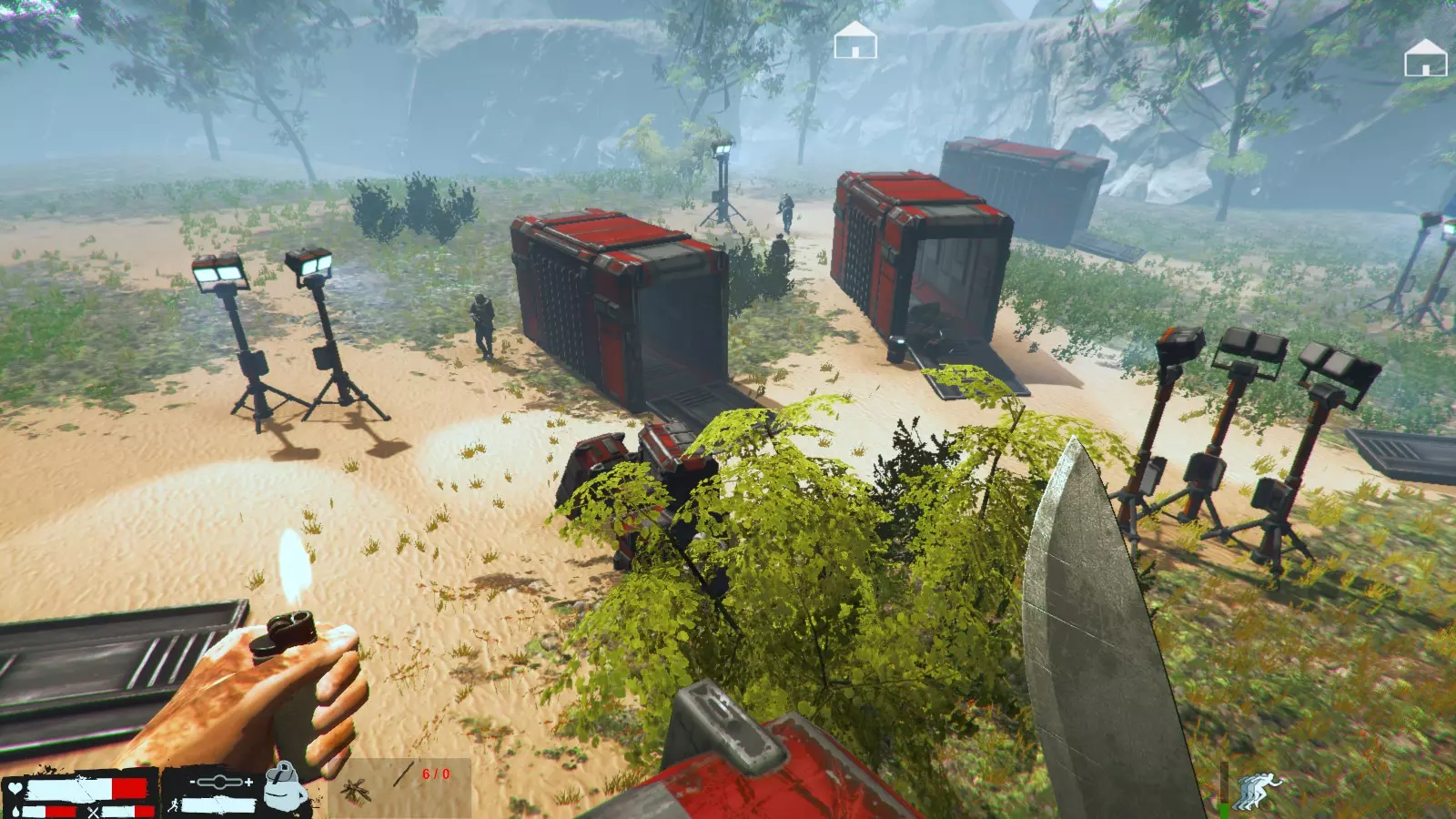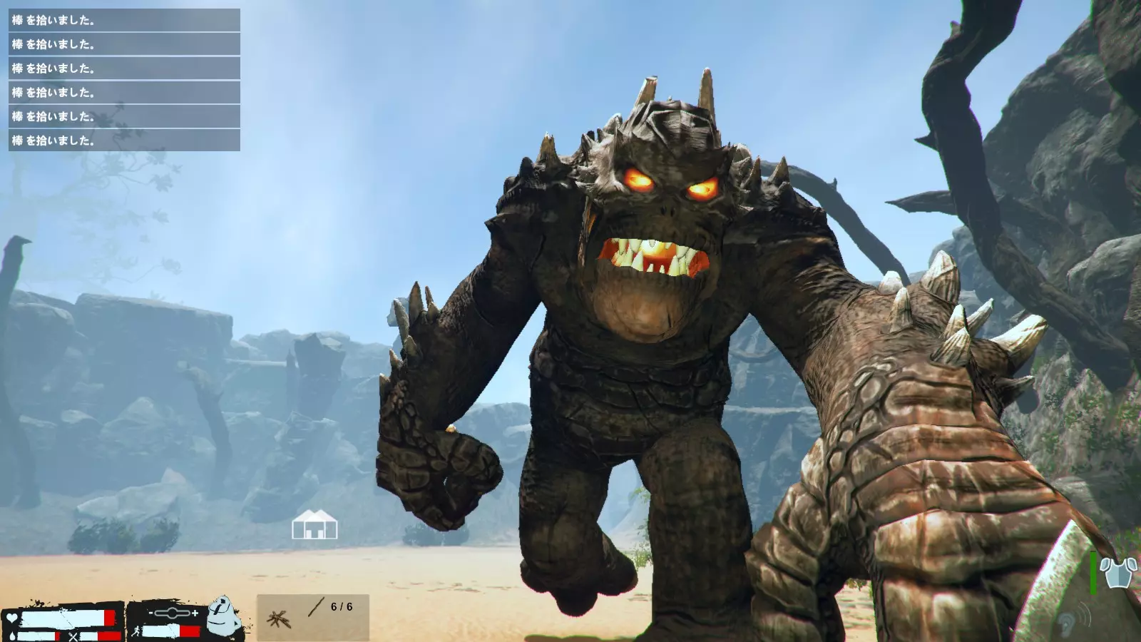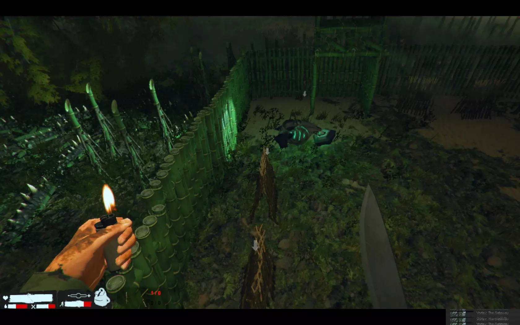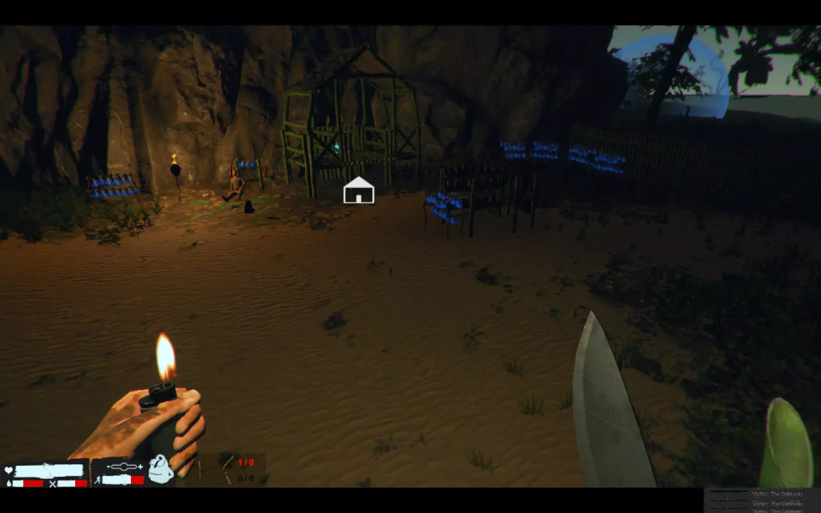 到了夜晚,麦克风开始说话就是袭击来临的信号。 初期敌人数量只有几只,但随着天数增加会越来越多。敌人种类方面,从麦克风的视角看,主要从正前方和右侧发动攻击,左侧基本不会有敌人,但也并非绝对。虽然没有后续验证,但感觉敌人主要从主角附近发起攻击。 游戏中期开始,仅靠投枪将难以应对,这时就轮到陷阱发挥作用了。如果可以的话,建议从初期就开始制作陷阱,但外星人的骨头和制作障碍陷阱所需的皮革很难获取。其他陷阱虽然可以制作,但重新设置非常麻烦,所以不推荐。推荐的陷阱是骨制陷阱和障碍陷阱。制作方法就不细说了,骨制陷阱只需一块外星人骨头,障碍陷阱则需要两根椰子,两者都能重新设置,这是相当大的优势。椰子是无限资源,外星人骨头则是来自外星人的资源。 不过初期阶段无法正常制作这些陷阱。就算能做出骨制陷阱,在敌人数量少的时候,制作陷阱所用的骨头还得留着用于重新设置,而且白天还可能有猪或鸟触发陷阱,导致骨头不够用。到了中期和后期,骨头就会多到用不完啦。至于障碍陷阱,初期敌人几乎不会掉落皮革,所以这类陷阱都能设置好之后,后续就会变得很轻松。不过敌人中有些似乎不受陷阱影响,或者说是存在bug,基本不会触发陷阱,所以千万不要过度自信。外星犬和双手持锤的锤兵这两种敌人尤其如此。它们有时还会穿墙,一定要多加注意。 游戏初期的袭击很快就会结束,但之后袭击会持续到清晨。判断袭击是否结束的大致标准是,当角色通过麦克风说类似“谢谢”的话时,基本就结束了。不过,袭击时有些卡在某处的敌人可能会在白天出现,所以不能说百分百安全。顺其自然吧w 关于图片,是从麦克风视角右侧,墙边设置了5个左右有一定间隔的障碍陷阱。之后像这样设置陷阱的话,右侧几乎可以完全放心不管,到早上敌人就全灭了,因为不知为何右侧不会出现无视陷阱的敌人。 正前方这样设置会很方便。