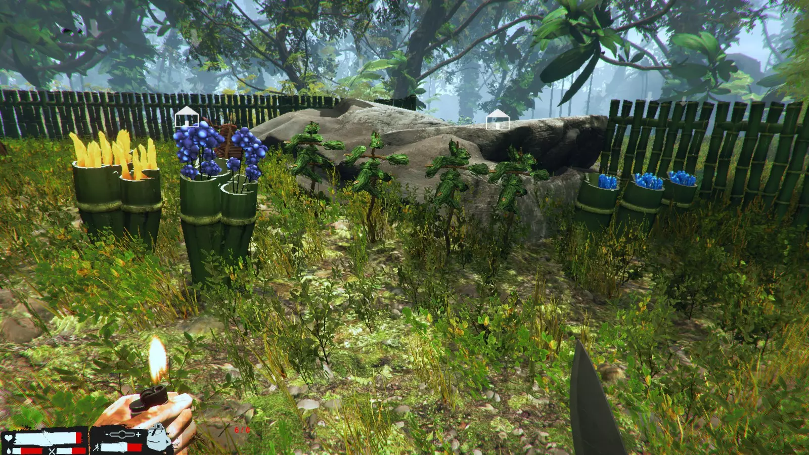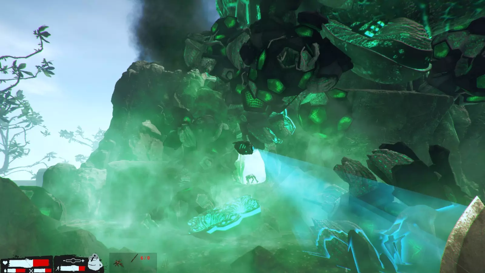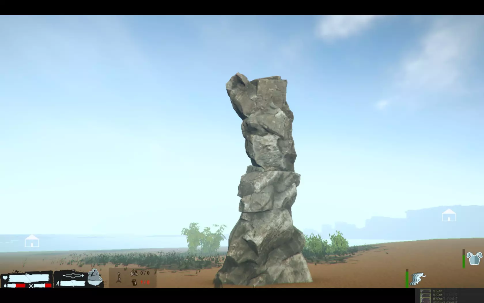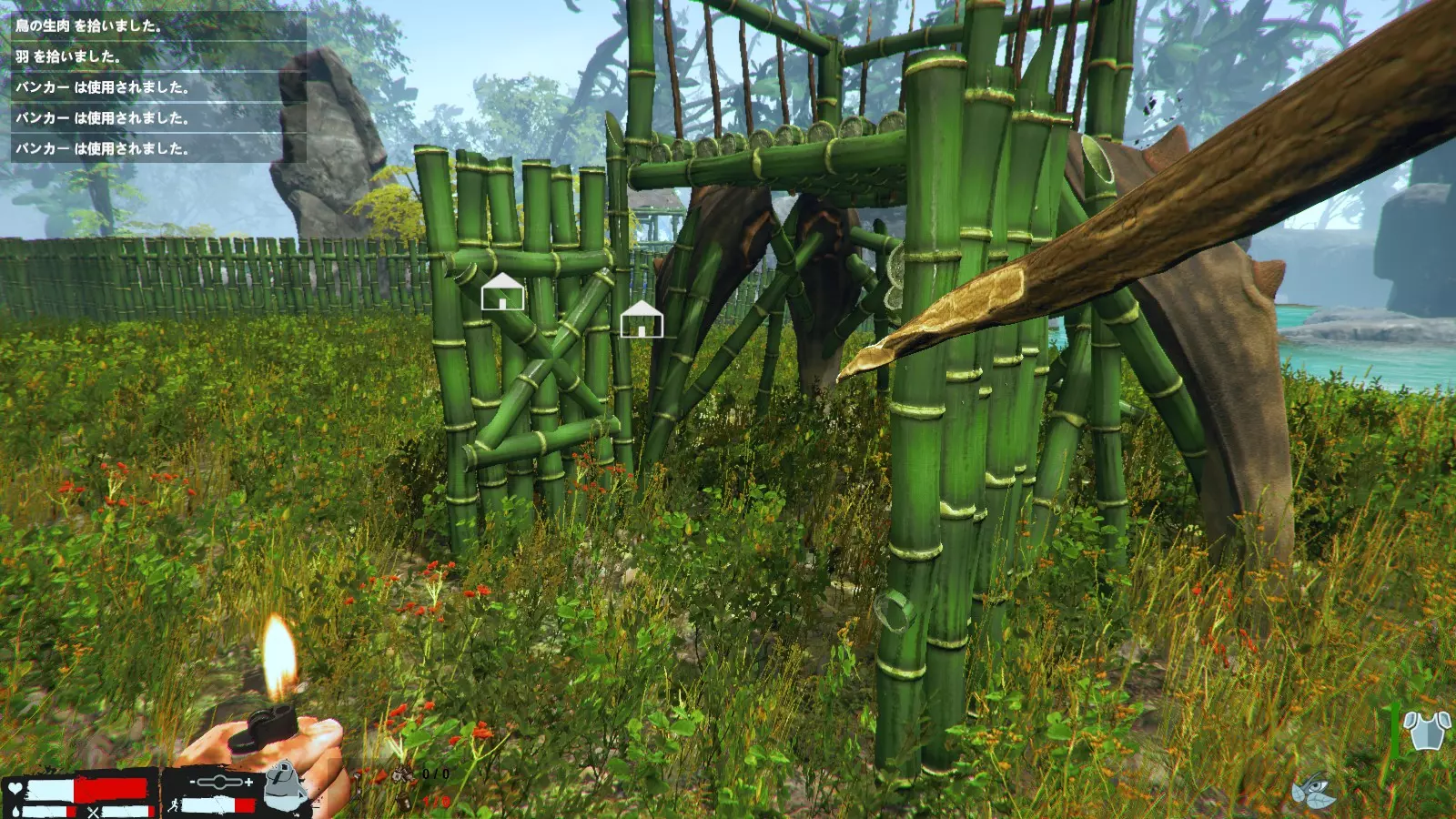 如果只是往返基地,就算用了水晶作弊也来不及。当你想携带大量素材,却觉得水晶和椰子太碍事时,可以在地图各处像这样放置水晶和椰子,这样即使水晶作弊效果消失也没问题。不过要注意,敌人所在的地方东西会被破坏或遭到袭击,所以要慎重选择位置,最好选在水晶和椰子等资源附近。没有枪,也没有逃生的地方,最坏的情况下只能用砍刀硬上了!