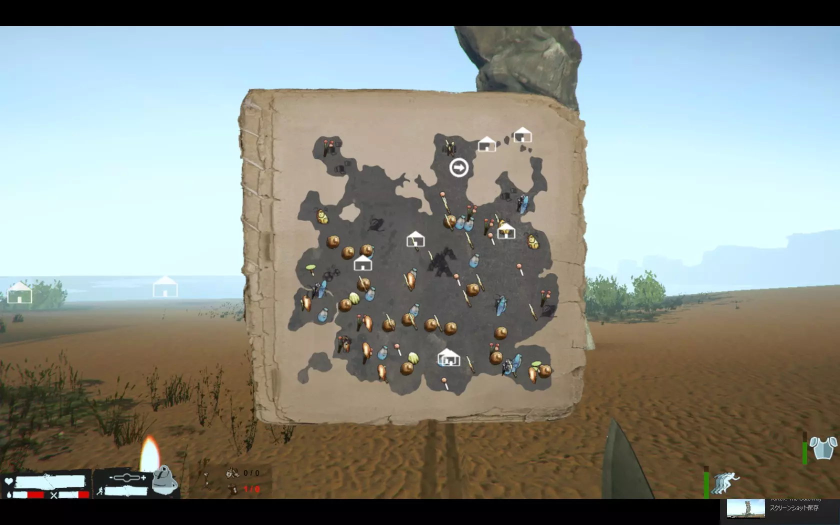 如前文所述,左图展示的是制作水晶作弊道具所需的材料:2个椰子、2个水晶,以及尚未实装的可用于陷阱的蝎子型生物的毒针。 右图则是装备水晶道具后被龙抓住,在空中“游泳”的场景。由于装备水晶道具时能使龙的攻击无效化,所以完全不用担心。 接下来打算在中继地点建立据点。