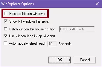 从这些选项中,取消勾选【隐藏顶部隐藏窗口】并点击【确定】。