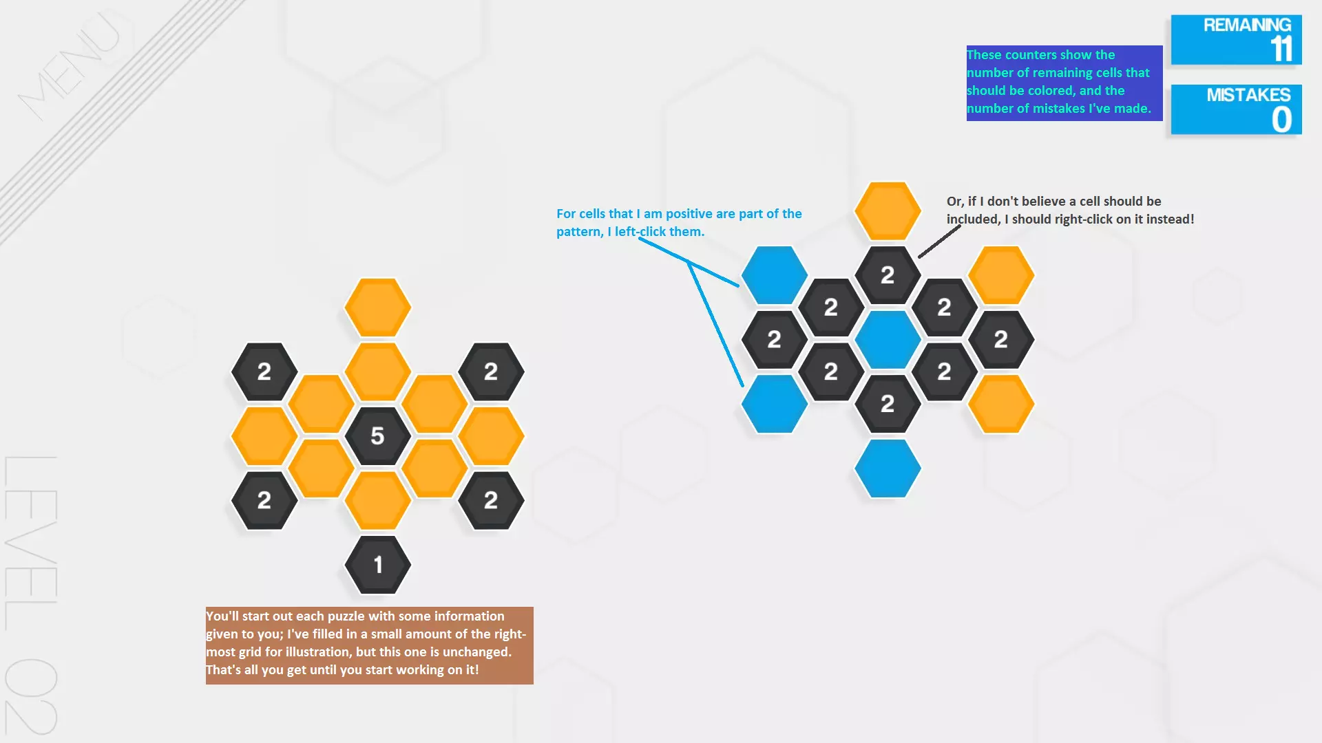 为方便查阅,此处整理了游戏说明。游戏仅在首次遇到机制时进行解释,且没有帮助菜单或其他便捷参考。 通用操作:左右点击及六边形数字