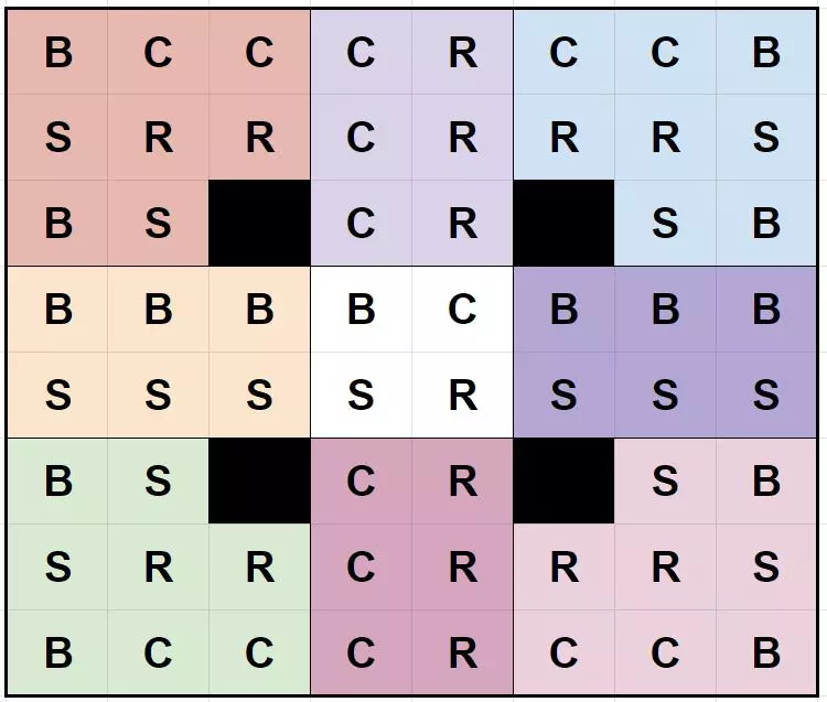 然后种植4种类型的花朵,确保每个区域中每种类型的花朵数量相同。(颜色无关紧要,仅用于辅助可视化)