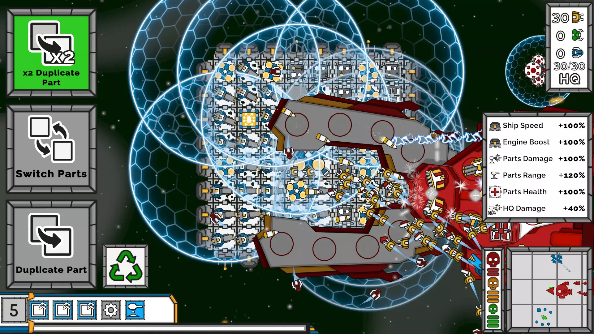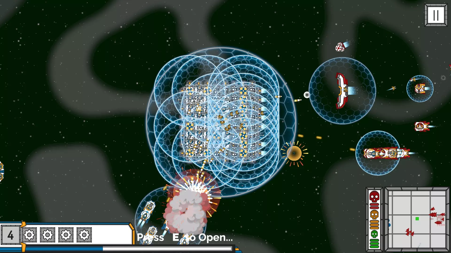 如何通关游戏? 升级什么:优先升级【加农炮】和【护盾】,尽可能升到最高级。 如何布局:首先通过小行星获取一些升级,刷资源直到拥有一些加农炮。接下来在后方(基地右侧)放置一排护盾——如果愿意,也可以使用墙壁,但实际上并非必需。所有加农炮应放在前方(左侧)。然后可以使用一些【拆解无人机】和/或【工程师无人机】作为支援(将它们放在基地的顶部或底部)。最后,务必升级【基地护盾】。 操作方法:按A键(或你用于向左移动的按键)。