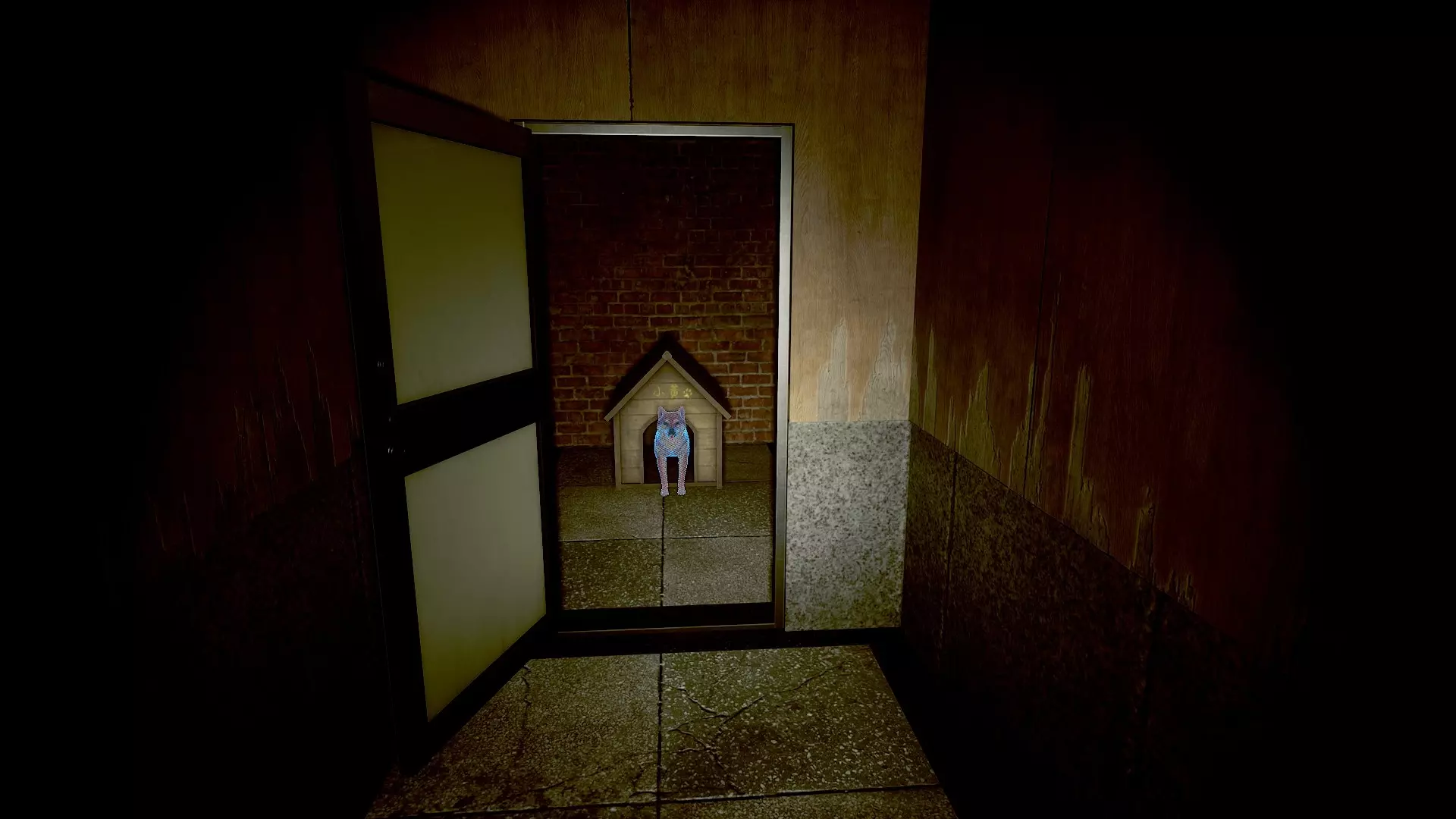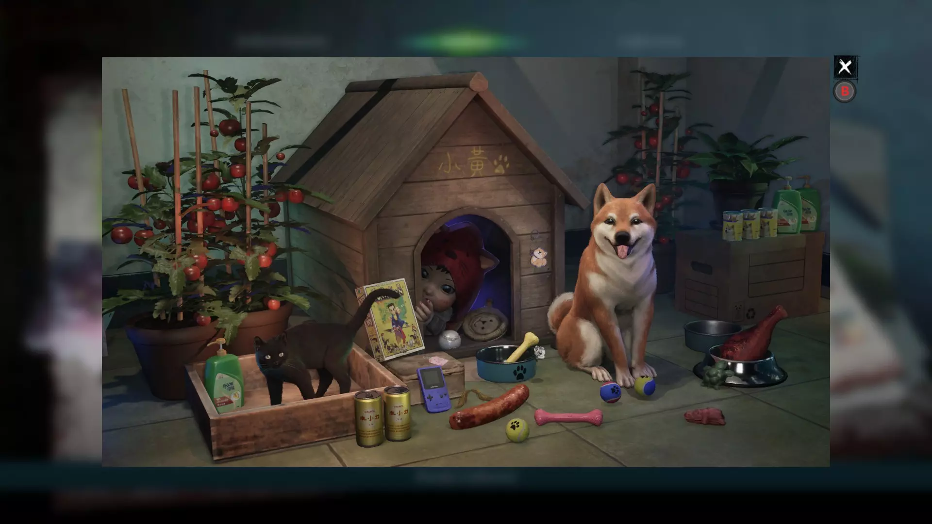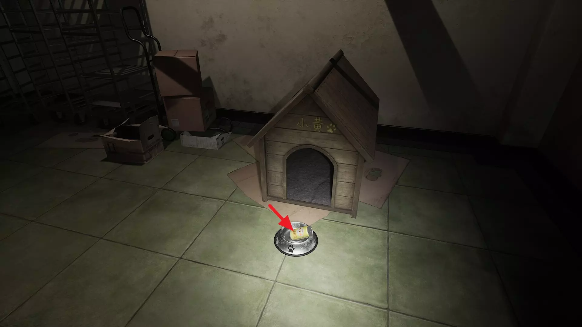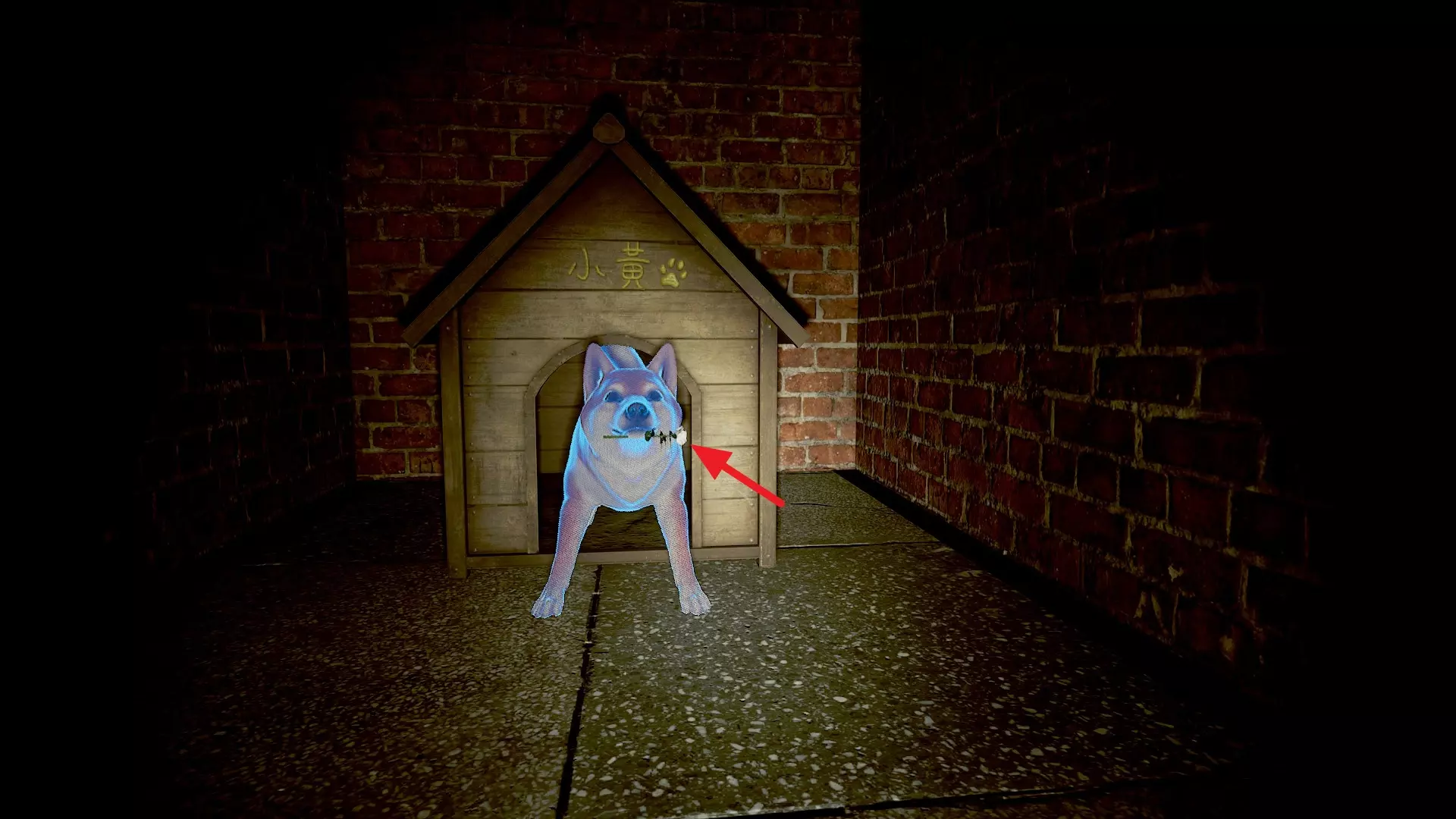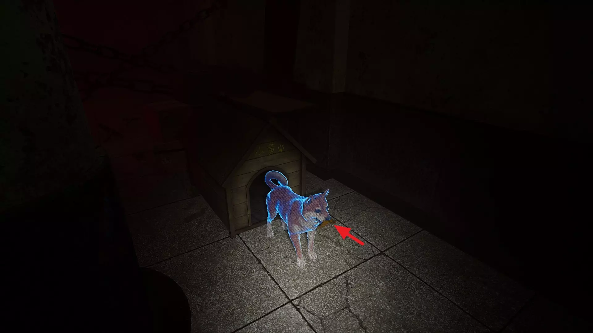 1. 在B1食堂的黄警官附近获取一罐苏打水。 2. 向狗舍打招呼后,走上楼梯。此时狗舍前会出现一个狗食碗,并伴有声响。 3. 将苏打水放入狗食碗中。 第二章 - (2)转向小镇 <第二章 - 闹鬼娃娃的恐怖屋>