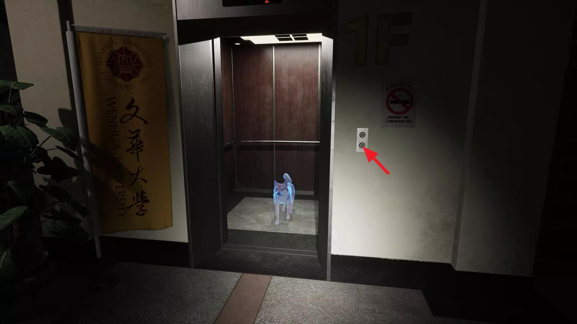 1. 按下一楼的电梯按钮 2. 等待小狗出来。 完成