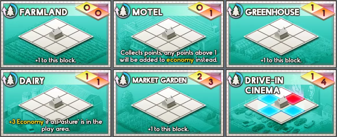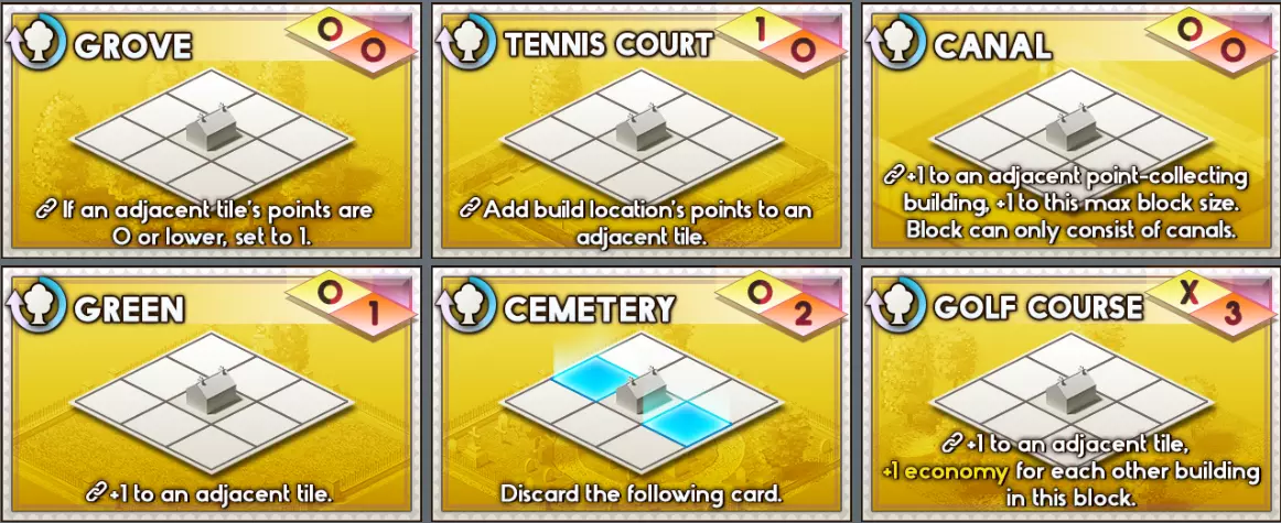 卡牌 解锁等级 类型 经济点数 消耗成本↓ 描述 可在卡牌商店购买? 树丛 2 娱乐 0 0 联动:若相邻地块点数为0或更低,将其设为1。 否 网球场 18 娱乐 1 0 联动:将建造位置的点数添加至相邻地块。 否 运河 8 娱乐 0 0 联动:为相邻的点数收集建筑+1,为此地块的最大区块尺寸+1。区块只能由运河组成。 否 绿地 0 娱乐 0 1 联动:为相邻地块+1。否 墓地 6 娱乐 0 2 弃置以下卡牌。 否 高尔夫球场 16 娱乐 X 3 连接:为相邻地块+1,为本街区每有一个其他建筑+1经济。 - 乡村 -