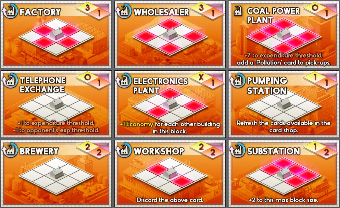 卡牌 解锁等级 类型 经济点数 消耗成本↓ 描述 可在卡牌商店购买? 工厂 0 工业 3 1 是 批发商 1 工业 3 1 否 燃煤发电厂 5 工业 0 1 支出阈值+7,在拾取卡中添加一张【污染】卡。【单次使用】 否 电话交换机 10 工业 0 1 支出阈值+1,对手支出阈值-1。 否 电子工厂 9 工业 X 1 本街区每有一个其他建筑,经济+1。- 政府 - 否 泵站 25 工业 1 1 刷新卡牌商店中的可用卡牌。 否 酿酒厂 0 工业 2 2 是 工坊 13 工业 2 2 弃置上方卡牌。 否 变电站 11 工业 1 2 此最大区块大小+2。