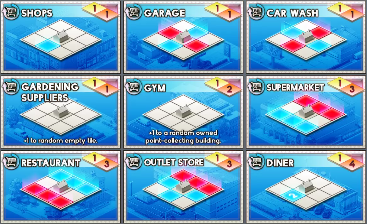 卡牌 解锁等级 类型 经济点数 消耗成本↓ 描述 卡牌商店可购? 商店 0 商业 1 1 是 车库 0 商业 1 1 是 洗车店 0 商业 1 1 是 园艺用品店 0 商业 1 1 随机空地块+1 否 健身房 7 商业 1 2 随机已拥有的积分收集建筑+1否 超市 0 商业 1 3 是 餐厅 0 商业 1 3 是 折扣店 24 商业 1 3 否 小餐馆 17 商业 1 4 否 - 工业 -