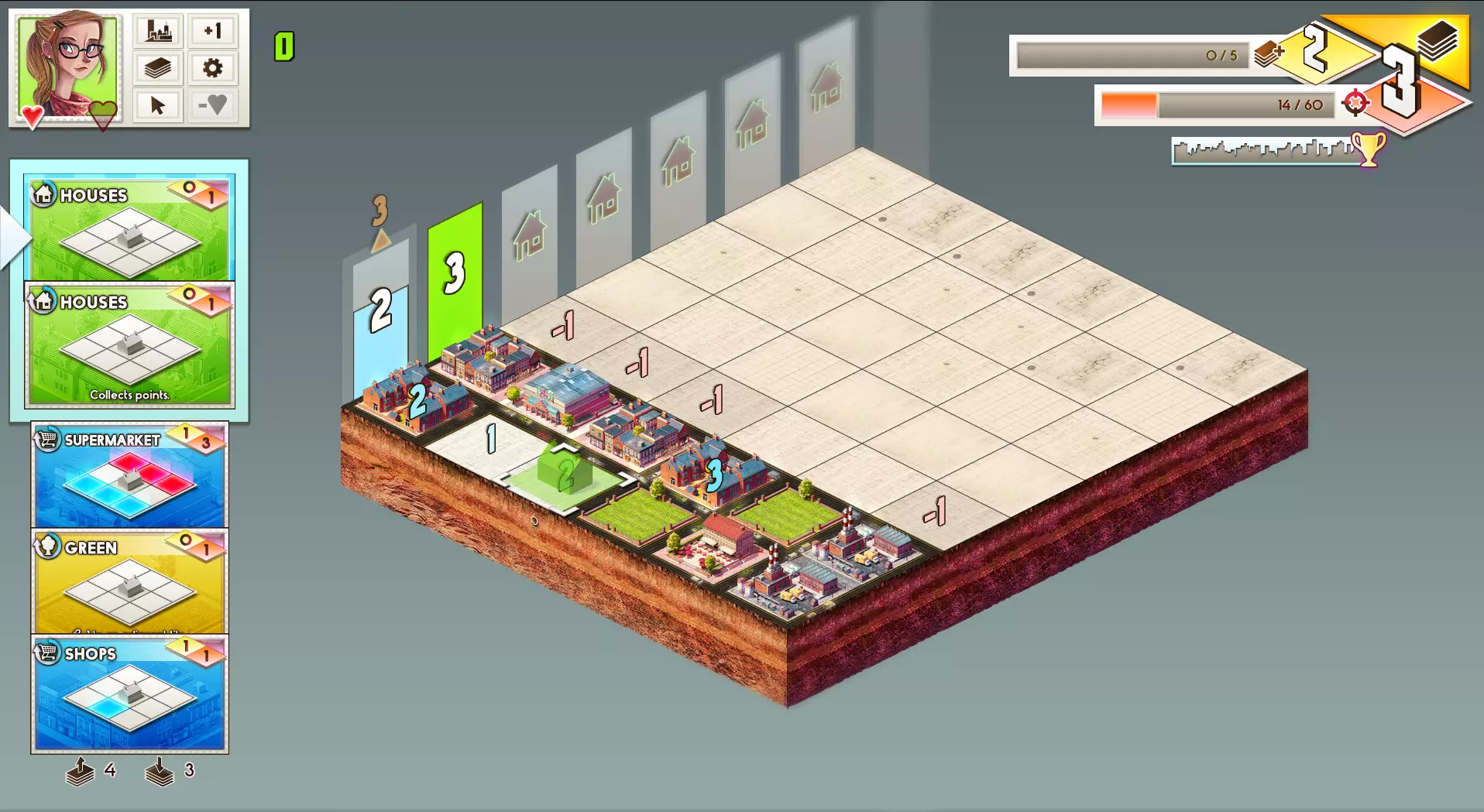 这套卡组比默认卡组拥有更多的工业建筑,能让你更快获得购买点数。它还有一个更易执行的模式,基于连贯的排列方式:将最上面两行预留出来建造工业建筑,并通过一排绿地作为缓冲区将其与住宅区隔开。然后在最下面四行按照【绿地->住宅<-洗车店->住宅】的布局来获取分数。当你获得用于购买的经济点数后,就可以按照自己的意愿调整卡组。在完成不同的游戏流程获取经验的过程中,你将解锁更多初始卡牌可供选择。