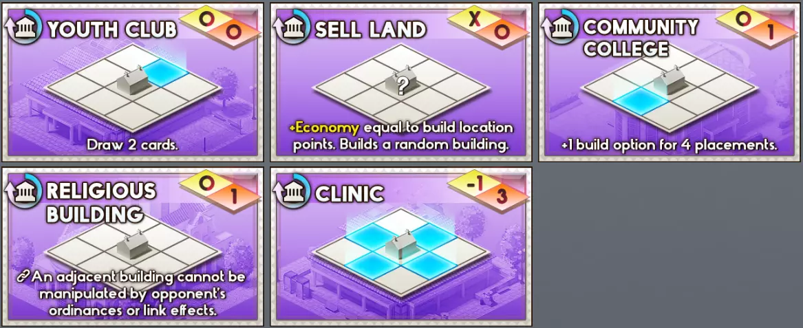 卡牌 解锁等级 类型 经济点数 消耗成本↓ 描述 可在卡牌商店购买? 青年俱乐部 3 政府 0 0 抽2张牌。 否 出售土地 20 政府 0 0 获得等同于建造地点点数的经济值。建造一个随机建筑。 否 社区学院 19 政府 0 1 4次放置阶段中+1建造选项。 否 宗教建筑 4 政府 0 1 链接:相邻建筑不会受到对手法令或链接效果的影响。 否 诊所 12 政府 -1 3 - 娱乐 - 否