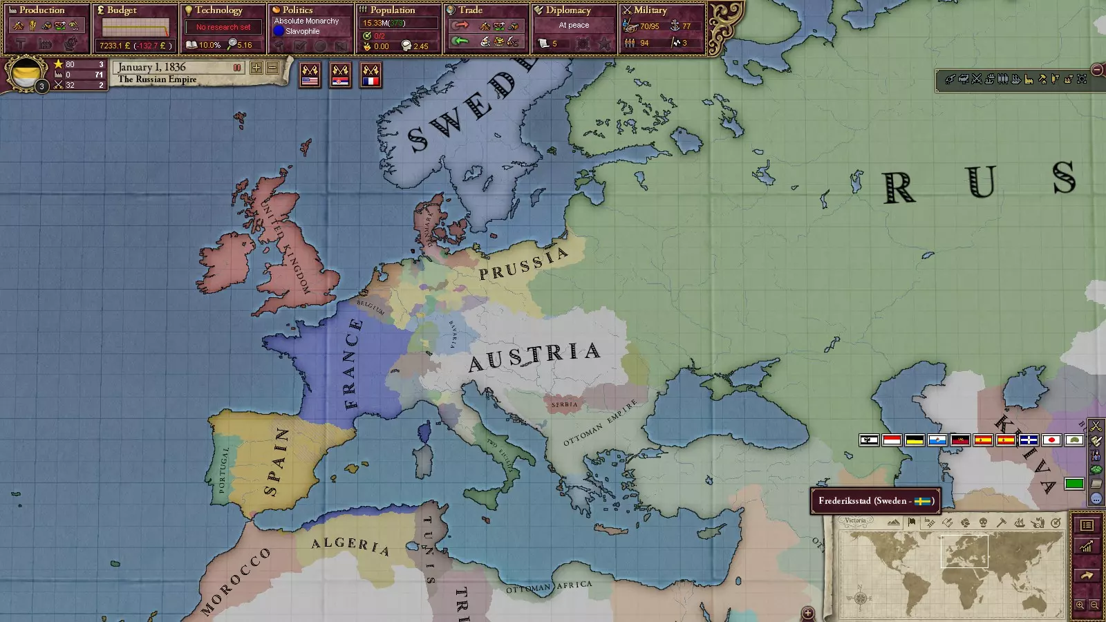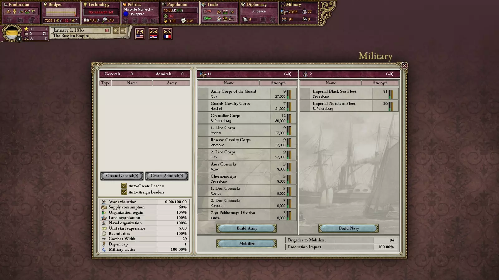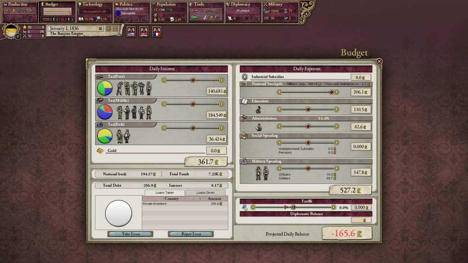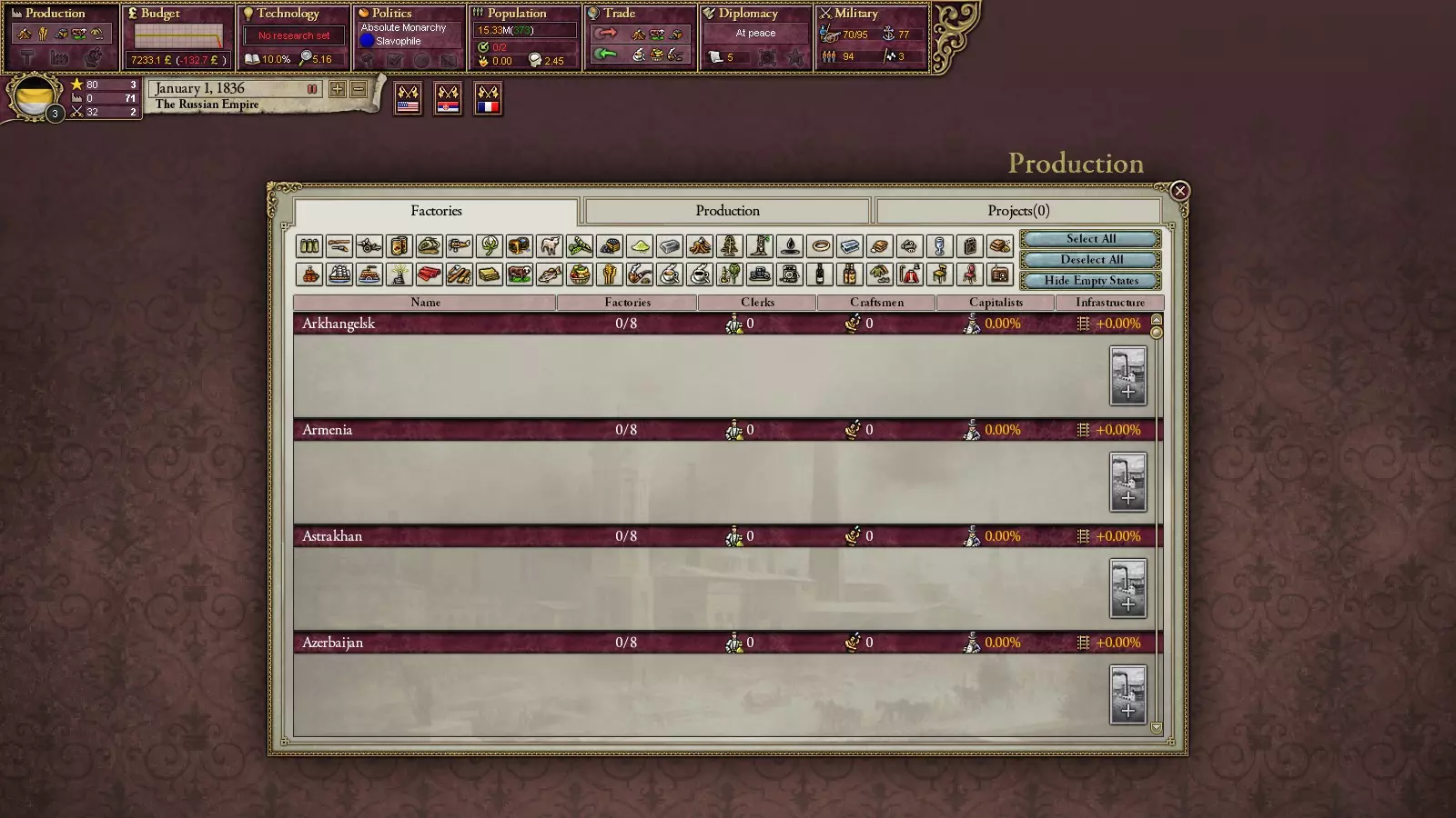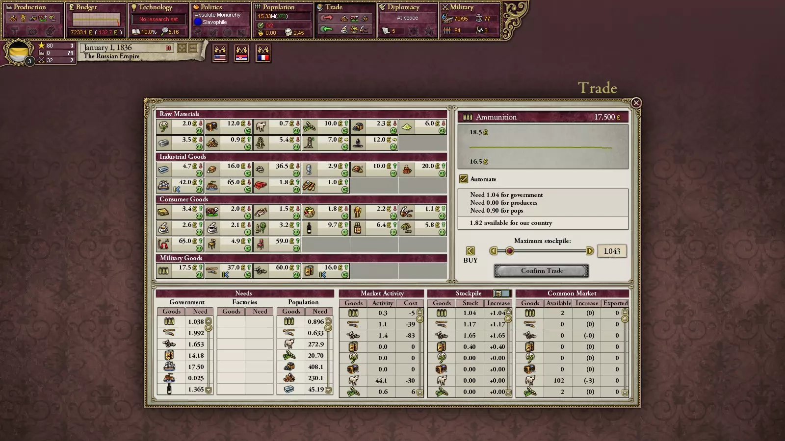 叛乱分子会从你的军队中组建旅团。具体方式如下:士兵中存在隶属于各类叛乱组织的成员。这一点很容易确认:点击任意旅团,其人员构成中会显示成员所属的组织。在革命爆发时,他们有一定几率倒戈至叛乱分子一方。国内政治,第二部分 国家体制 关于政党,其实也没什么好说的:懂理论就能明白一切。如前所述,政党具有在其执政期间生效的各项法律所体现的特征,可以说,这包括外交政策、经济政策和模式,以及对少数民族的态度。只有经济部分会对游戏玩法产生重大影响。在不同的经济政策下会有一些特点:例如,实行自由贸易时无法大幅提高关税,而实行保护主义时则相反。在不同的经济体系下,与工业的互动方式会发生变化:例如,在国家干预模式下,可以自行建造工厂并为项目提供补贴,而在市场经济模式下则不行。不过,这一切都和现实生活中一样。 外交政策 doctrine(游戏中称为军事政策)决定了动员的规模以及宣战理由(Casus Beli)的生成速度。 国家的最后一个要素设备是国家的学说。它会对某些技术的研究提供增益和减益效果(除了“传统学院”外,它不会提供任何效果)。例如,军事工业复合体将对工业和军事技术的研究提供增益,而对其他技术则提供减益。随着技术的研究,它们都将逐渐为你所用。经济系统 游戏中的经济系统包含工业企业、铁路、人口划分和贸易等元素。其核心逻辑简单直接:越多越好。商品越多,出口量就越大,从而获得更多资金;工厂越多,生产的商品就越多;铁路越多,工厂的运营就越便利,依此类推。 有趣的是,游戏初期并非所有地区都有工厂。只要对9年级历史课内容稍有了解,就能明白其中缘由。工厂是实现成功的重要动力之一。它们的数量决定了你成为【VD】的速度。而且它们还能带来不少收入。首先,你需要为自己获取重要资源并建造相应的工厂。为该地区铺设铁路也是个不错的选择(能为工厂提供增益)。之后再逐步推进。是否补贴工厂取决于个人选择,但要记住,这需要在初期就做出决定。当你已经拥有大量工厂时停止补贴是个非常糟糕的主意,这会导致长期的高失业率。虽然停止补贴能增加国库收入。 你也可以在其他国家建造工厂(就像修建铁路一样)。如果你是【列强】,这会增加你在该国的影响力点数。 游戏中的关税是相互的。也就是说,提升它们的话,你也将以高价购买商品。因此,最好不要将其提升到过高的水平(否则什么都建不了)。 铁路是非常有用的东西。不仅能为工厂提供增益效果,还能提高军队的移动速度(这对大国来说很重要,尤其是俄罗斯,有时需要从欧洲向远东进行大规模远征)。然而并非所有地区都能建造,这取决于当地地形(会降低省份内铁路的最高等级)。